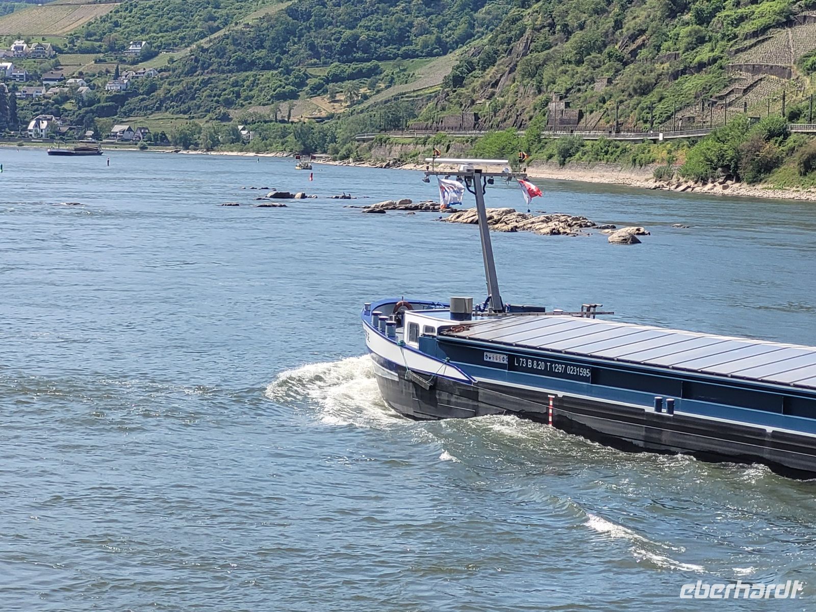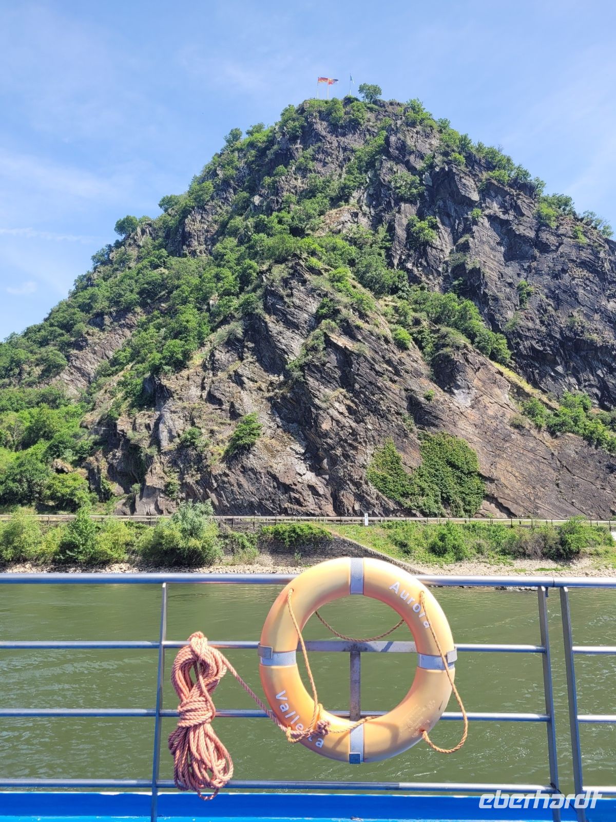 Während des Frühstückes fahren wir das legendäre Mittelrheintal entlang. Ab Kilometer 529 tritt der Fluss ins Rheinische Schiefergebirge ein. Eine wunderschöne Naturlandschaft mit Weinhängen, gespickt mit Burgen bietet sich den Betrachtern. Linker Hand das Bingener Loch (250m breit) mit dem Mäuseturm (Zollturm) und der bekannten Sage des geldgierigen Geschäftsmannes der Mensch und Tier hungern lies um seinen Reichtum zu mehren und als Lohn von den Mäusen im Turm gefressen wurde. Rechter Hand die weltberühmte Drosselgasse mit den vielen Weinstuben. Hoch oben thront die Germania (12m) zur Erinnerung an die Einigung des Deutschen Reiches 1871. Bis zur Vereinigung von Rhein und Mosel begegnen uns noch viele Sehenswürdigkeiten, wie Burg Ehrenfels, Burg Reichenstein, Pfalz, Burg Maus, Schloß Liebeneck, Boppard, Fürstenberg, Schönburg, 7 Jungfrauen, Burg Gudenfels, Loreley (km 555), Burg Rheinfels, Burg Katz, Stolzenfels, Lahnstein etc.