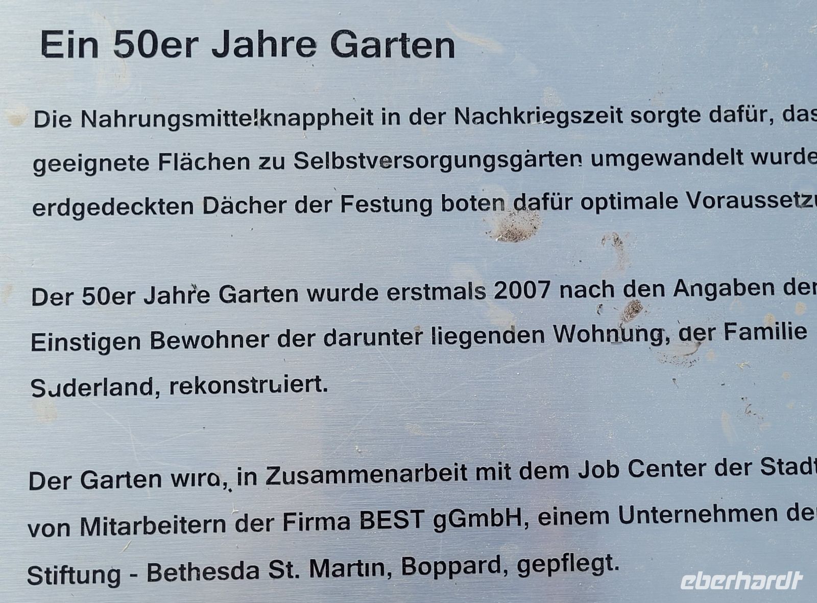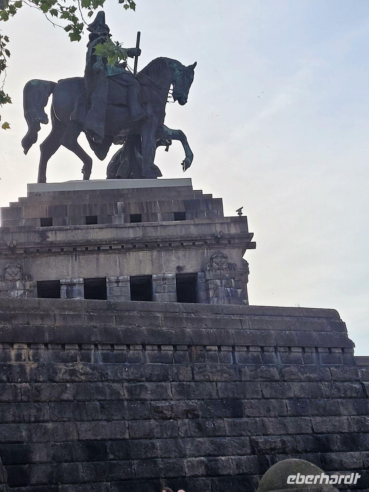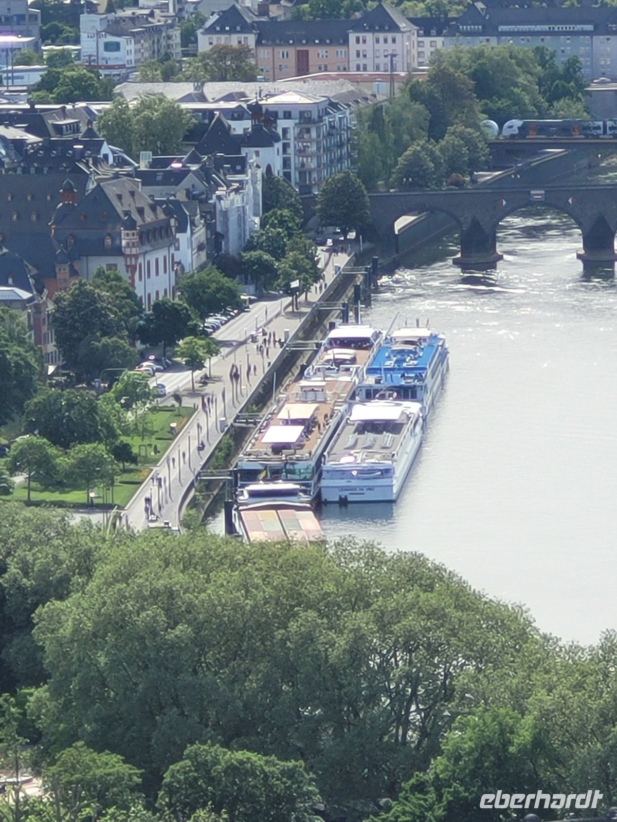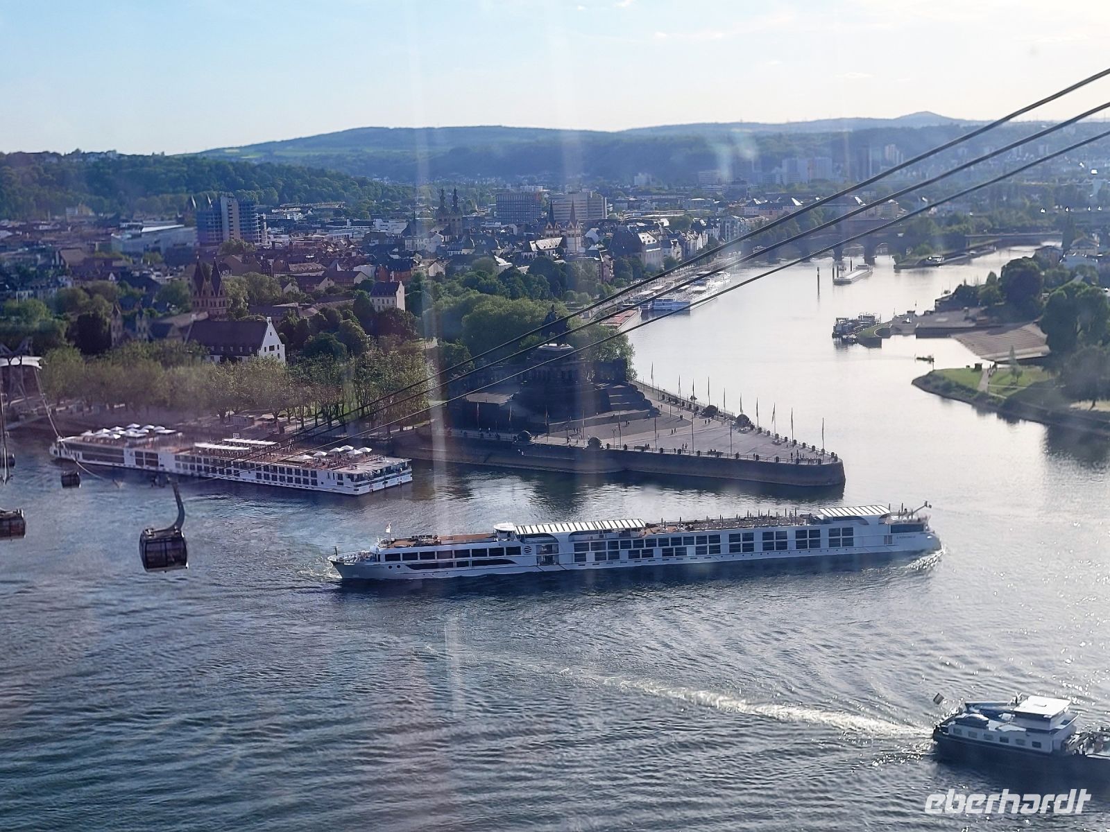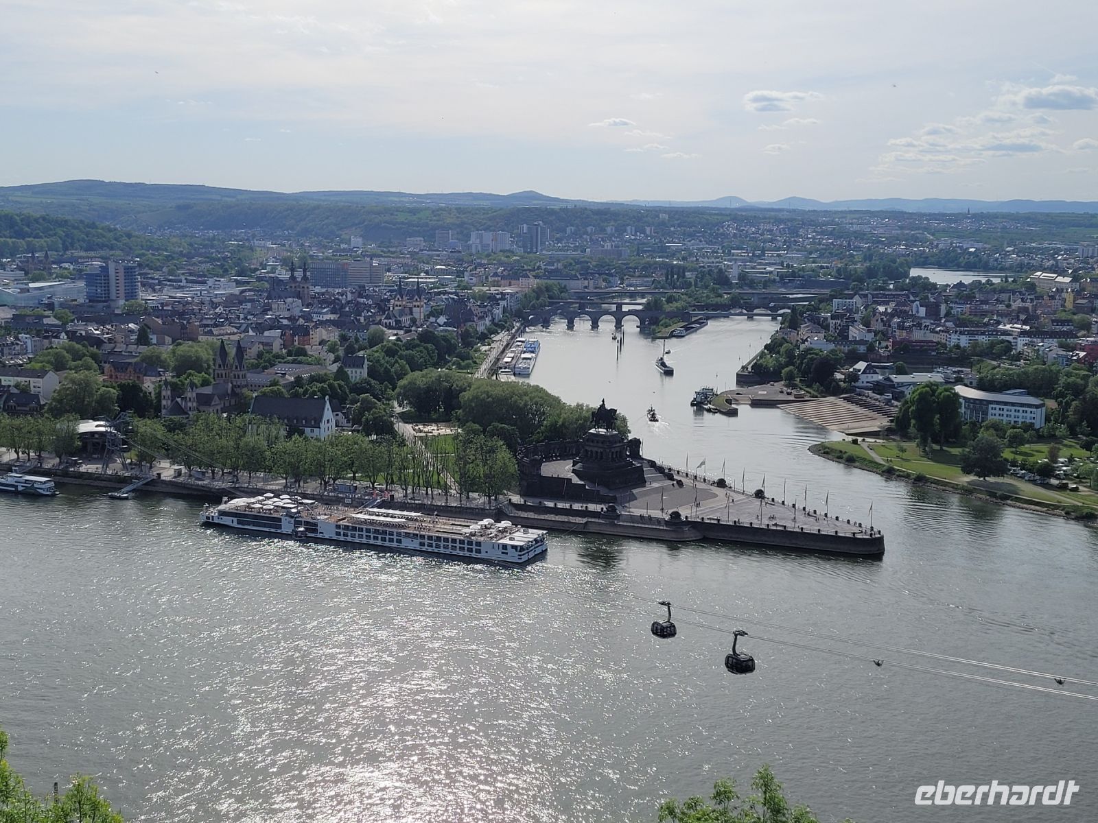 Das nördliche Tor des Oberen Mittelrheins Koblenz, Wahrzeichen die Festung Ehrenbreitstein, erreichen wir gegen Mittag. Hier begegnet die Mosel Ihren Bruder Rhein. Im 13. Jahrhundertgehörte diese Spitze einem deutschen Ritterorden und nannte sich seither das Deutsche Eck. 1897 entstand zu Ehren des Kaisers das Reiterstandbild. Heute gibt es um das Eck eine 3,5 km lange Uferpromenade und seit der Bundesgartenschau 2011 eine Seilbahn über den Fluss, hoch hinauf. Ab der Basilika St. Kastor zur Festung und überwindet 112 Höhenmeter.