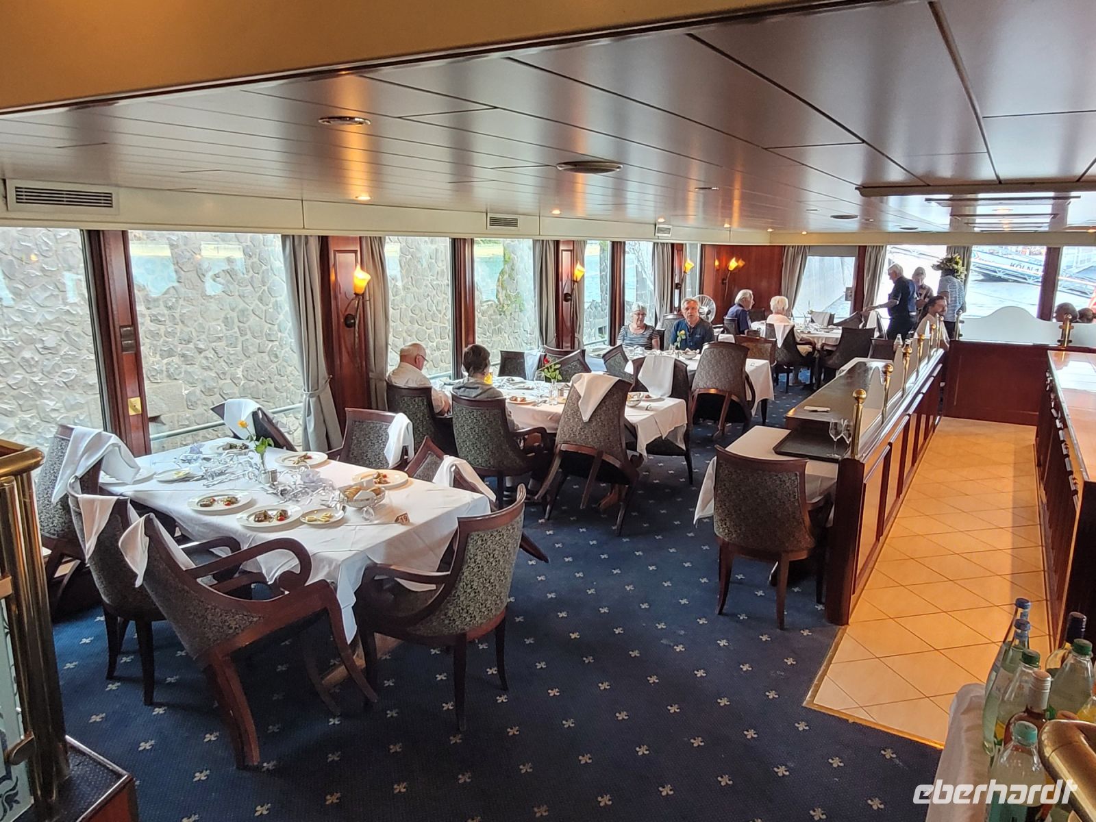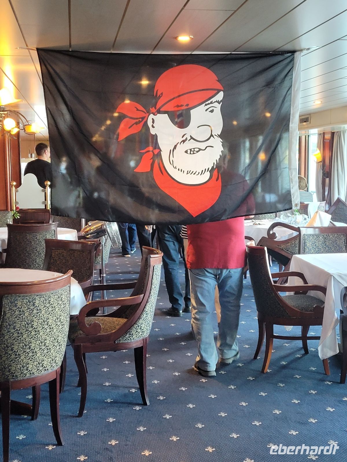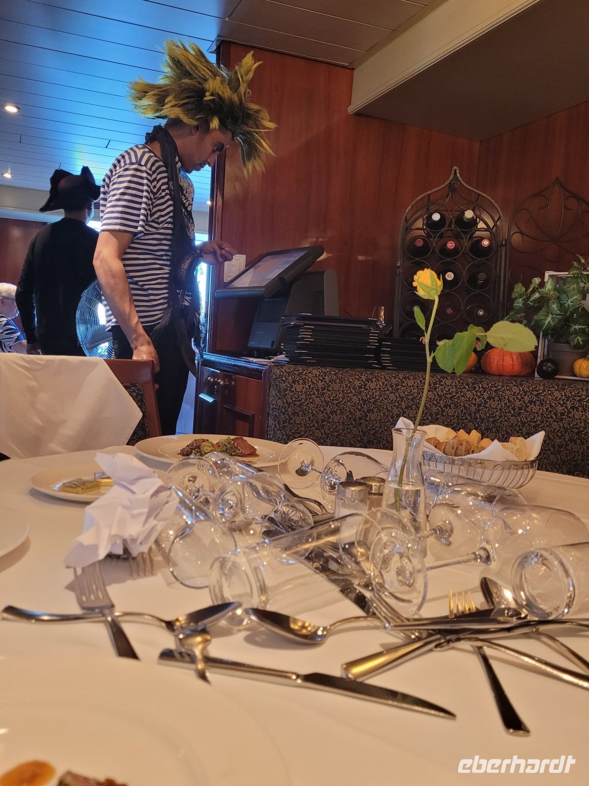 An Bord erfreute uns die Crew mit einem lustigen Piratenschmaus. Liebevoll war das Restaurant dekoriert, Stühle waren umgekippt, Gläser und Besteck lagen wild auf dem Tisch und die Mannschaft hatte sich verkleidet. Lustige Streiche, auch von Seiten der Gäste, machten das Dinner zu einem lustigen Event.