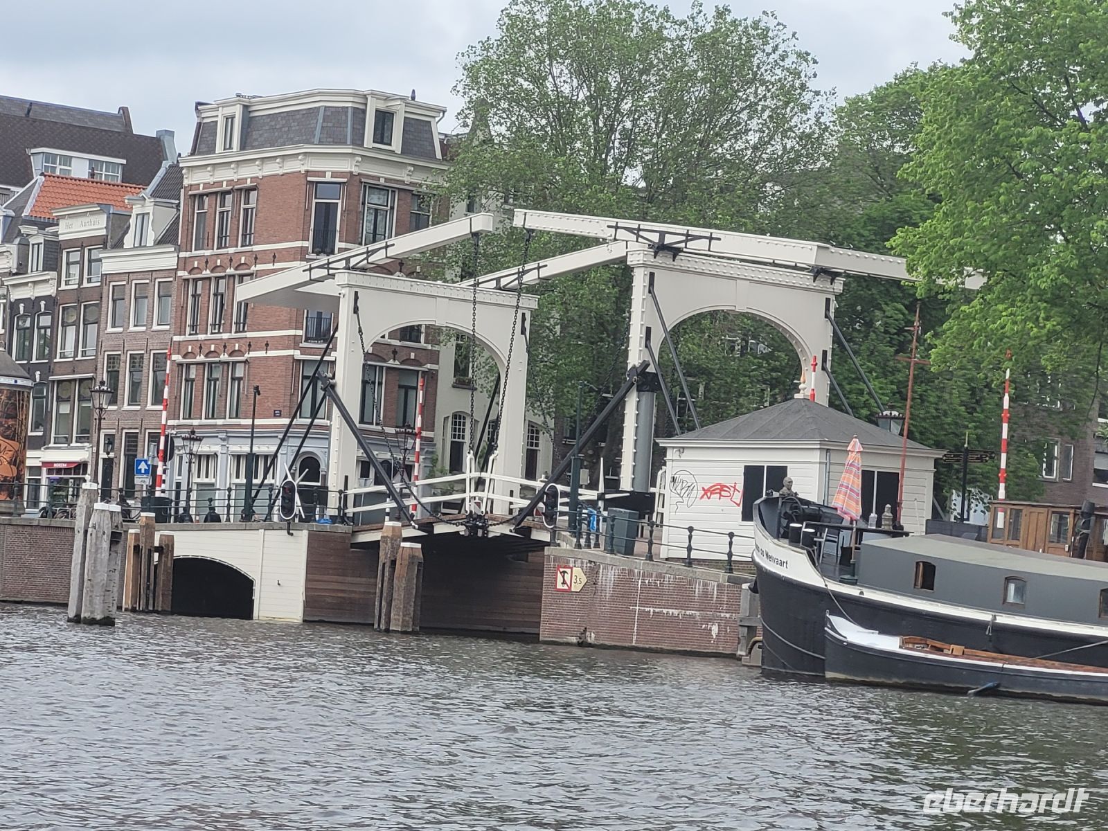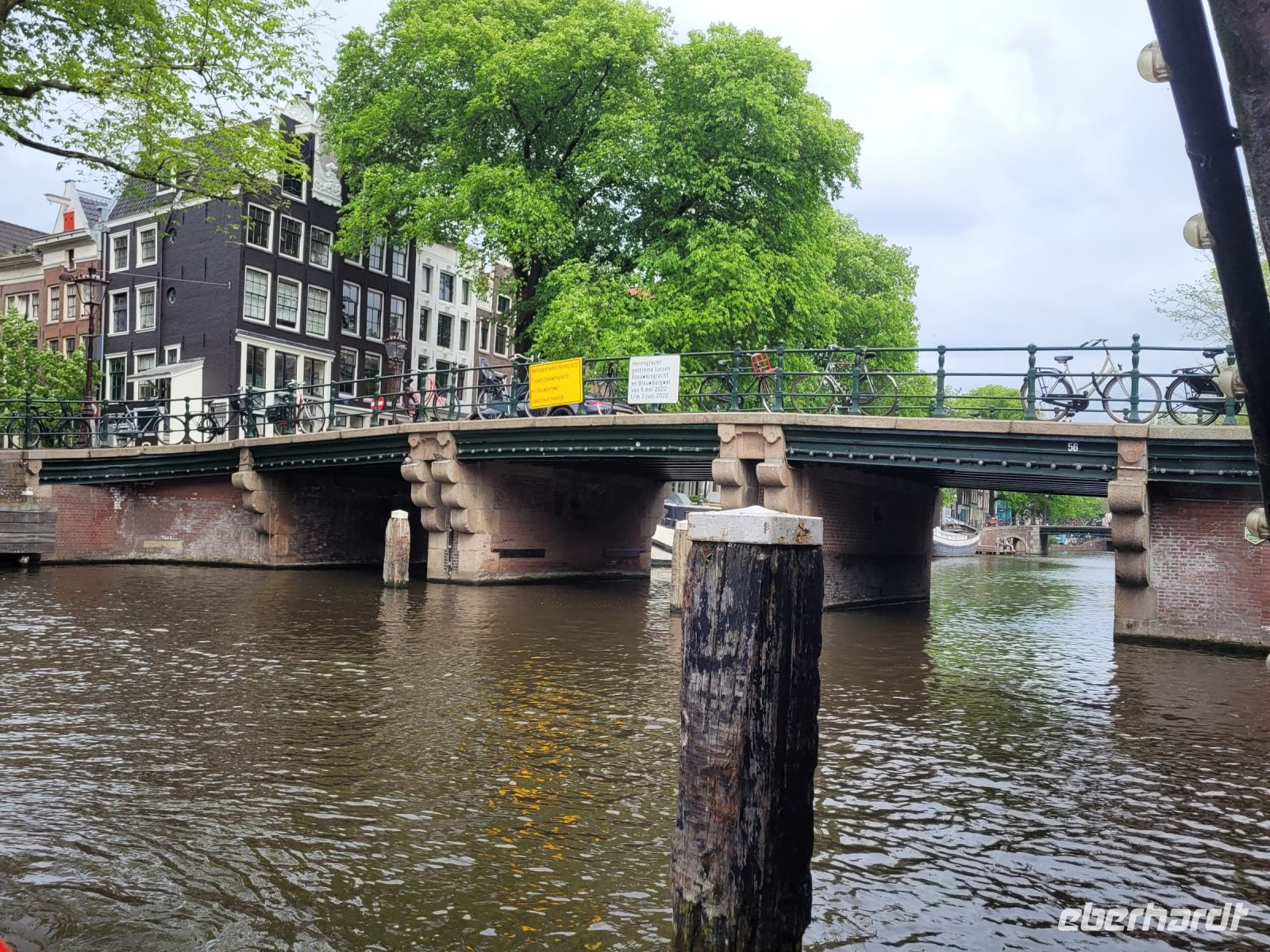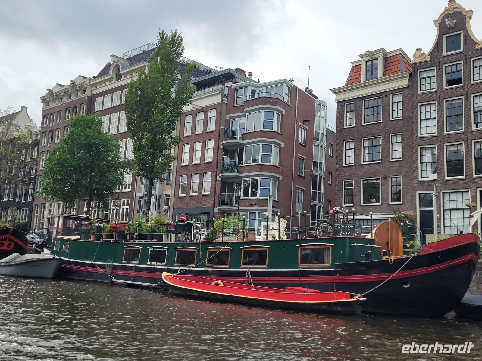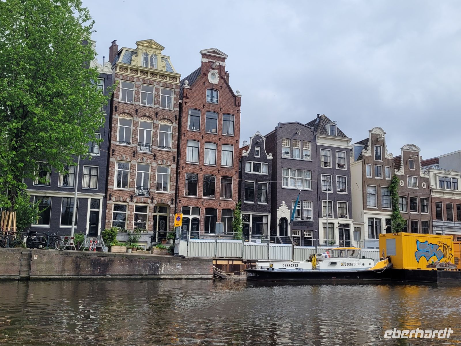 Krönender Abschluss unseres Ausfluges war die Grachtentour. Durch das Oosterdok am Nemo vorbei - technisches Museum in Form eines Walfischs, weiter in die Oudeschans - vorbei am Montelban-Turm, mit Blick in die Nieuwe Amstel biegen wir etwa nach 270° um die Altstadt in eine innere Gracht um dann entgegen dem Uhrzeigersinn weiterzufahren. Viele Quergrachten mit unzähligen Brücken sehen wir bei unserer Fahrt, sowie zahlreiche der Prachthäuser in der Heren-, Prinsen- und Kaizersgracht und zum Abschluss ein Museumsschiff, einen Nachbau des V.O.C.
