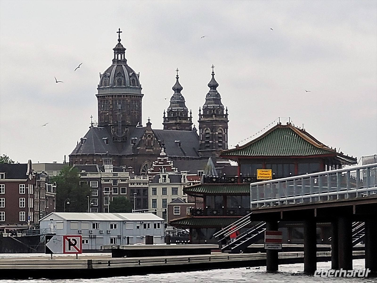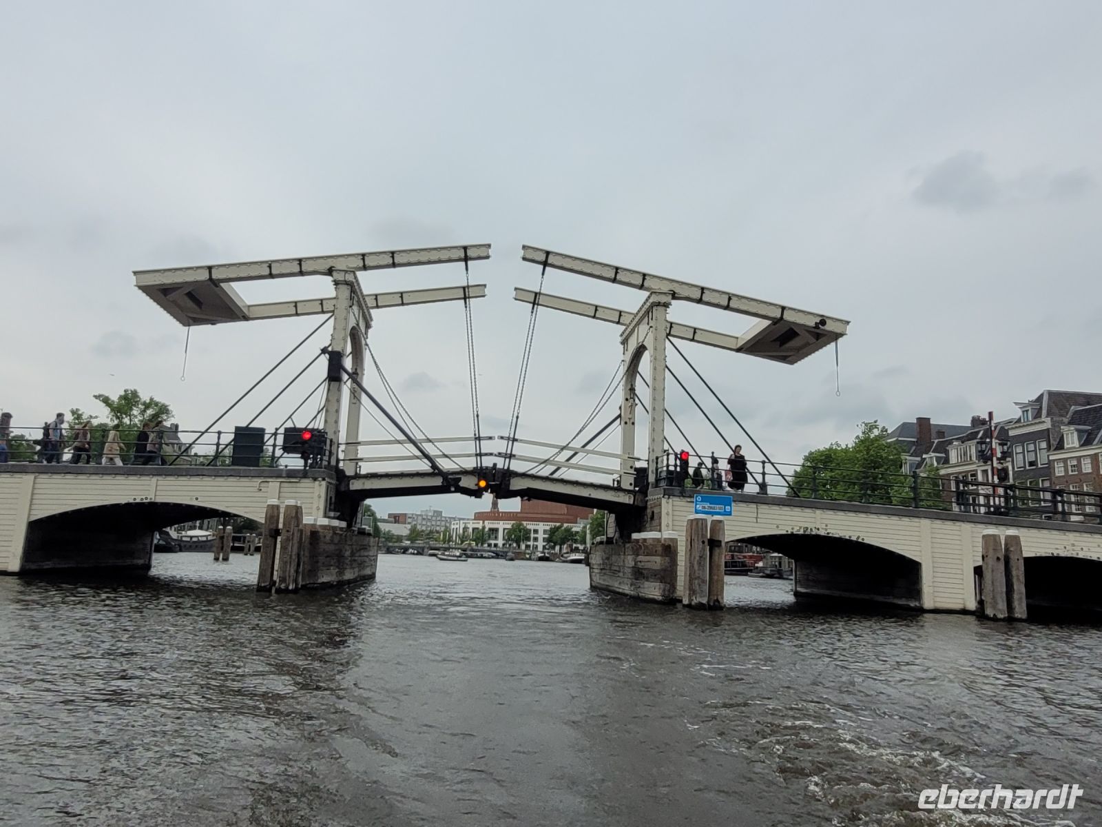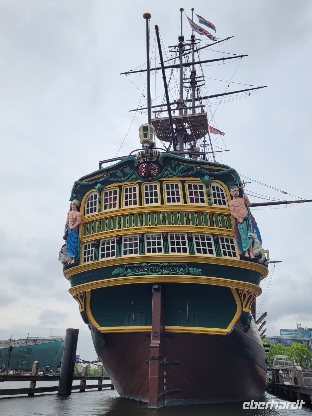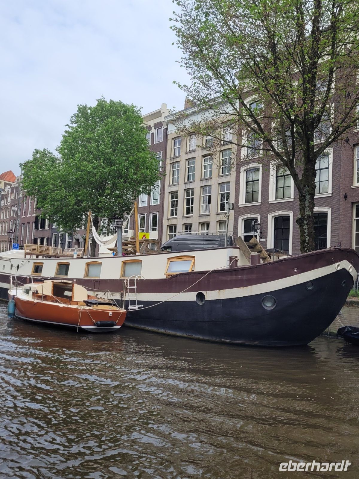 Krönender Abschluss unseres Ausfluges war die Grachtentour. Durch das Oosterdok am Nemo vorbei - technisches Museum in Form eines Walfischs, weiter in die Oudeschans - vorbei am Montelban-Turm, mit Blick in die Nieuwe Amstel biegen wir etwa nach 270° um die Altstadt in eine innere Gracht um dann entgegen dem Uhrzeigersinn weiterzufahren. Viele Quergrachten mit unzähligen Brücken sehen wir bei unserer Fahrt, sowie zahlreiche der Prachthäuser in der Heren-, Prinsen- und Kaizersgracht und zum Abschluss ein Museumsschiff, einen Nachbau des V.O.C.
