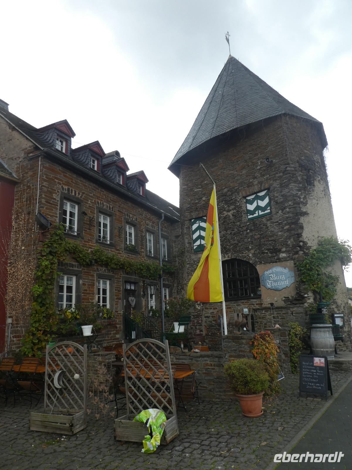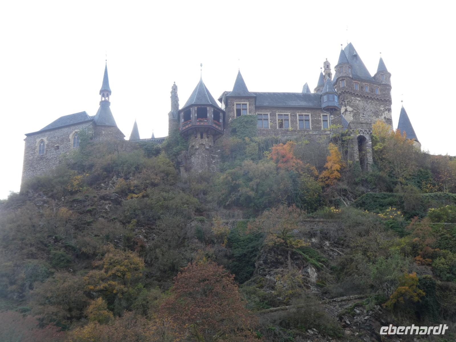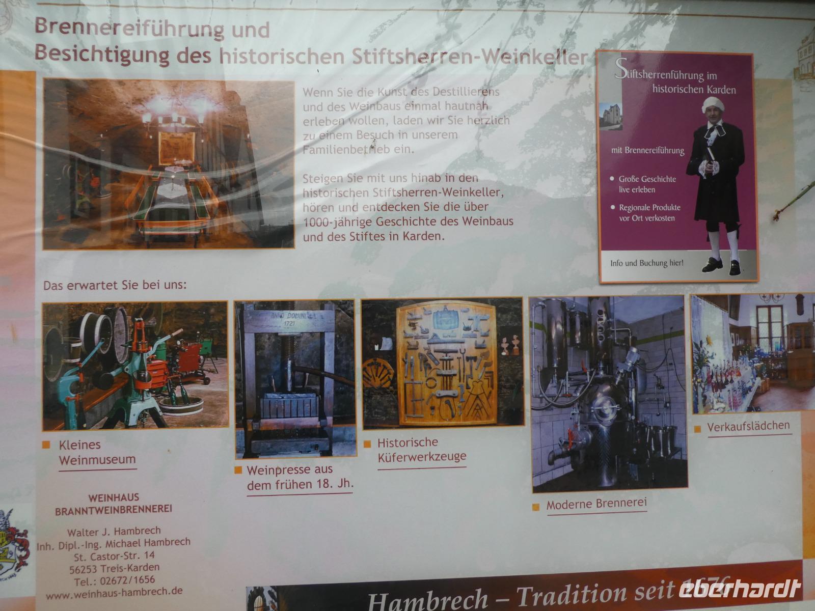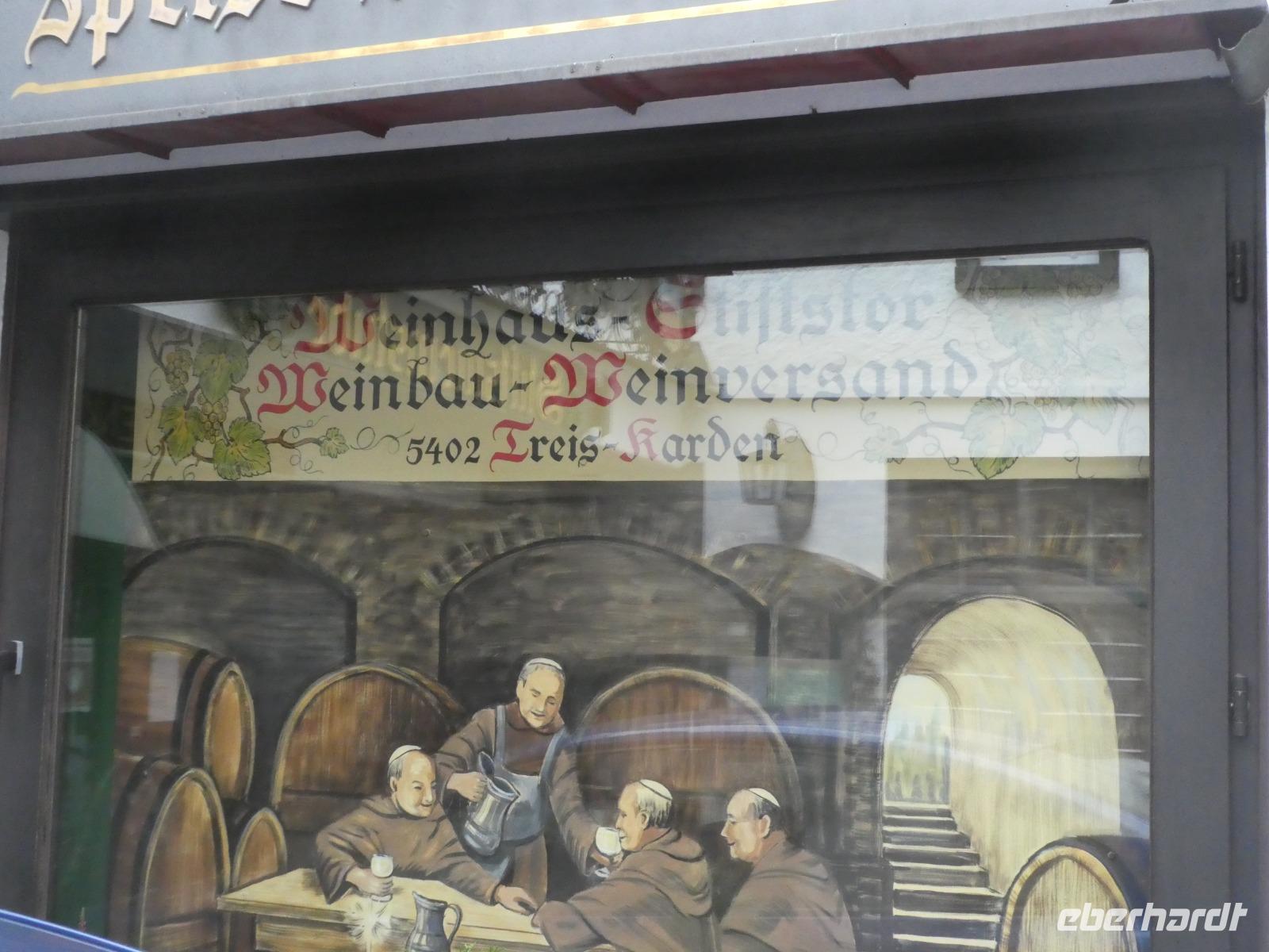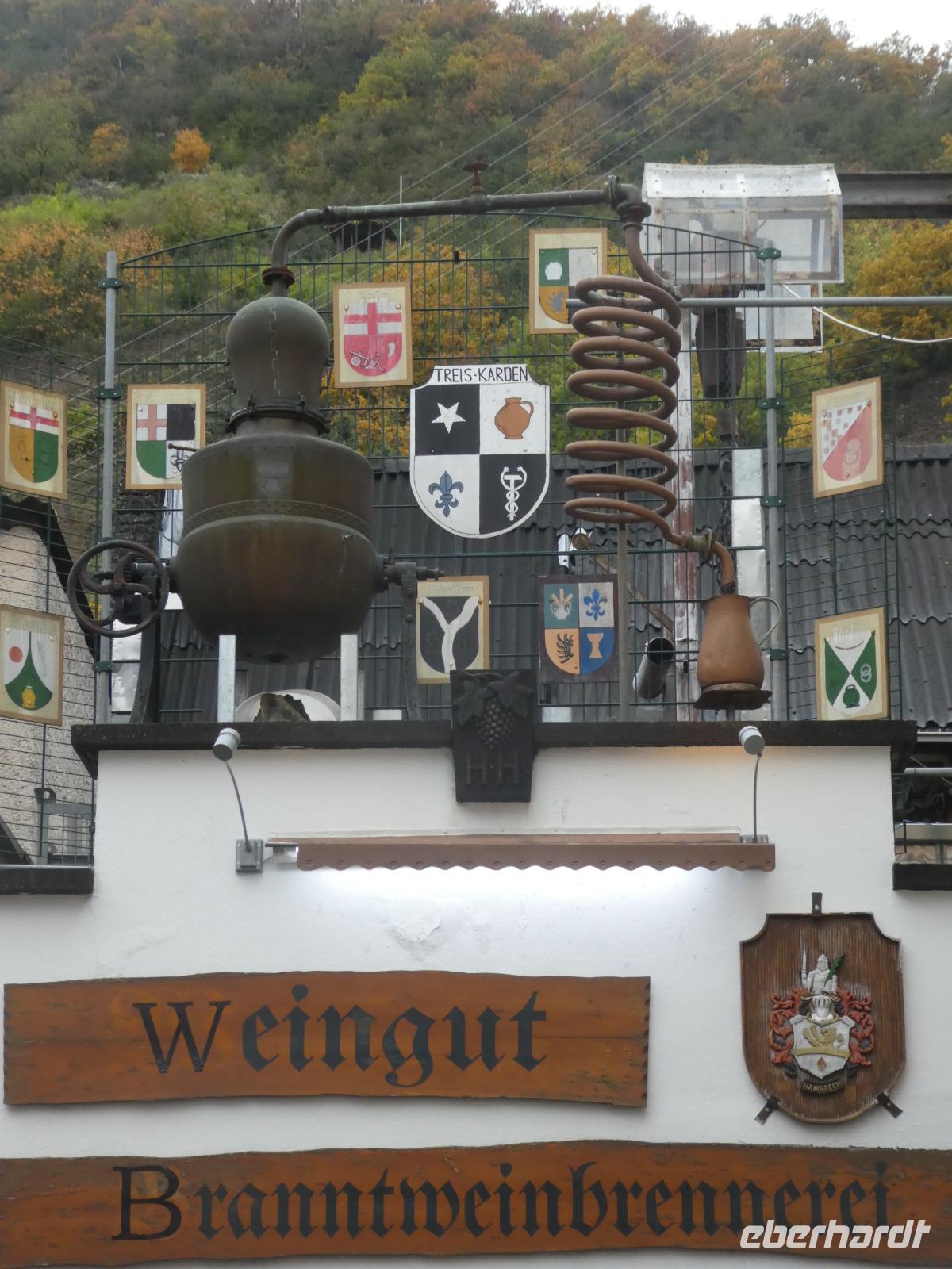 Am Vormittag konnte der Ort Alken oder Treist-Karden individuell entdeckt werden. Eine weitere Option war mit dem Stiftsheeren durch den Stiftsherrenbezirk von Treis- Karden zu spazieren. Der Stiftsheer persönlich in seinem historischen Gewand zeigte seinen Ort und erzählte interessante Geschichten. Im Weinhaus Hambrecht wurden wir schon mit einem Glas Moselwein erwartet und tauchten ein in die Kunst des Schnapsbrennen. Neben dem Weinanbau gedeiht besonders der Rote Weinbergpfirsich sehr gut. Daraus entsteht eine Likörspezialität. Davon konnten wir uns im gemütlichen Weinkeller überzeugen. Viele weitere Liköre und Schnäpse konnten probiert werden. Noch ein Blick auf die Burg Thurant und schon hieß es wieder Leinen los. Auf dem Weg nach Bernkastel fuhr unser Schiff am bekannten Ort Cochem vorbei. Oberhalb der Stadt befindet sich eine der besterhaltenen Burgen der Mosel die Reichsburg. Sehenswert war auch der 380 Meter hohe Bremmer Calmont mit 68 Grad, der steilste Weinberg Europas.