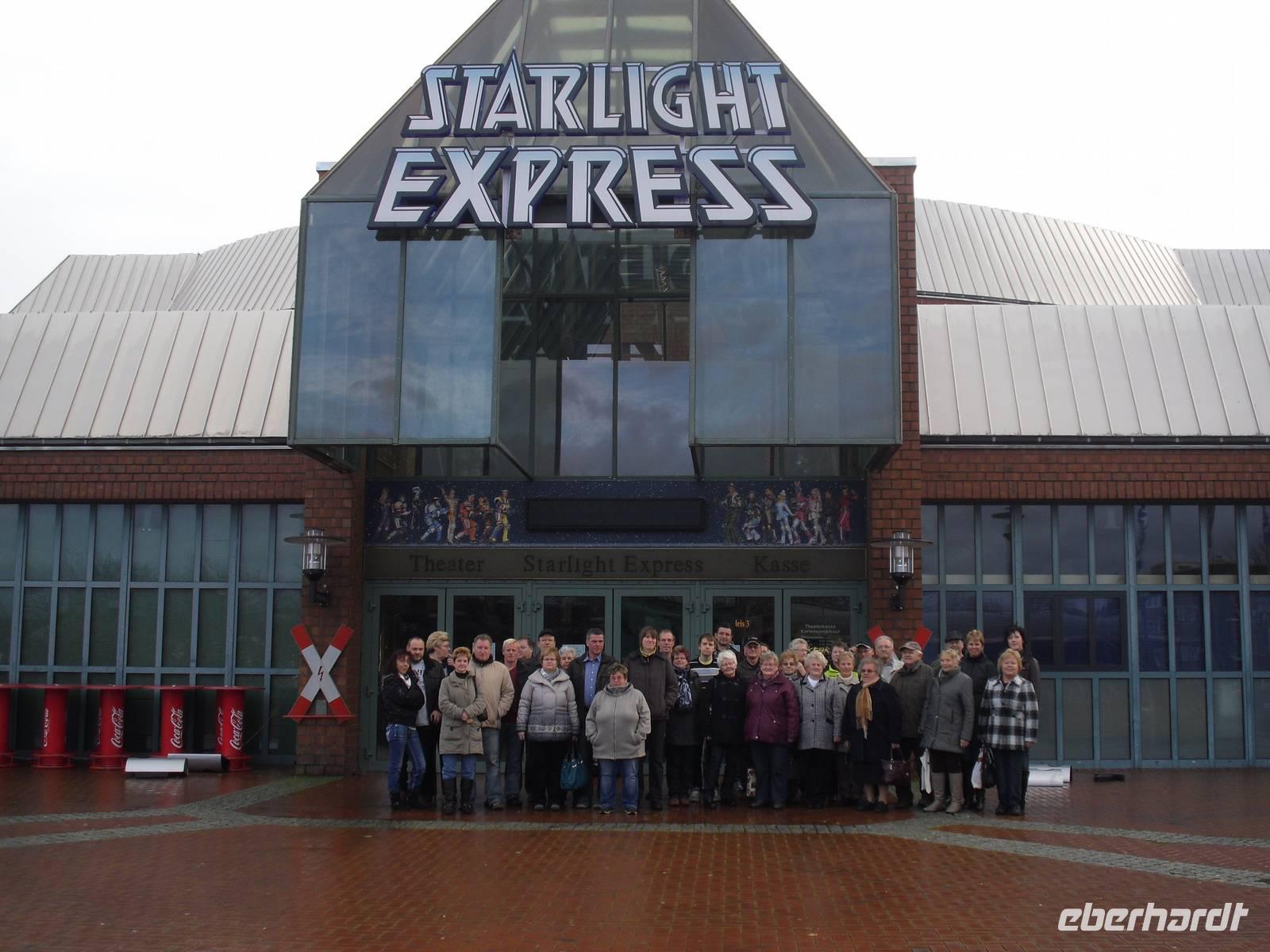 Nachdem unsere Gruppe mit insgesamt 35 Gästen komplett war, führte uns unsere Route über Eisenach und Kassel nach Bochum. Am frühen Nachmittag bezogen wir unsere Zimmer im 4-Sterne-Hotel „RAMADA" in Bochum. Komfortabel ausgestattete Zimmer sorgen hier für beste Wohlfühlatmosphäre. Am Nachmittag blieb uns noch etwas Zeit, um die Innenstadt von Bochum zu erkunden - wir konnten hier sogar schon über den Weihnachtsmarkt flanieren! Natürlich waren wir rechtzeitig aus der Stadt zurück, um uns auf den Abend vorzubereiten. Dank der unmittelbaren Nähe unseres Hotels zum Starlight-Express-Theater ging am Abend jeder Gast individuell zum eigentlichen „Highlight" dieser 2-Tages-Reise - der Musical-Veranstaltung „STARLIGHT -EXPRESS". Das Stück erzählt den Traum eines Kindes von der Weltmeisterschaft der internationalen Züge. Im Mittelpunkt steht die kleine, liebenswerte, aber eigentlich veraltete Dampflock Rusty und ihr Kampf gegen die eigentlich übermächtigen Gegner in Form der hypermodernen E-Lok Elektra und der mächtigen Diesellok Greaseball. Hierbei spielt insbesondere die Liebe zum 1.-Klasse-Waggon Pearl eine besondere Rolle. Denn als diese vor die Entscheidung gestellt wird, mit wem sie die Rennen bestreiten soll, mit Rusty oder Elektra, weiß sie nicht für wen sie sich entscheiden soll. Am Ende gewinnt Rusty sowohl das Rennen als auch Pearl für sich.