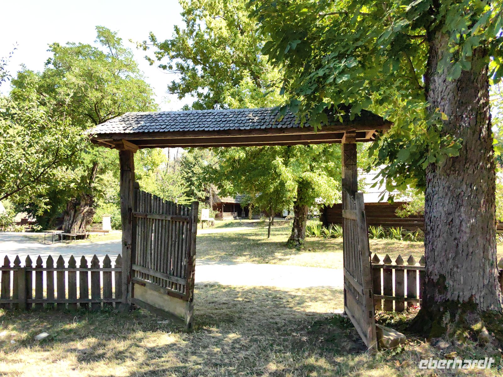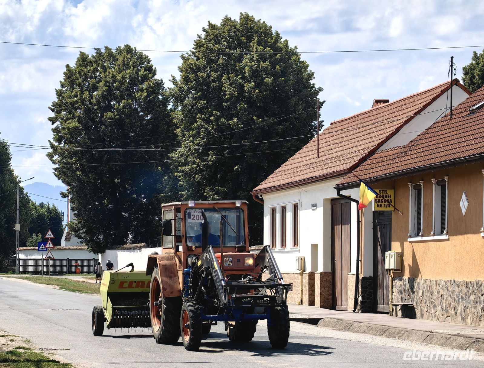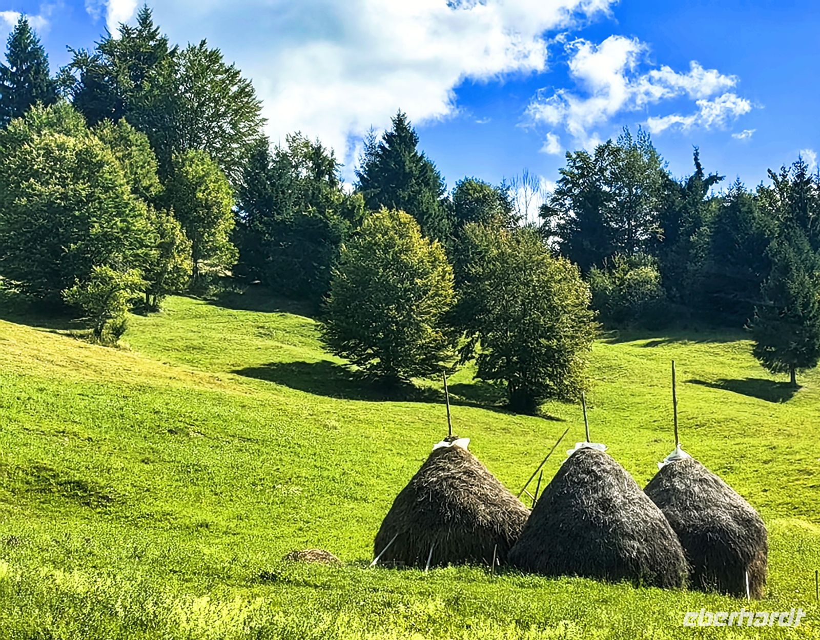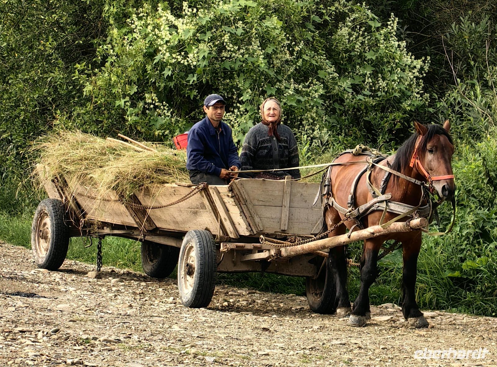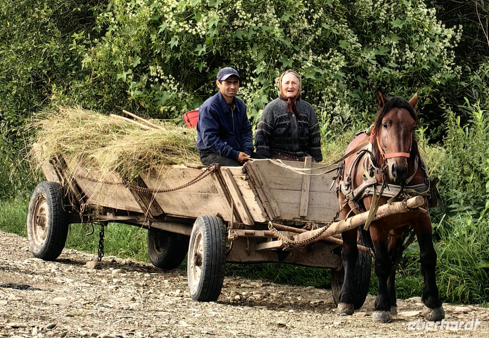 Nun ist es schon früher Nachmittag und leichter Hunger kommt auf. Auf der Strecke liegen keine großen Städte mit vielfältigem gastronomischem Angebot und Petru, unser Reiseleiter, beschließt, mit uns in eine der zünftigen Dorfkneipen zu gehen. Wir sitzen also mitten im kleinen rumänischen Dorf, bewundern die schöne Aussicht, nebenan weiden die Kühe, die Pferdewagen ziehen vorbei, die Bauern auf den Feldern schichten Heu auf Spieße, so daß wohl geformte Kegel entstehen. Wir laben uns an leckeren traditionellen Suppen, selbst gebackenem Brot, Pilzspeisen und Schnitzel.