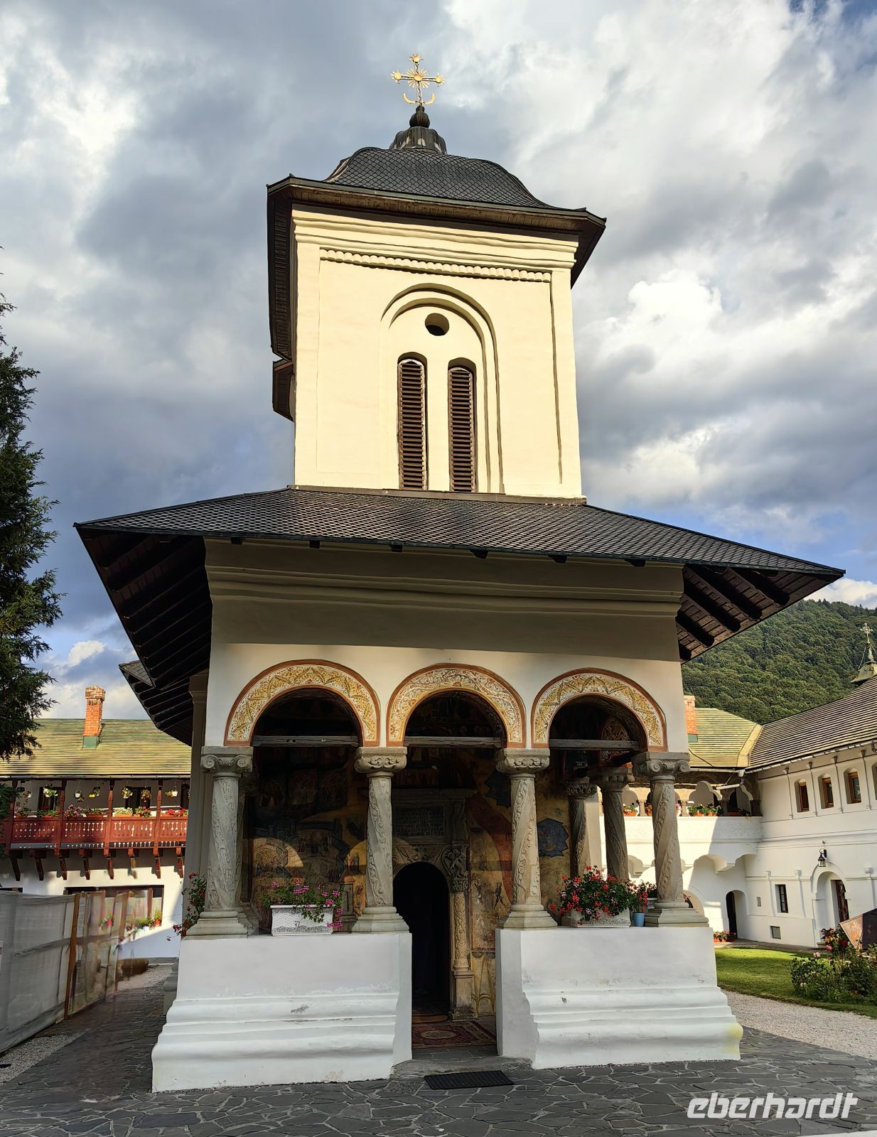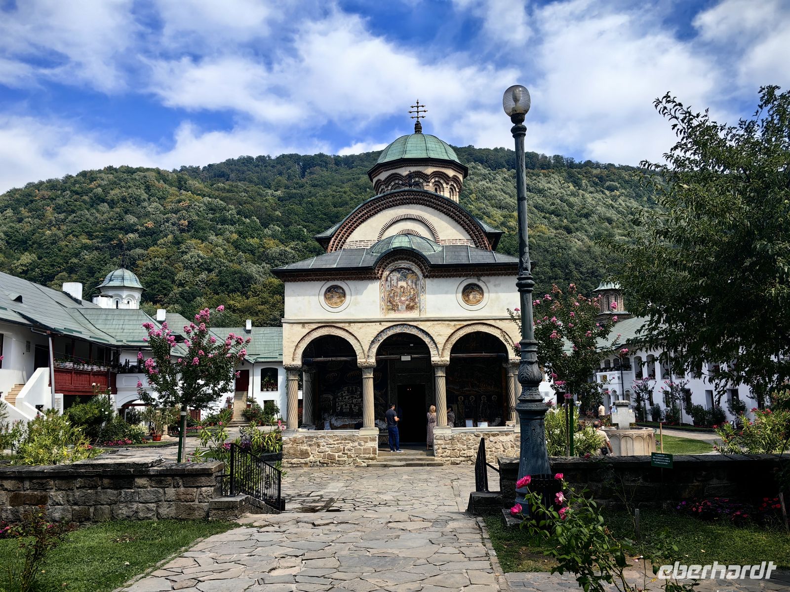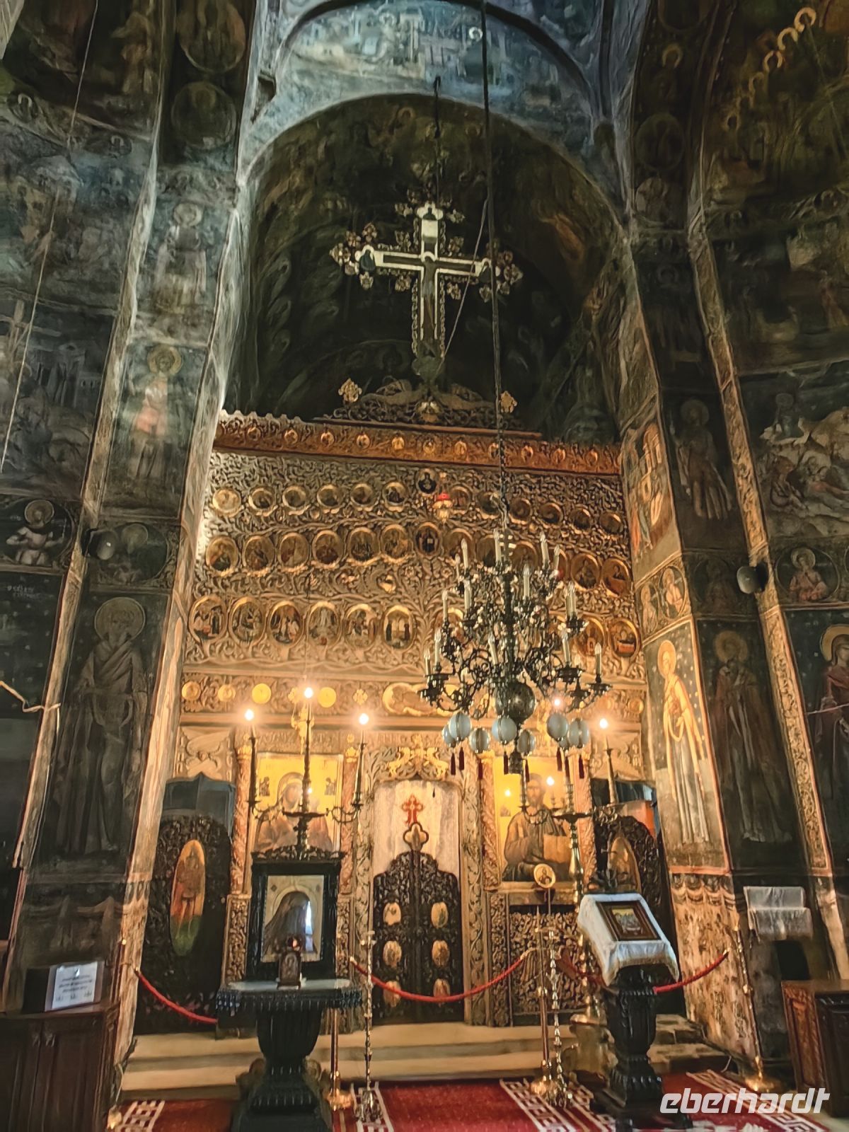 Unser nächstes Ziel ist das Kloster Cozia, welches 24 Kilometer von der Stadt Ramnicu Valcea am Fluß Olt liegt. Es ist eines der ältesten Klöster Rumäniens und macht einen sehr gepflegten Eindruck auf uns. Auf Anraten des Mönchs Nicodem Tismana, des späteren Beraters des Woiwoden, förderte Mircea I. von der Walachei zwischen den Jahren 1386 und 1388 den Bau dieses Klosters und nach seinem Tod ruht sein Leichnam im Mausoleum des Klosters. Es diente vor allem dazu, das Gebiet zu verwalten, die theologische Kultur zu bewahren und dazu, das Territorium zu kontrollieren und im Falle eines Falles zu verteidigen. Die Fresken stammen aus den Jahren um 1390 und sind fantastisch erhalten geblieben. Die Kirche wurde 1517 unter der Herrschaft des Woiwoden Neagoe Basarab und zu Beginn des 18. Jahrhunderts unter dem walachischen Herrscher Constantin Brancoveanu renoviert, wobei die Nartexgalerie vor dem Eingang der Kirche, eine Kapelle, Brunnen und der Uhrenturm hinzugefügt wurden. Wir sehen die Bildnisse beider Fürsten an den Wänden des Klosters, als wir uns umschauen.