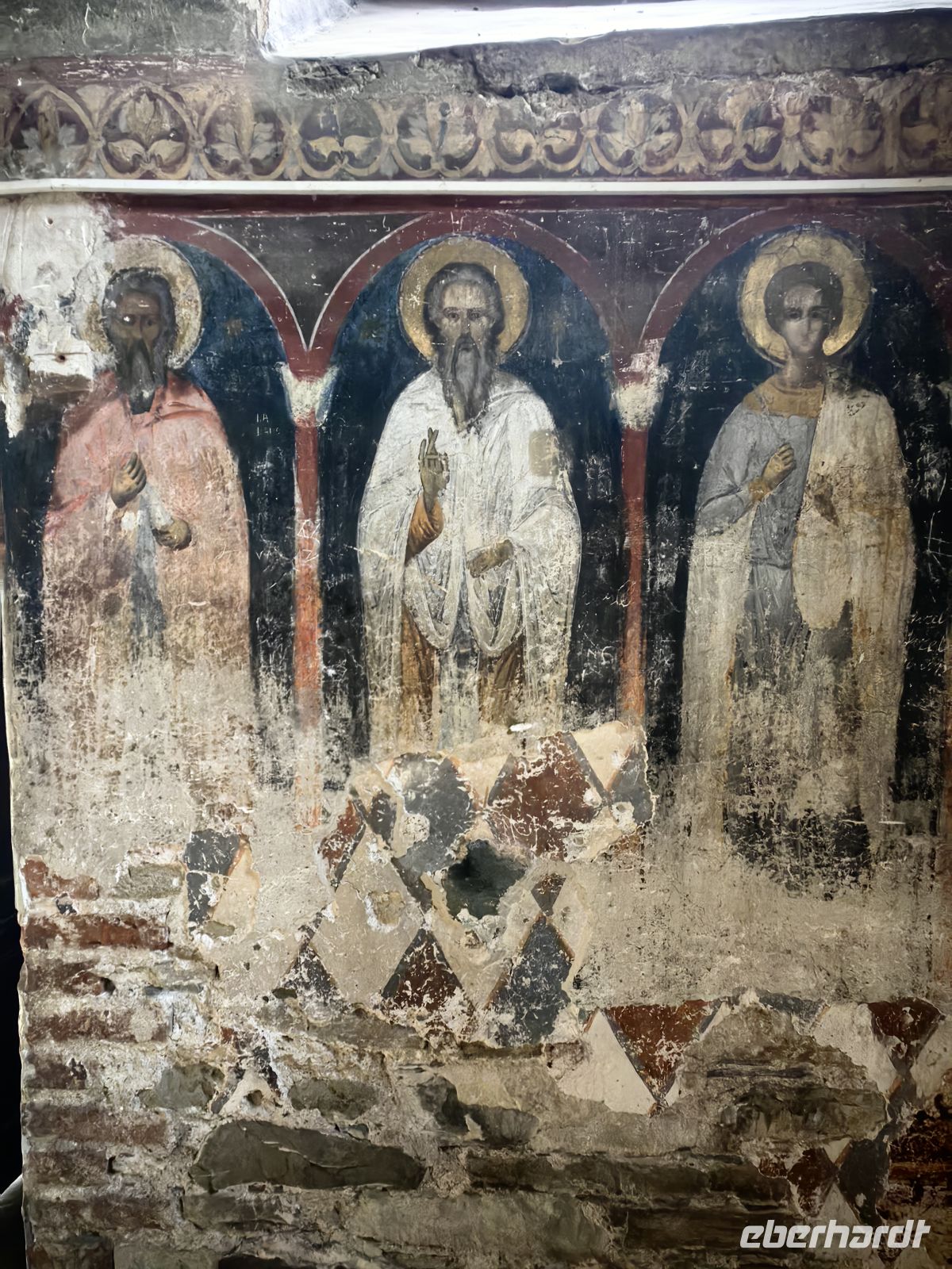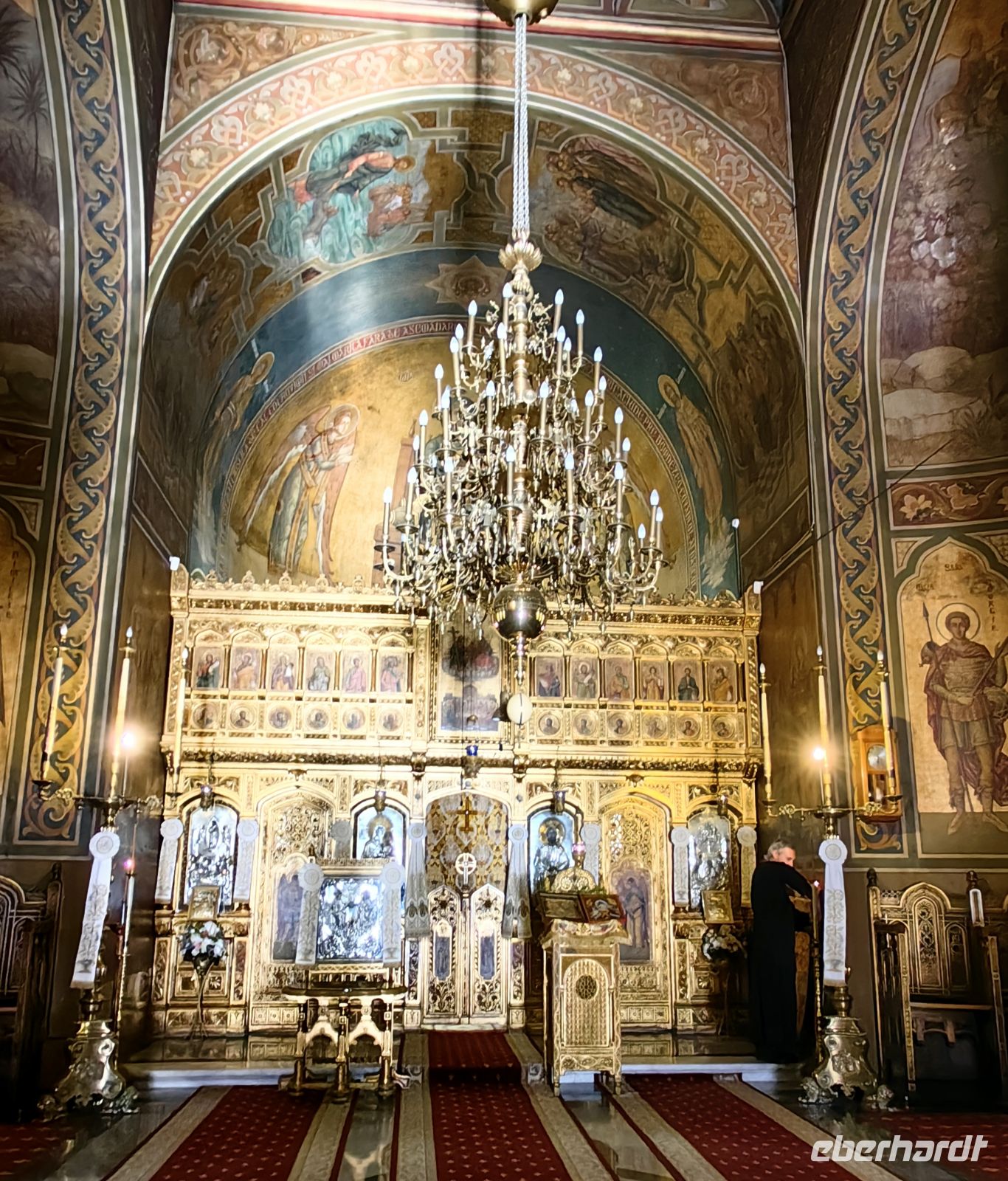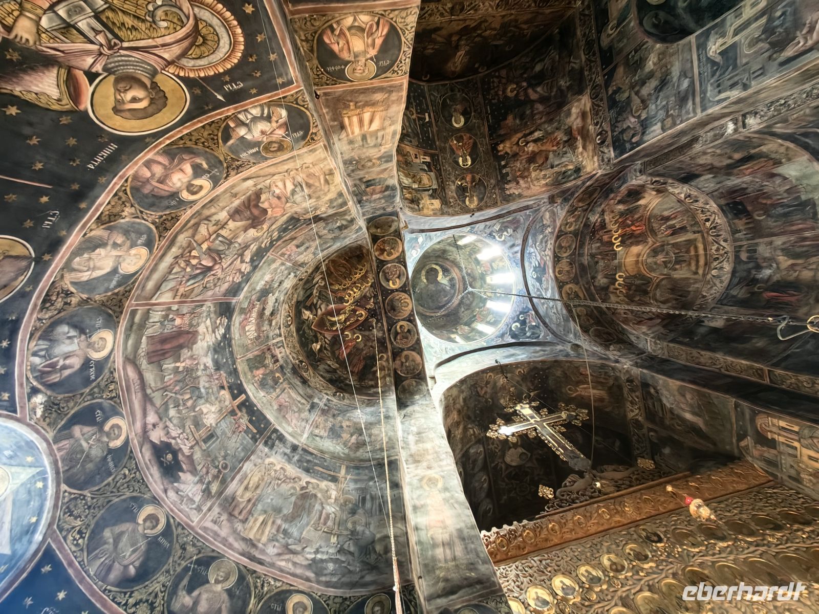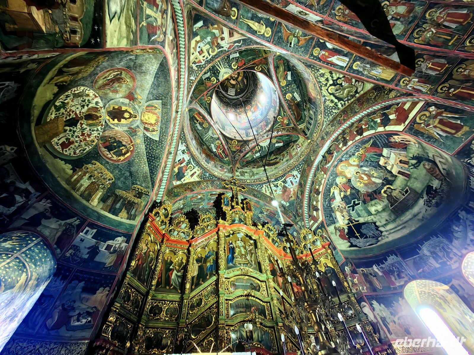 Unser nächstes Ziel ist das Kloster Cozia, welches 24 Kilometer von der Stadt Ramnicu Valcea am Fluß Olt liegt. Es ist eines der ältesten Klöster Rumäniens und macht einen sehr gepflegten Eindruck auf uns. Auf Anraten des Mönchs Nicodem Tismana, des späteren Beraters des Woiwoden, förderte Mircea I. von der Walachei zwischen den Jahren 1386 und 1388 den Bau dieses Klosters und nach seinem Tod ruht sein Leichnam im Mausoleum des Klosters. Es diente vor allem dazu, das Gebiet zu verwalten, die theologische Kultur zu bewahren und dazu, das Territorium zu kontrollieren und im Falle eines Falles zu verteidigen. Die Fresken stammen aus den Jahren um 1390 und sind fantastisch erhalten geblieben. Die Kirche wurde 1517 unter der Herrschaft des Woiwoden Neagoe Basarab und zu Beginn des 18. Jahrhunderts unter dem walachischen Herrscher Constantin Brancoveanu renoviert, wobei die Nartexgalerie vor dem Eingang der Kirche, eine Kapelle, Brunnen und der Uhrenturm hinzugefügt wurden. Wir sehen die Bildnisse beider Fürsten an den Wänden des Klosters, als wir uns umschauen.