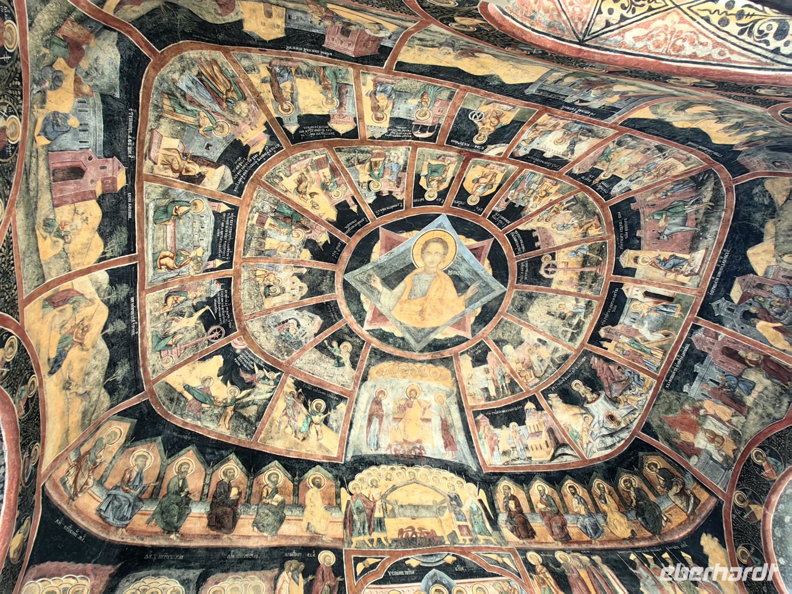 Am Mittag erreichen wir das ebenfalls prächtig bemalte Kloster Moldovita, welches zu den schönsten Moldauklöstern in der Region gehört. Die innerhalb der Mauern befindliche Kirche ist Maria und der Verkündigung geweiht. Die Klosteranlage stammt aus dem Jahre 1532. Innen- und Außenwände sind mit Wandmalereien geschmückt, die das jüngste Gericht darstellen, oder die Belagerung Konstantinopels an der Südfassade. 1993 wurde es zusammen mit weiteren sechs Moldauklöstern zum UNESCO Weltkulturerbe erklärt. Die Anlage ist von einem sehr gepflegten Garten umgeben, man spürt deutlich, daß hier Nonnen leben, die sich sehr um die Kirche und ihre Umgebung kümmern. Eine davon, Tatjana, nimmt sich unserer Gruppe an und erklärt uns ausführlich die Klostergeschichte und frischt unsere in Vergessenheit geratenen Bibelkenntnisse wieder auf.