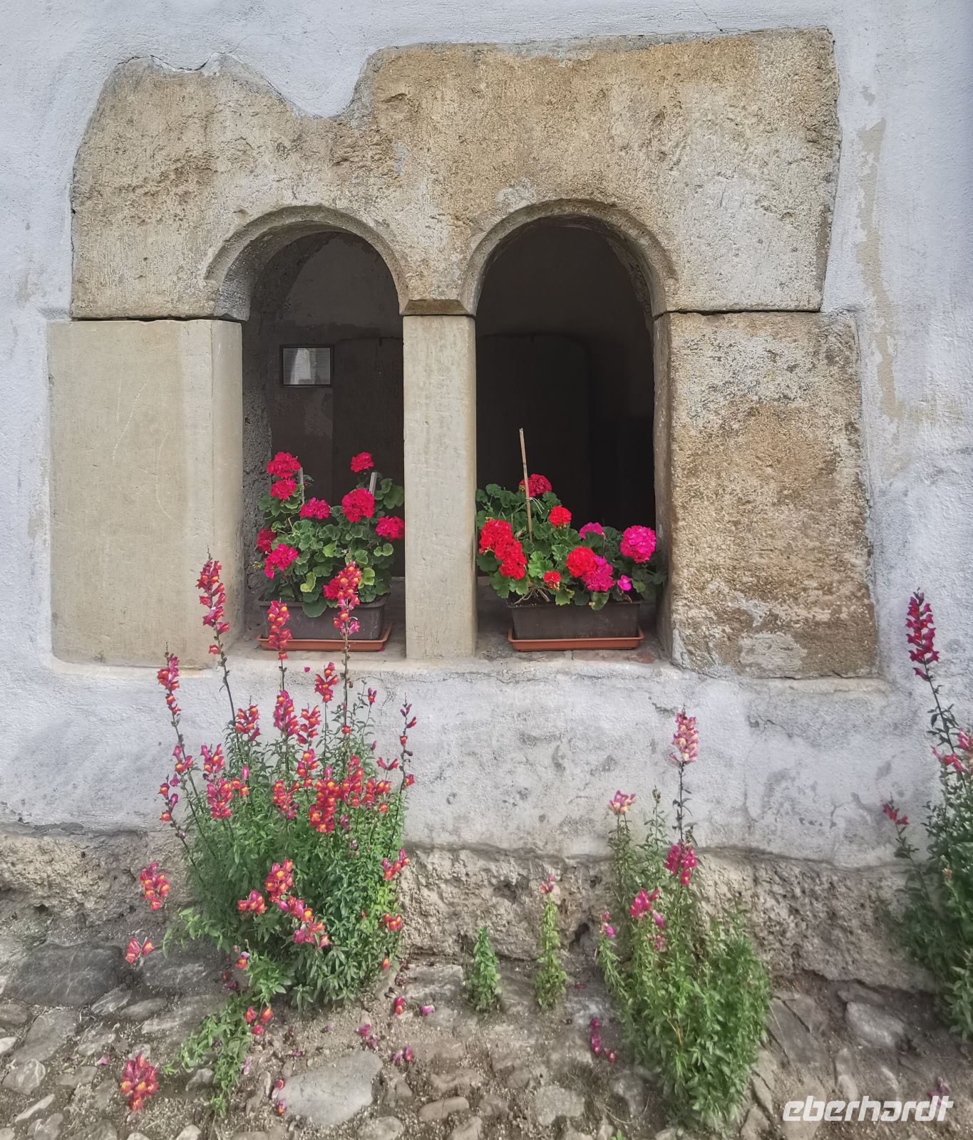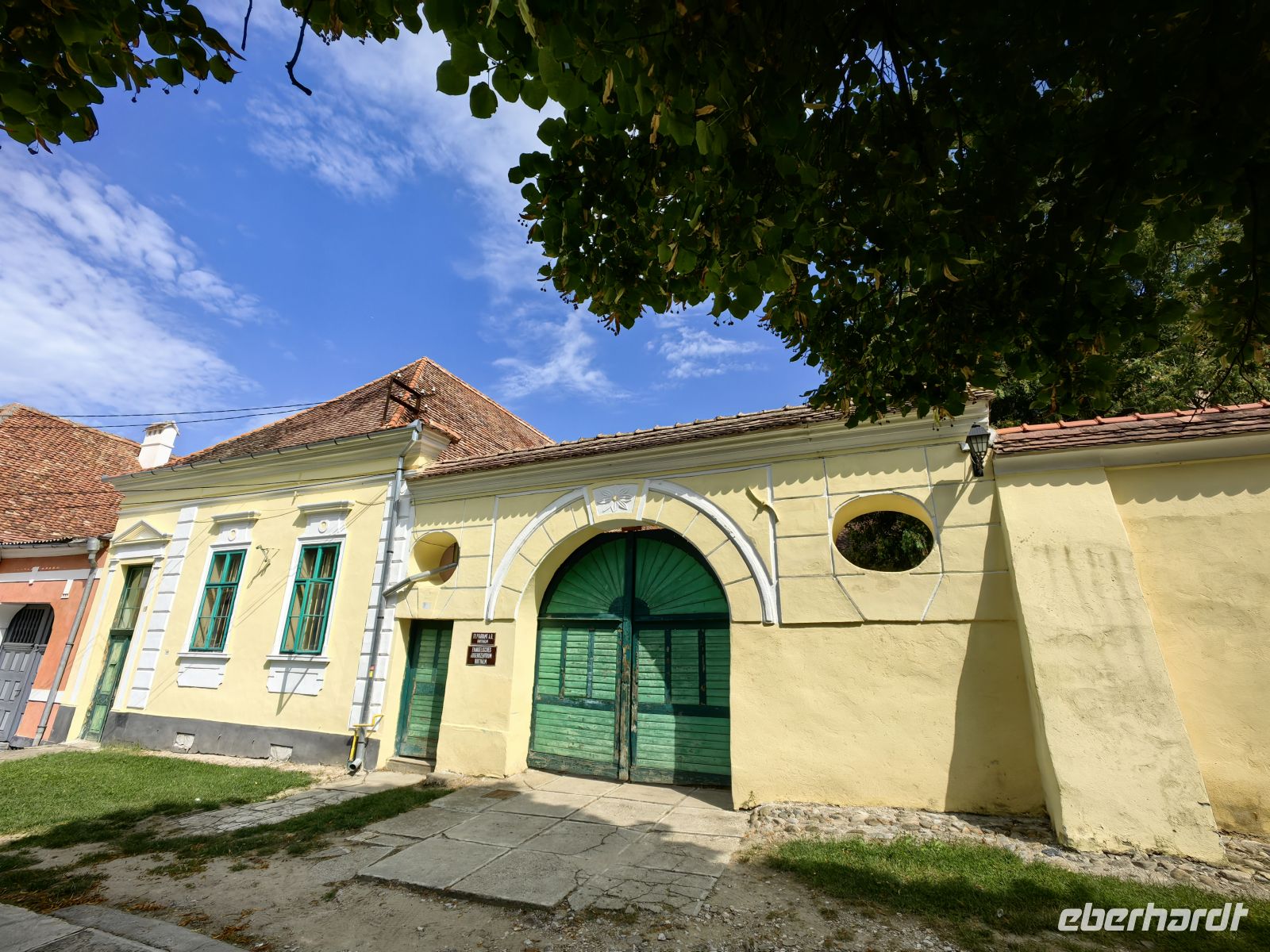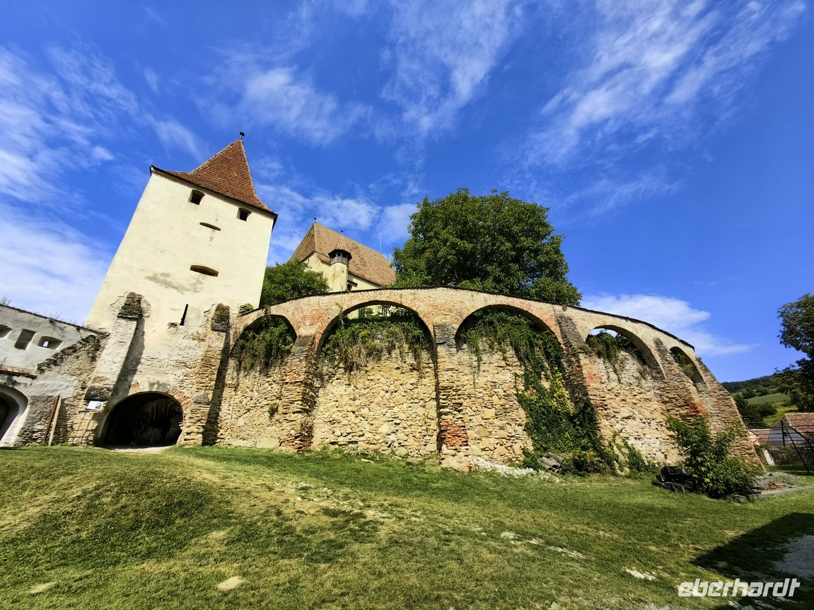 Die Kutsche bringt uns ins benachbarte Boian. Dort schauen wir uns eine recht verfallene Wehrkirche an, deren Gründung aufs 14. Jahrhundert zurück geht. Im Chor gibt es ein Kreuzgewölbe, das Schiff dagegen hat eine flache Decke. Im Obergeschoß des Turms sehen wir einen Wehrgang mit hölzernem Geländer. Über der Einfahrt des Turms und über dem Nordportal befinden sich je ein Wappen mit dem moldauischen Symbol: einem Ochsenkopf mit Stern und Halbmond zwischen den Hörnern. Wir trinken in den alten Mauern einen Rotwein und fahren im Anschluß zurück nach Medias, wo uns das Hotelpersonal bereits mit dem Abendessen erwartet.