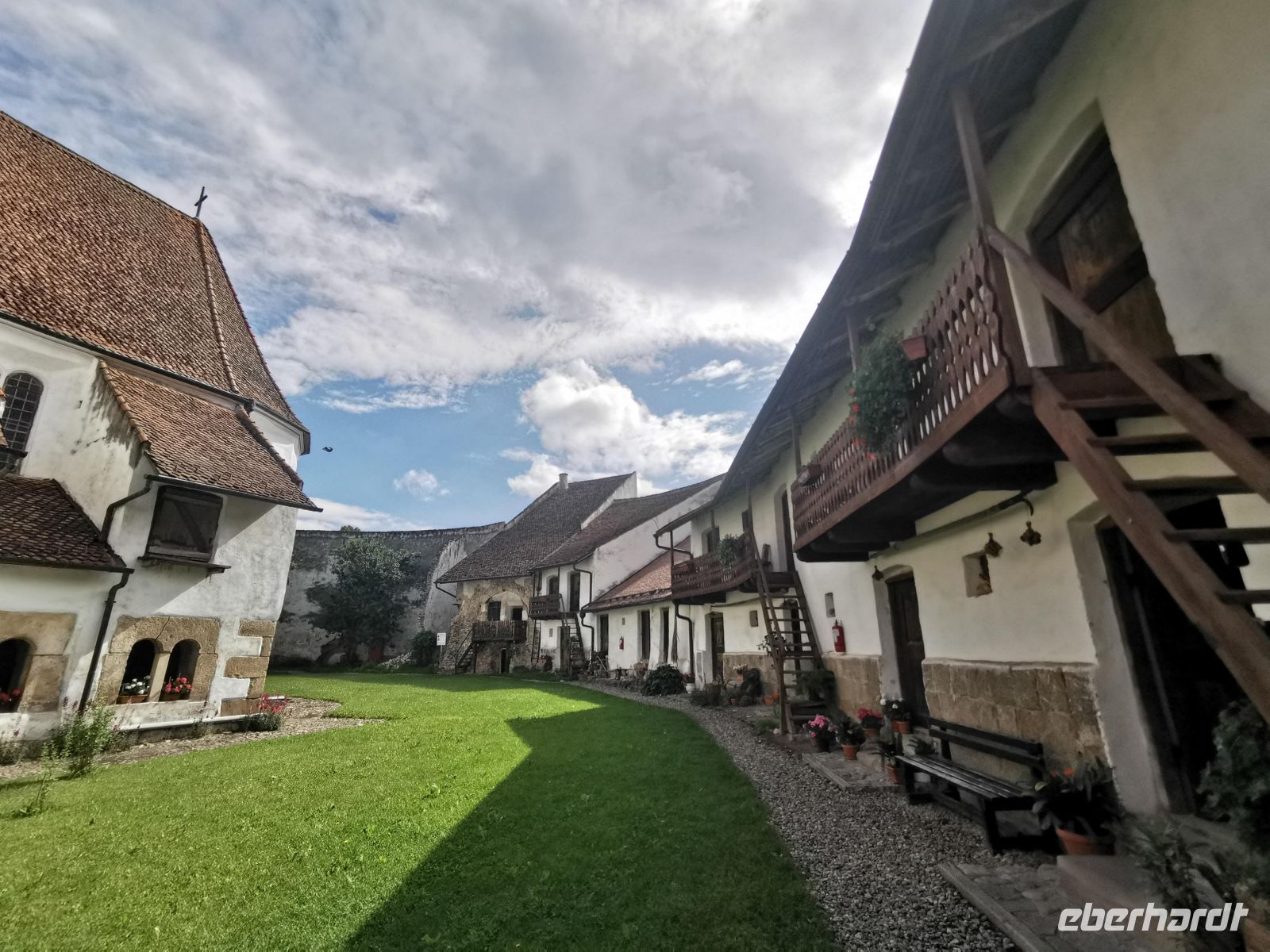 In der Nähe von Bran liegt das kleine Dorf Harman - zu deutsch Honigberg und dort hat Simone eine kleine Überraschung eingeplant. Wir besichtigen eine der am besten erhaltenen Kirchenburgen in ganz Rumänien. Sie war einst eine bäuerliche Wehranlage der Siebenbürger Sachsen. Um 1300 wurde die ursprüngliche Kapelle errichtet. Die Besonderheit an dieser Kirche sind Vorratskammern, die sich wie Nester von Schwalben unter der Traufe an das Mittelschiff schmiegen. Diese Lebensmittelspeicher brauchte man, um sich während der widerholten Angriffe der Osmanen im 16. Jahrhundert und der Ungarn im 17. Jahrhundert monatelang verschanzen zu können. Die sogenannten Specktürme beherbergten, wie ihr Name schon andeutet, tatsächlich gepökeltes Fleisch und Speck und nur durch sie war es möglich, den Eroberungsversuchen zu entgehen. Dane, der Verwalter der Anlage, erklärt uns ausführlich, wie man damals hier gelebt hat und erzählt die verschiedenen Geschichten, die mit der Anlage verknüpft sind. Danach sehen wir uns das Innere der Kirche an und besichtigen die Räume im Ringwall, wo man einen guten Eindruck bekommt, wie die Siebenbürger Sachsen in den vergangenen Jahrhunderten gelebt haben. Am Ende steigen wir die steile Treppe zum Festungswall hinauf und umrunden das ganze Areal.