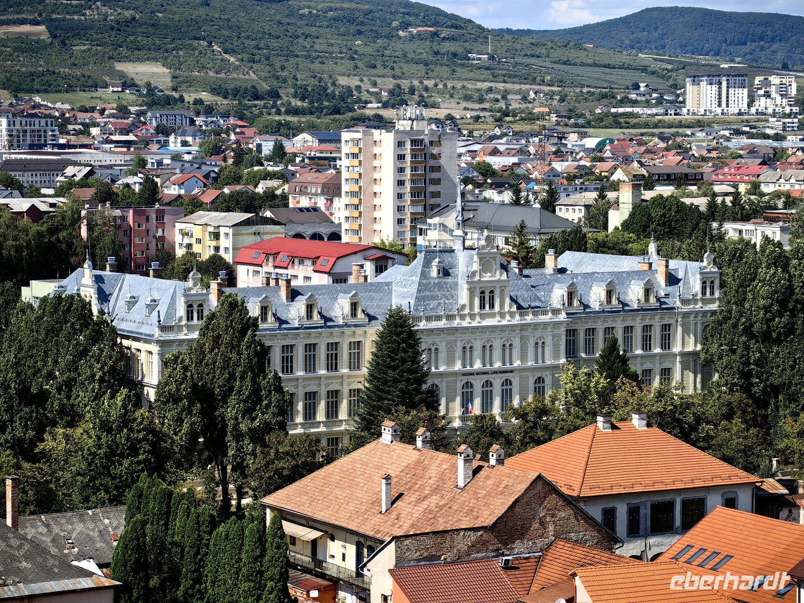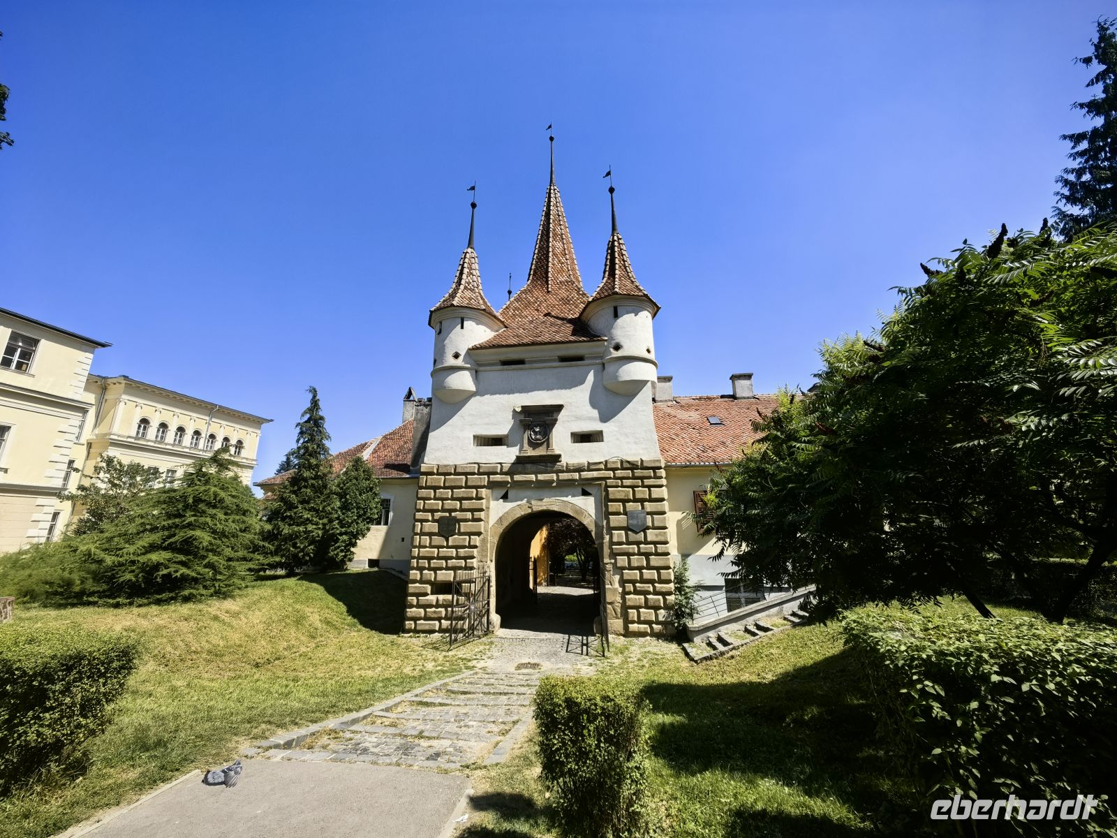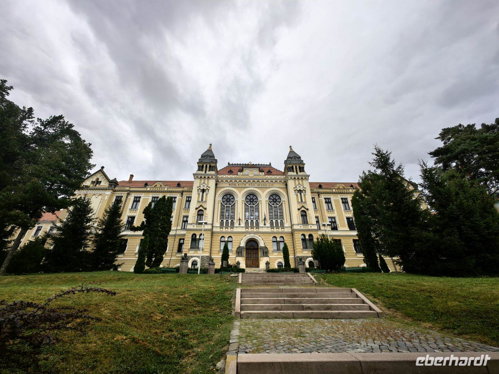 Nun wird es anstrengend. Wir erklimmen die 176 Stufen der sogenannten "gedeckten Schülertreppe", die zum Gipfel des Schulberg-Hügels führt, wo sich das Josef Haltrich Lyzeum befindet, in dem seit Anfang des 17. Jahrhunderts Deutsch unterrichtet wird. Die Schüler und Lehrer dieses Gymnasiums müssen alle sportlich sein, sie legen diesen Weg mehrmals täglich zurück!