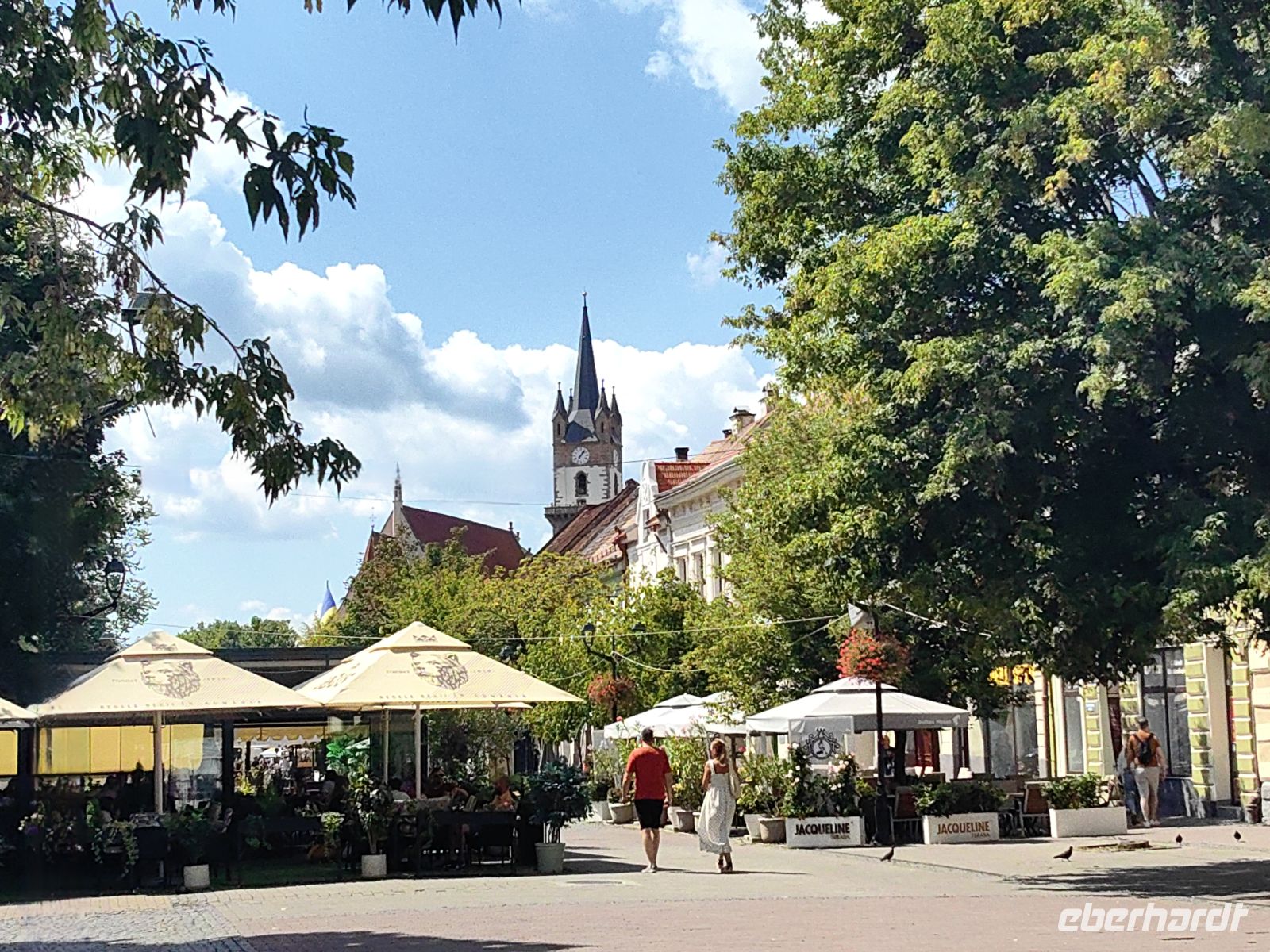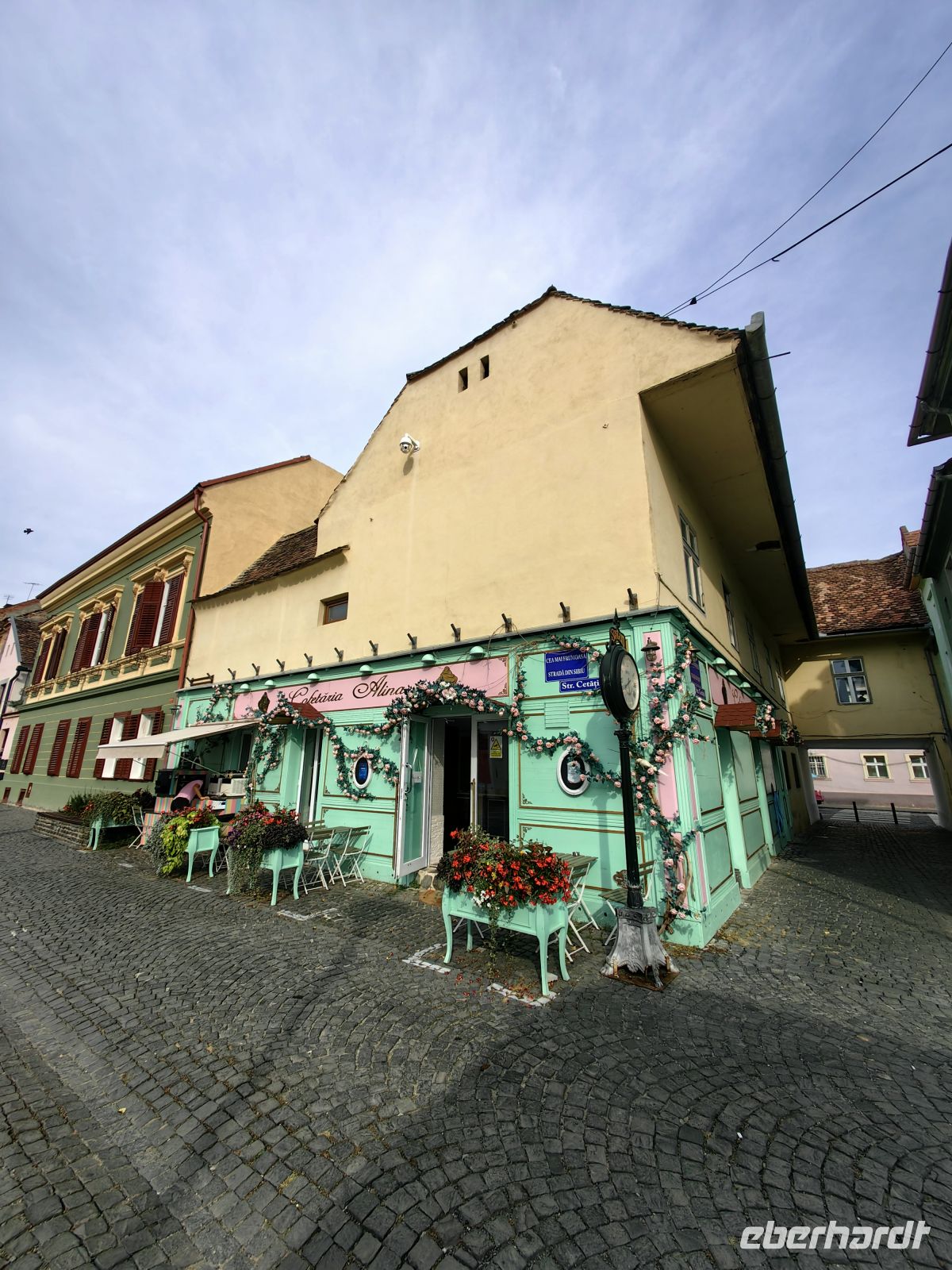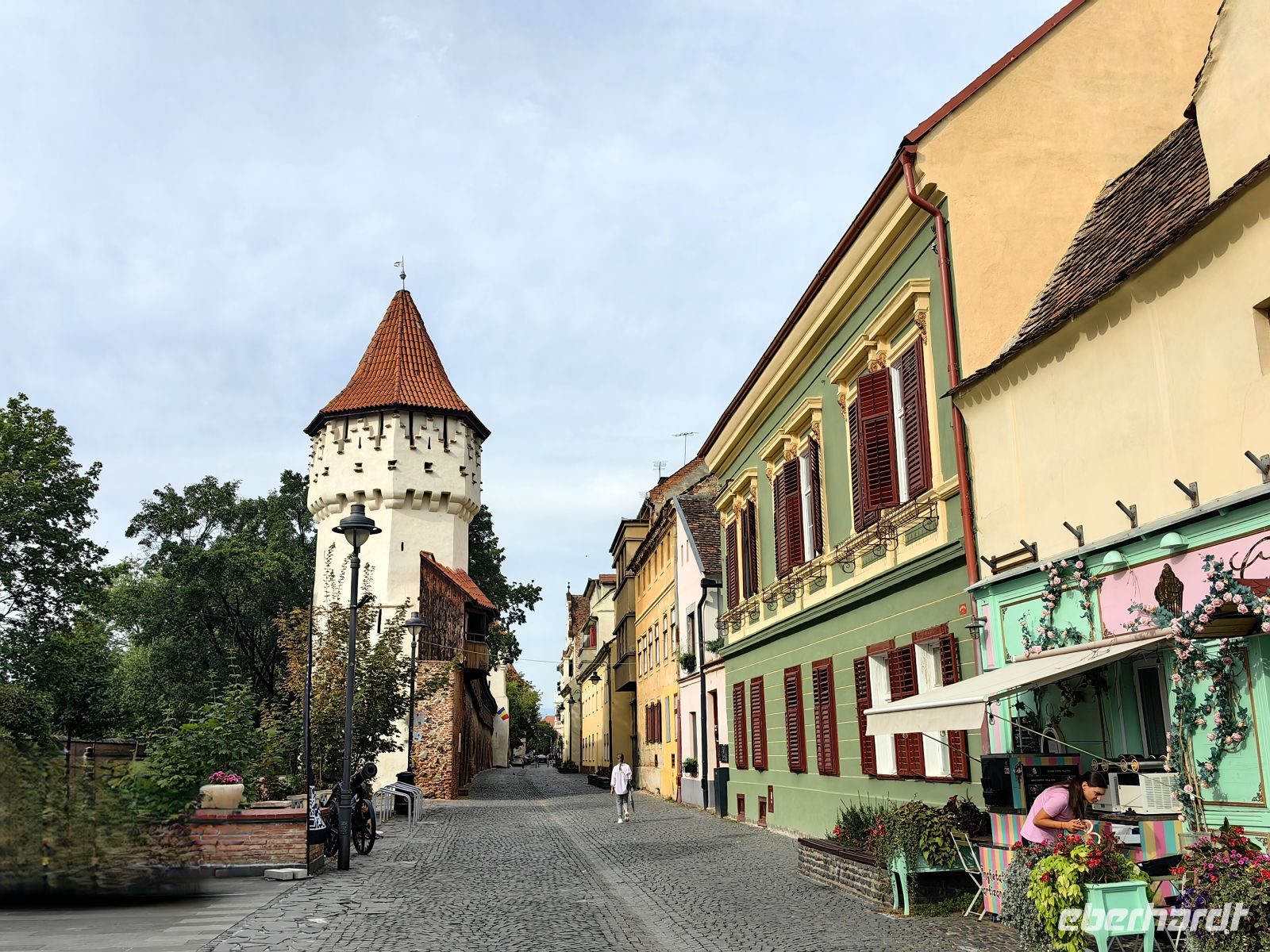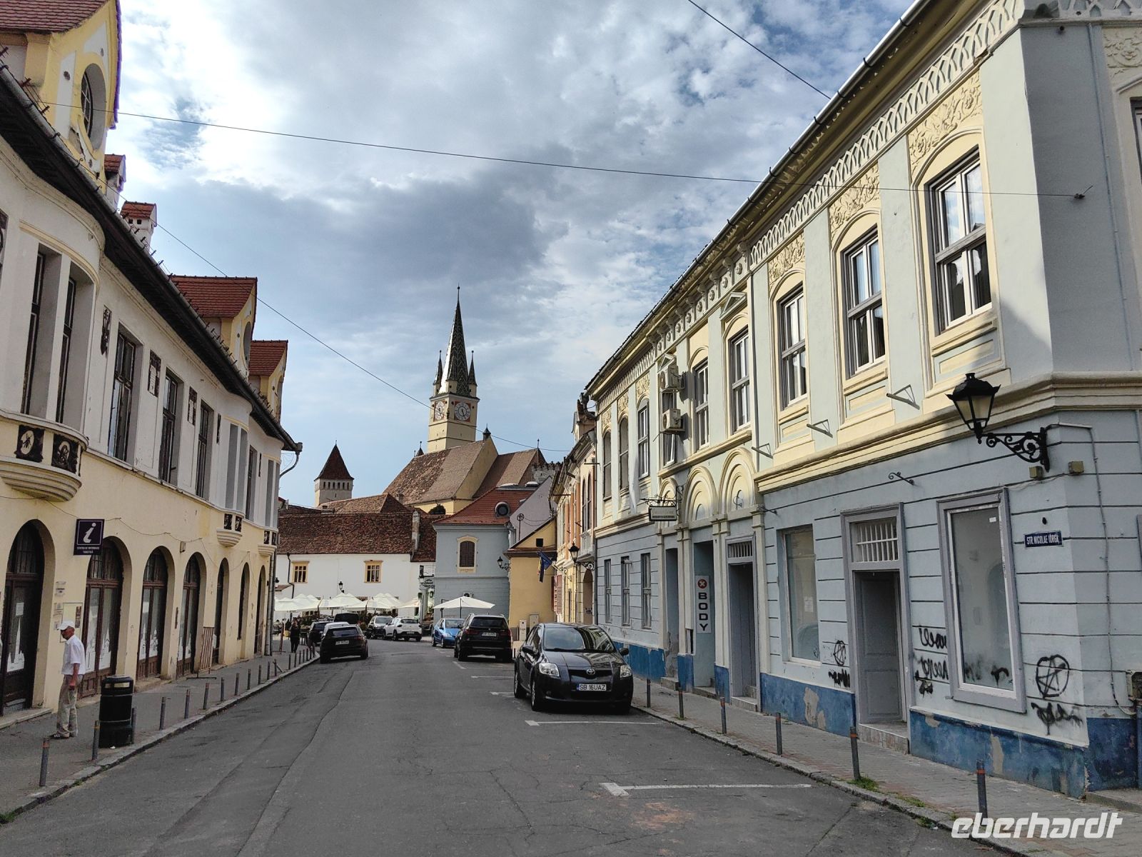 Am Beginn der Fußgängermeile gelegen, schauen wir uns die evangelische Kirche an, im Inneren befindet sich ein schlichter Barockaltar, während die restliche Kirche im Stil der Gotik errichtet wurde. Gegenüber den üppig bemalten Moldauklöstern wirkt sie auf uns eher schmucklos. Die Flaniermeile ist rechts und links von schmucken kleinen Häuschen und unzähligen Cafés und Restaurants gesäumt. Hier suchen wir uns ein schattiges Plätzchen und machen eine gemütliche Mittagspause.
