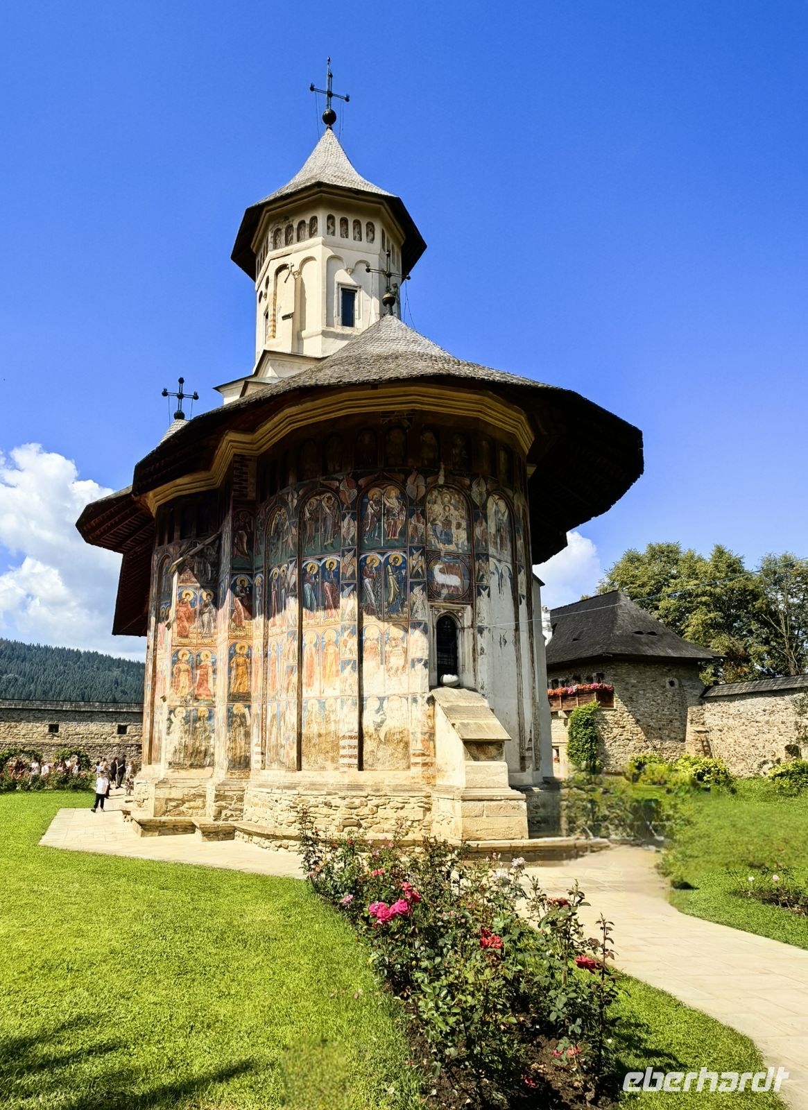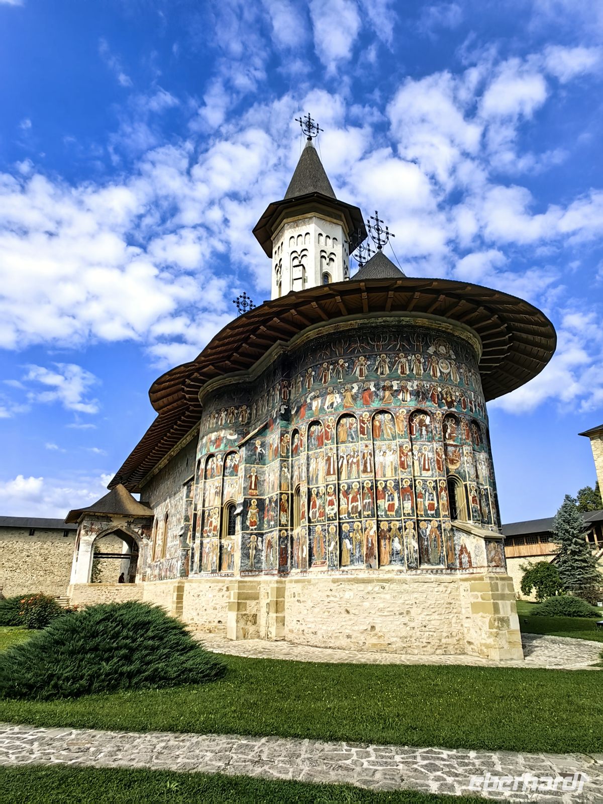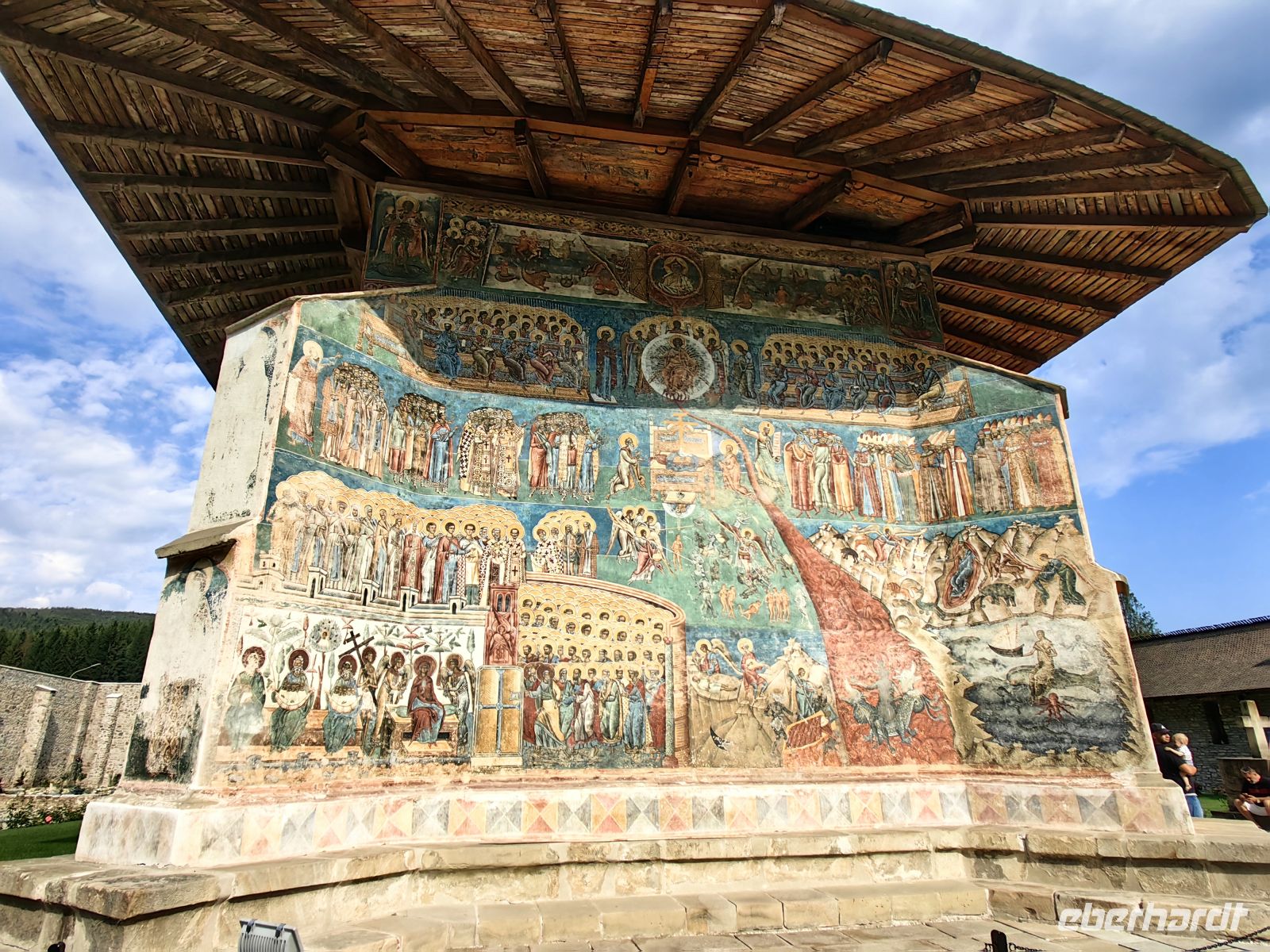 Gestärkt erreichen wir das Kloster Voronet. Dieses Kloster wurde ebenfalls in die Liste des UNESCO Weltkulturerbes aufgenommen. Es wurde im Gedenken an die Schlacht von Vaslui von Stefan dem Großen erbaut. Die in den Mauern liegende Klosterkirche des Heiligen Georg stammt aus dem Jahr 1488. Wegen der exzellent erhaltenen Fresken wird sie auch "Sixtinische Kapelle des Ostens" genannt. An der Westseite des Gebäudes findet man Darstellungen aus dem Jüngsten Gericht. Das Wetter der Jahrhunderte hat den Malereien auf der Südseite sehr zugesetzt und die Bilder vom Stammbaum Jesses sind nicht mehr sehr gut zu erkennen.