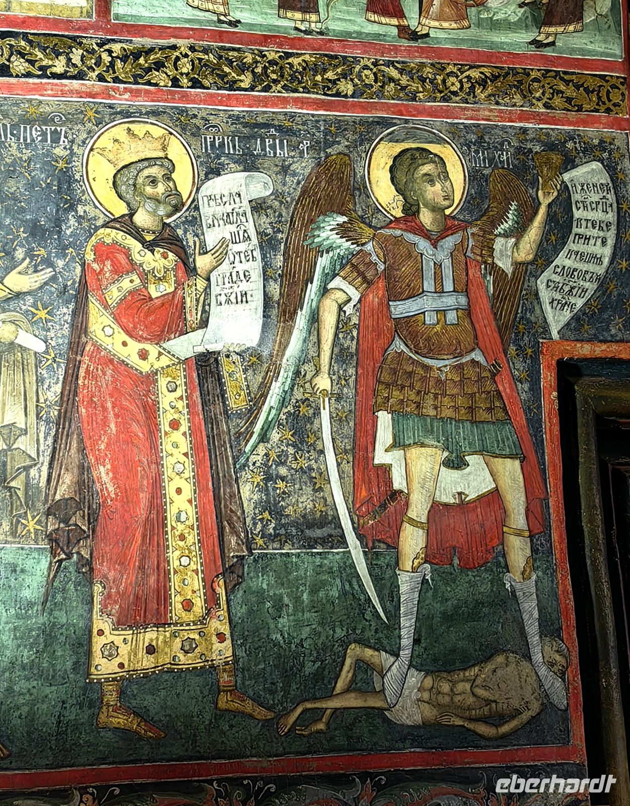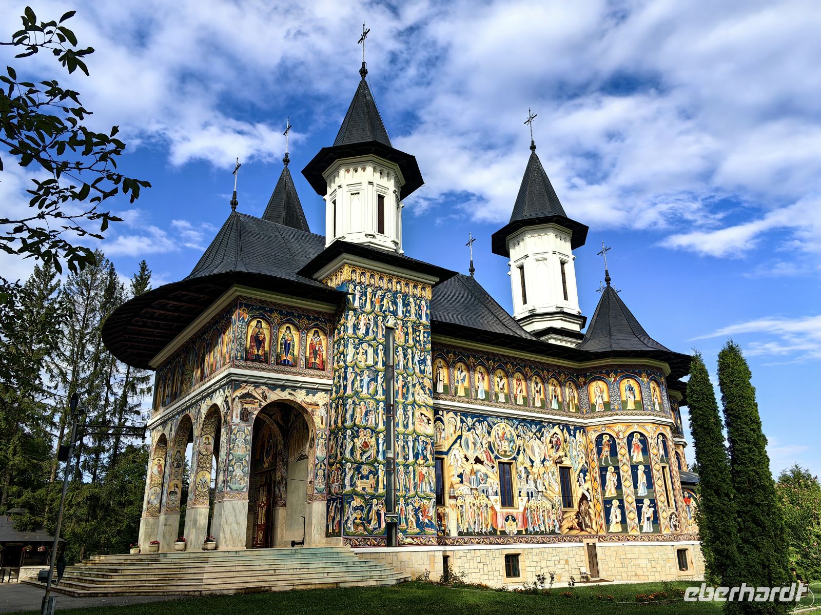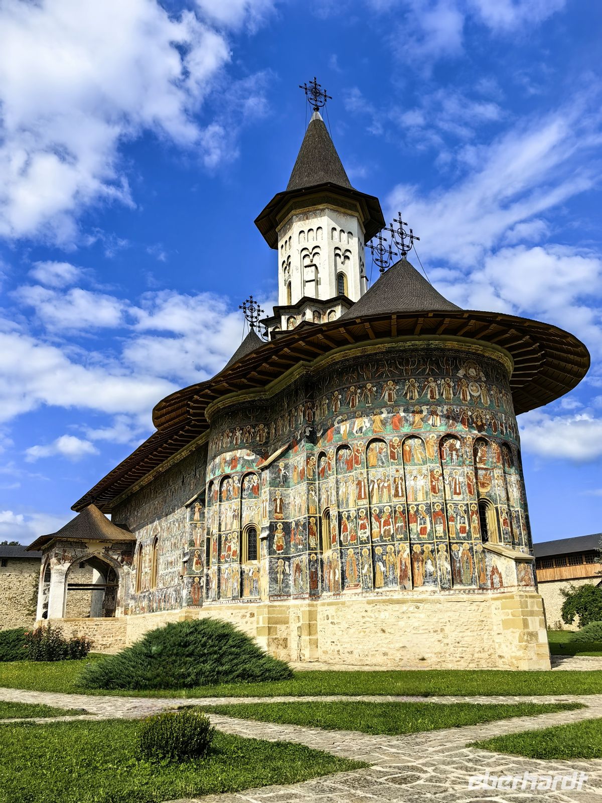 Gestärkt erreichen wir das Kloster Voronet. Dieses Kloster wurde ebenfalls in die Liste des UNESCO Weltkulturerbes aufgenommen. Es wurde im Gedenken an die Schlacht von Vaslui von Stefan dem Großen erbaut. Die in den Mauern liegende Klosterkirche des Heiligen Georg stammt aus dem Jahr 1488. Wegen der exzellent erhaltenen Fresken wird sie auch "Sixtinische Kapelle des Ostens" genannt. An der Westseite des Gebäudes findet man Darstellungen aus dem Jüngsten Gericht. Das Wetter der Jahrhunderte hat den Malereien auf der Südseite sehr zugesetzt und die Bilder vom Stammbaum Jesses sind nicht mehr sehr gut zu erkennen.