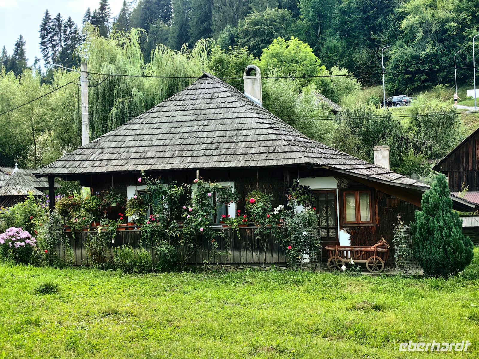 Wir treffen einen Mönch, der in Deutsch mit uns plauscht und wenn wir nicht noch eineinhalb Stunden Fahrt bis zum Hotel in Gura Humorului vor uns hätten, könnten wir hier noch verweilen. Unterwegs sehen wir unzählige schön geschnitzte alte Holzhäuser, daneben ganz modern und futuristisch neu gebaute Einfamilienhäuser, die gar nicht recht in die Landschaft passen wollen. Pferdewagen beladen mit der Ernte vom Feld begegnen uns ebenso oft wie moderne Elektroautos. Rumänien ist eben alles - alt und neu. Alles nah beieinander.
