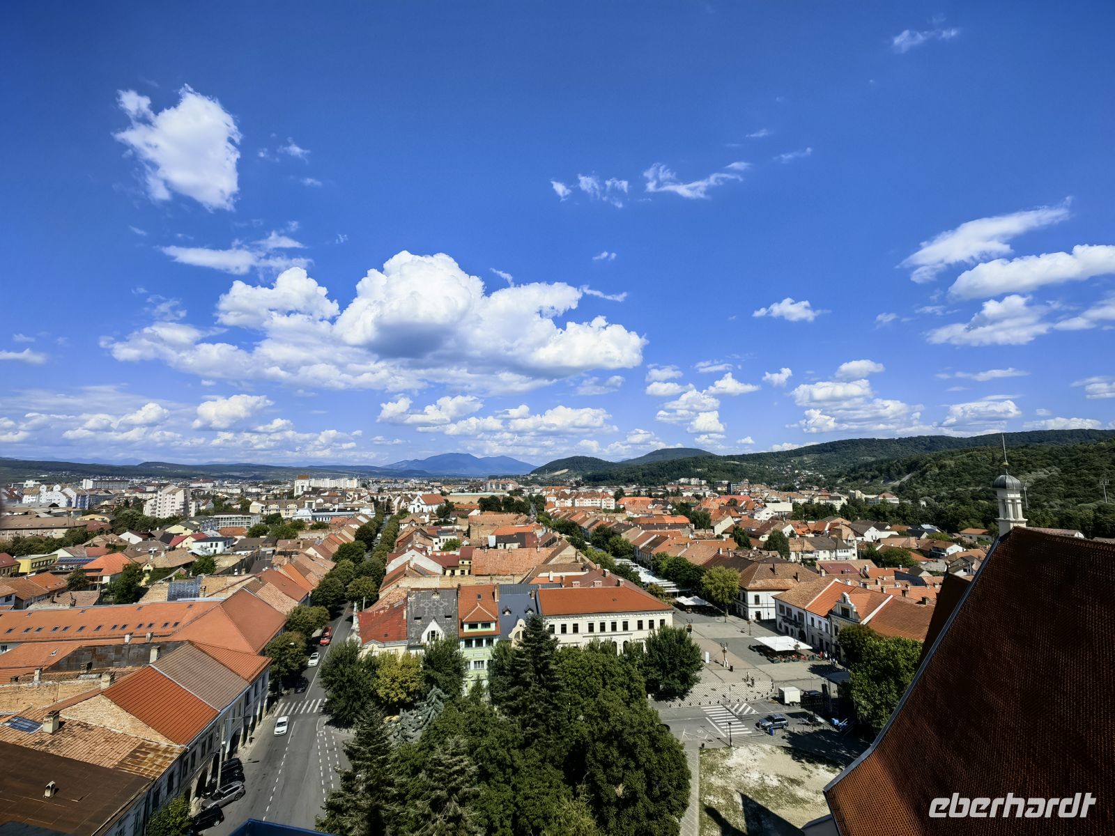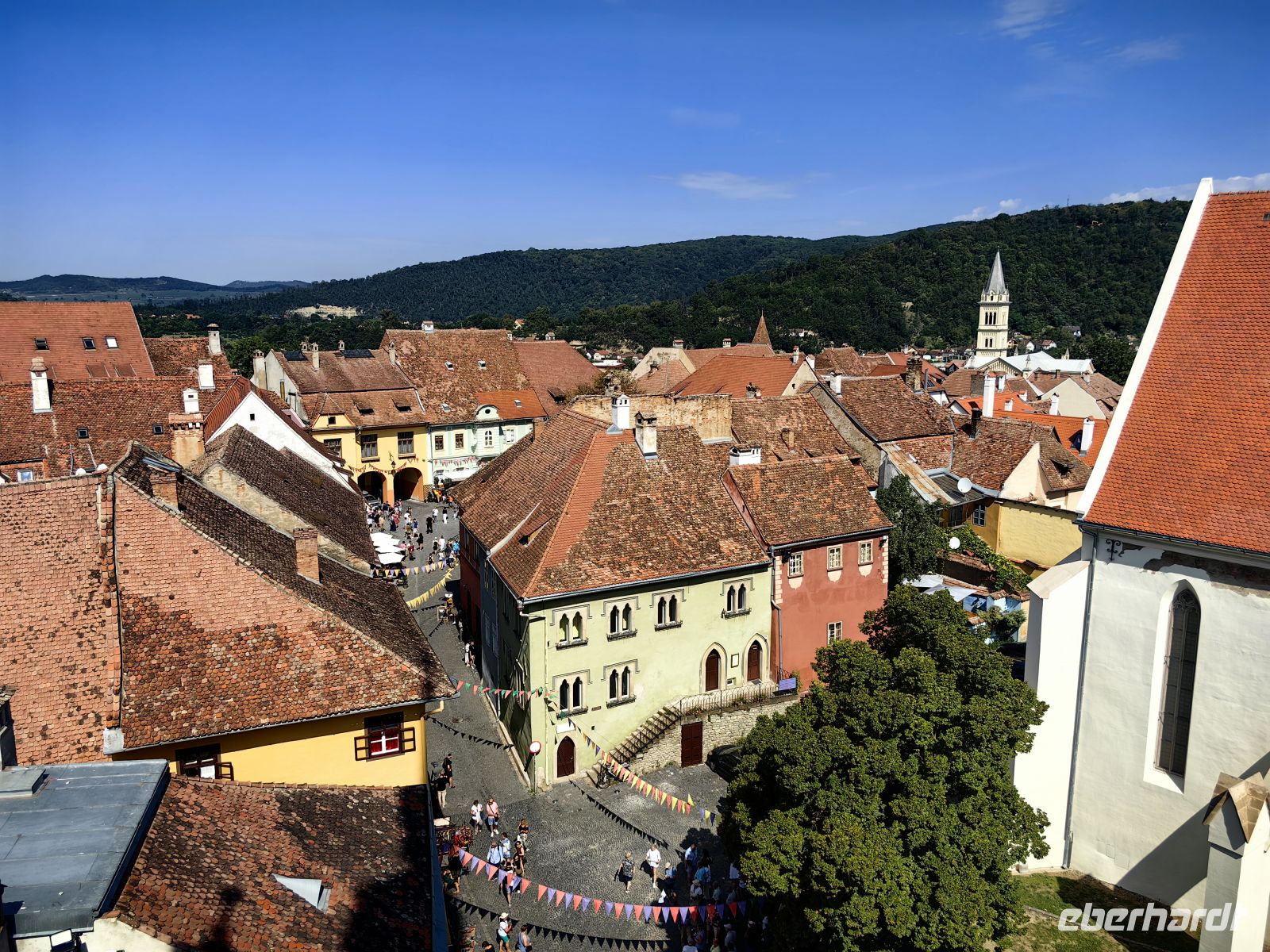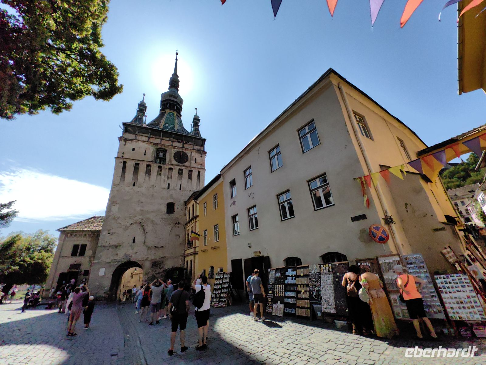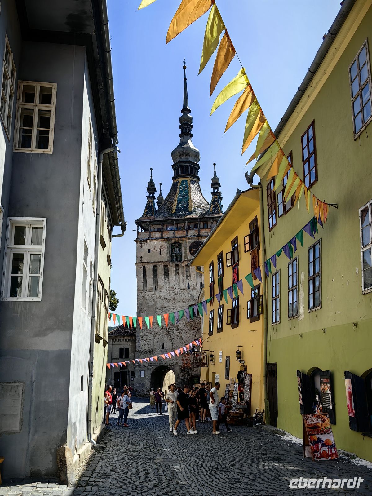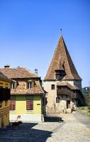 Etwa eine Autostunde entfernt liegt die von sanften Hügelketten der Karpatenausläufer umgebene Stadt Shigishoara (Schäßburg). Hier leben heute etwa 30.000 Einwohner und sie ist wie Targu Mures dreisprachig. Ein Fünftel der Bevölkerung gehört zur ungarischen Volksgruppe und noch etwa 500 Bewohner sind Siebenbürger Sachsen. Wir fahren hinauf in die Oberstadt und passieren eines der eindrucksvollen Stadttore mit dem markanten Zinngießerturm. Von oben hat man eine ganz bezaubernde Sicht auf die Umgebung und die Dächer der mittelalterlich wirkenden Altstadt. Vom Marktplatz aus sehen wir den Stundturm, in den wir über enge Stiegen hochsteigen, um einen Blick in die Umgebung werfen zu können.