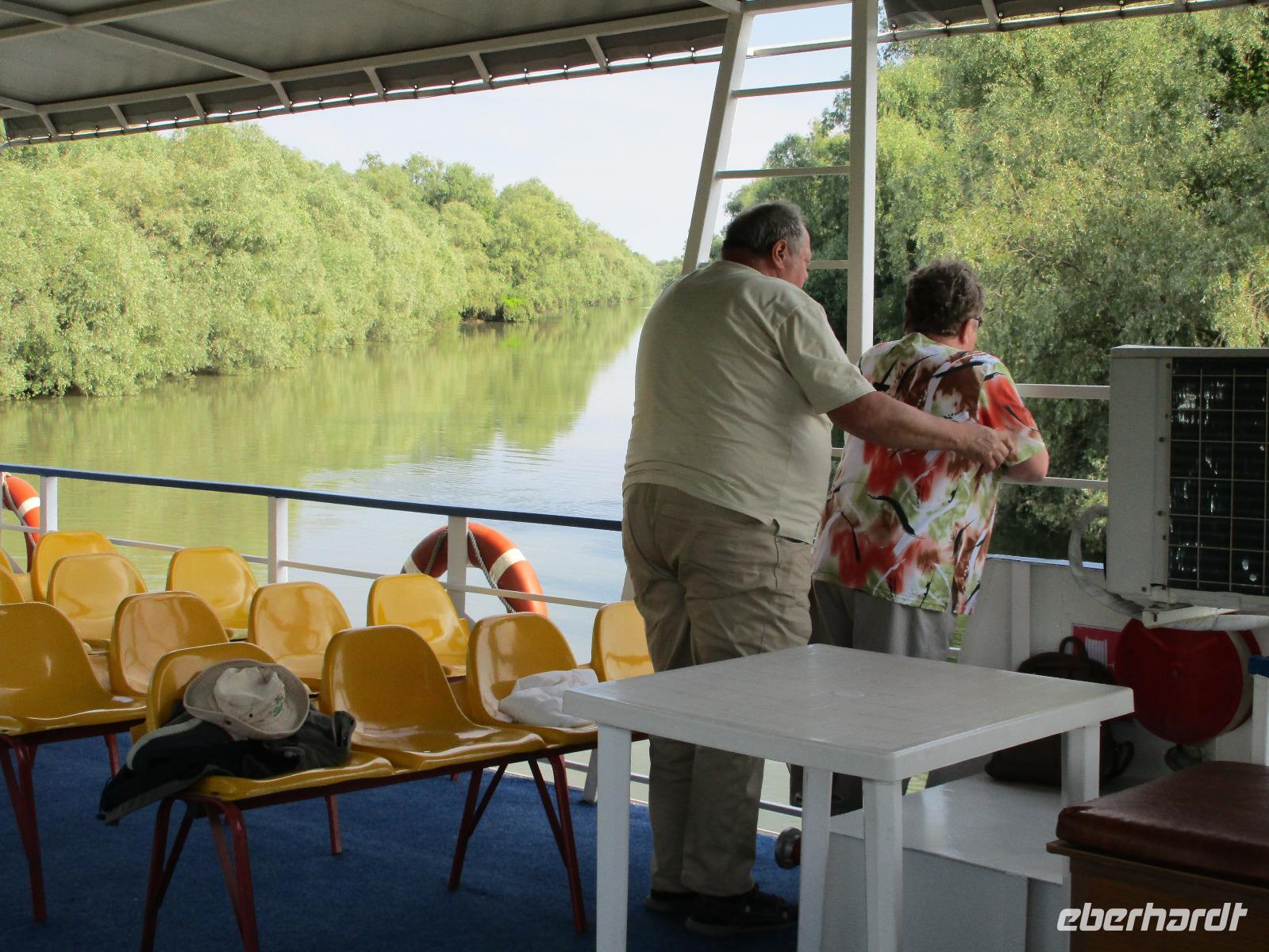 Nach der ersten Nacht im fremden Land, führt uns unsere Reise am nächsten Tag zunächst in Richtung Osten. Niko, unser Busfahrer ab heute, lenkt den Bus durch Bukarest und wir bekommen einen ersten Einblick in diese doch sehr schöne und teilweise sehr grüne Stadt. Wir sehen unter anderem den Triumphbogen, fahren durch das Botschaftsviertel, kommen vorbei am Siegesplatz mit dem Regierungsgebäude sowie am römischen Platz am fahren entlang des Hotels Interkontinental, dem Universitätsplatz und der Nationalbibliothek auf die Autobahn, die uns nun rund 130 Kilometer führt. Vor Dranja verlassen wir wieder die Autobahn und fahren nun weiter auf der Landstraße. Schöne grüne Natur begleitet uns. Auch kommen wir an einem großen verlassenen Chemiewerk vorbei, dessen trostloser Anblick mich ein wenig traurig stimmt. Nachdem wir Slobozia durchfahren haben, finden wir in einer kleinen Ortschaft endlich eine Wechselstube, die am Sonntag bereits geöffnet hat. Schnell steigen Corina und ich aus, um das Geld unserer Gäste in Rumänische LEI umzutauschen - endlich sind wir alle "flüssig";-). Die Strecke führt uns nun weiter durch Bucu, Ograda und Tandarei bis wir endlich unser Ziel für den heutigen Tag erreichen, Tulcea im Donaudelta. Wir checken im 4-Sterne-Hotel "Esplanada" ein und beziehen unsere Zimmer. Da das Haus direkt an der Donau liegt, benötigen wir nur einen kurzen Spaziergang am Nachmittag um unser Schiff für den Nachmittagsausflug zu erreichen. Der Kapitän begrüßt uns zu einer rund dreieinhalb stündigen Schifffahrt im Donaudelta. Das Schiff haben wir dabei für uns alleine und es zieht seine Route auch auf kleineren Nebenarmen. Während uns zwei Becher Wein gereicht warden, zieht die schöne Landschaft des Deltas vorbei. Unter strahlendstem Sonnenschein beobachen wir Reiher, Eisvögel und manch andere Vogelarten, die hier ihr Zuhause haben. Auch der heutige Abend klingt im hoteleigenen Restaurant aus.