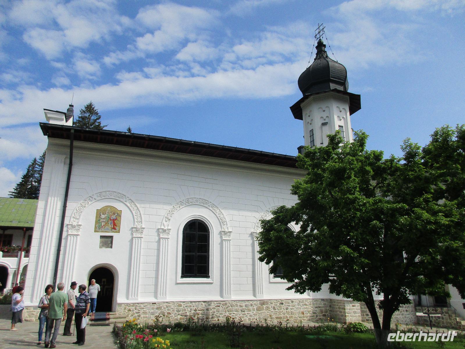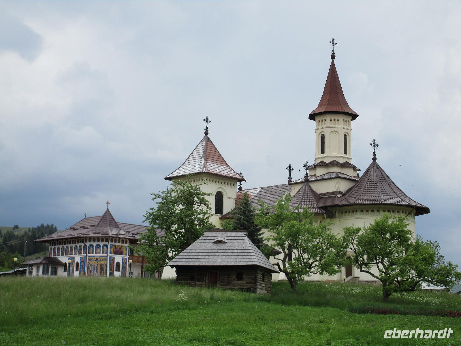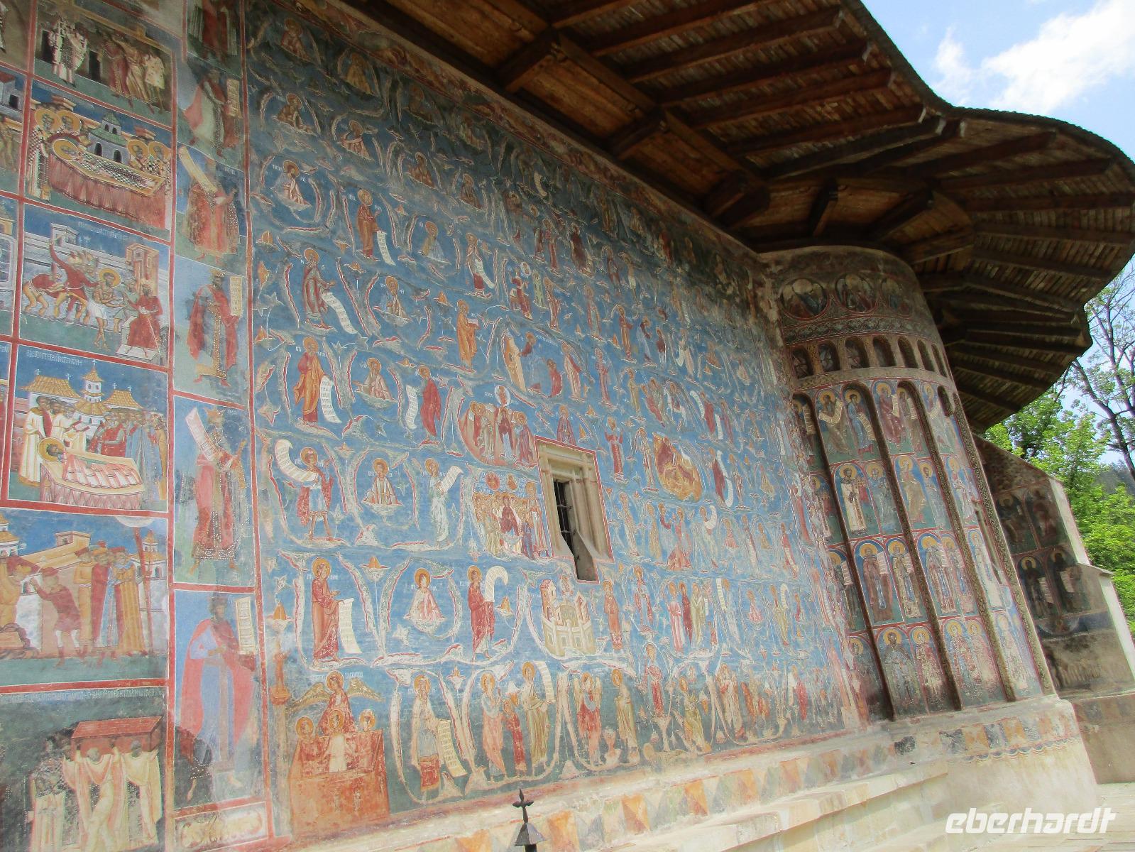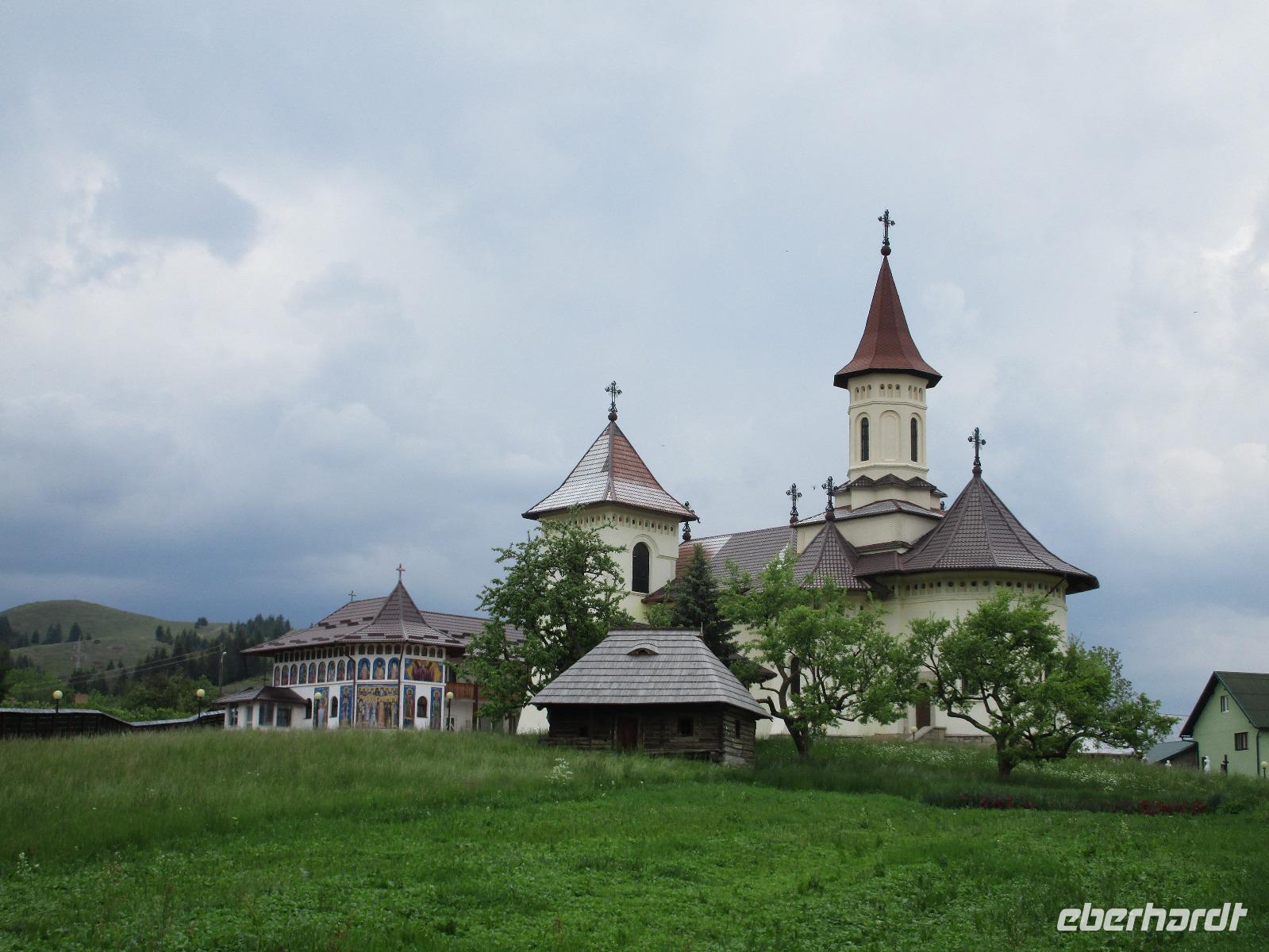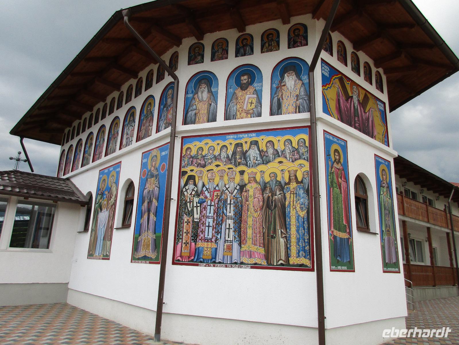 Heute treffen wir uns ohne Koffer am Bus denn wir werden eine weitere Nacht in Piatra Neamt verbringen, damit wir heute die wunderschönen Klöster der Moldauregion anschauen können. Es geht auch gleich nach dem Frühstück los und nach rund einer dreiviertel Stunde Fahrt erreichen wir das orthodoxe Nonnenkloster Agapaia. Mit unseren Audioguides im Ohr spazieren wir vorbei an den kleinen Häusern der Nonnen bis zum Eingang der Klosternanlage. Im Inneren der Anlage befindet sich eine schöne Gartenanlage, die von den Nonnen selbst gepflegt werden. So kommen wir in den Genuss, einer Nonne beim Rasenmähen zuzuschauen. Kernstück der Klosteranlage ist die hiesige Kirche, die im Inneren prunkvoll ausgestattet ist. Die Innenmalereien stammen vom bekannten rumänischen Maler Nicolae Grigorescu. Bei der anschließenden Freizeit am Kloster besichtigen wir einige Räume des Klosters und können auch selbstgemachte Schmuckstücke und Konfitüren käuflich erwerben. Unser nächstes Ziel ist das legendäre Kloster Voronet, welches wir nach rund 1,5 Stunden Fahrt erreichen. Entlang eines Basares erreichen wir diese Klosteranlage, die auf einer kleinen Anhöhe errichtet wurde. Prunkstück hier sind natürlich die Wandermalereien an der äußeren Seite der Kirche. Das bekannteste Kloster Rumäniens ist auch unter dem Beinamen Sixtinische Kapelle des Ostens bekannt. Das Innere der Kirche besticht durch seine Schlichtheit und doch wunderschönen, zahlreichen Malereien in kräftigen Farben. Besonders das Äußere der Westseite besticht, denn da ist auch einer sehr großen Fläche das Jüngste Gericht bildlich dargestellt. Corina erklärt uns einzelne Segmente davon, die von oben nach unten in fünf Abschnitte dargestellt sind. Ein wirklich beeindruckendes Kloster, dessen Besuch man absolute empfehlen muss. Nach einem kurzen Besuch auf dem vorherliegenden Friedhof bummeln wir langsam über den Basar zurück in Richtung Bus. Nico erwartet uns bereits, um uns zurück in die Stadt zu bringen, wo wir unsere Mittagspause verbringen. Einige meiner Gäste speisen im Hotelrestaurant, einige an einer Art Imbiss. Wieder andere spazieren durch den Ort und besuchen die Markthalle des Ortes, die man viel frischem Obst, Käse und Fleisch aufwartet. Auf jeden Fall auch einmal ein interessanter Einblick in das rumänische Leben. Bevor es zurück nach Pietra Neamt geht, besuchen wir das letzte Kloster für den heutigen Tag, Kloster Humor. Nicht ganz so imposant wie Kloster Voronet besticht aber auch dieses Kloster mit wunderbaren Außenmalereien, die auch das Innere verzieren. Kloster Humor ist allerdings auch etwas kleiner und irgendwie, meiner Meinung nach, auch etwas schlichter. Zum Abschluss gehen noch einige aus der Gruppe in die nebenanliegende Kirche. Schließlich setzen wir unseren Rückweg in Richtung Pietra Neamt fort. Leider verlässt uns nun der Segen des schönen Wetters und dunkle Wolken begleiten unseren Weg. Zurück in der Stadt hat sich der Himmel soweit zugezogen, dass dicke Regentropfen herunterfallen und somit das Vorhaben, mit der örtlichen Seilbahn zu fahren, nicht durchgeführt werden kann.