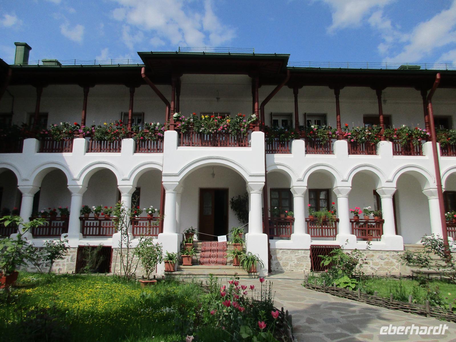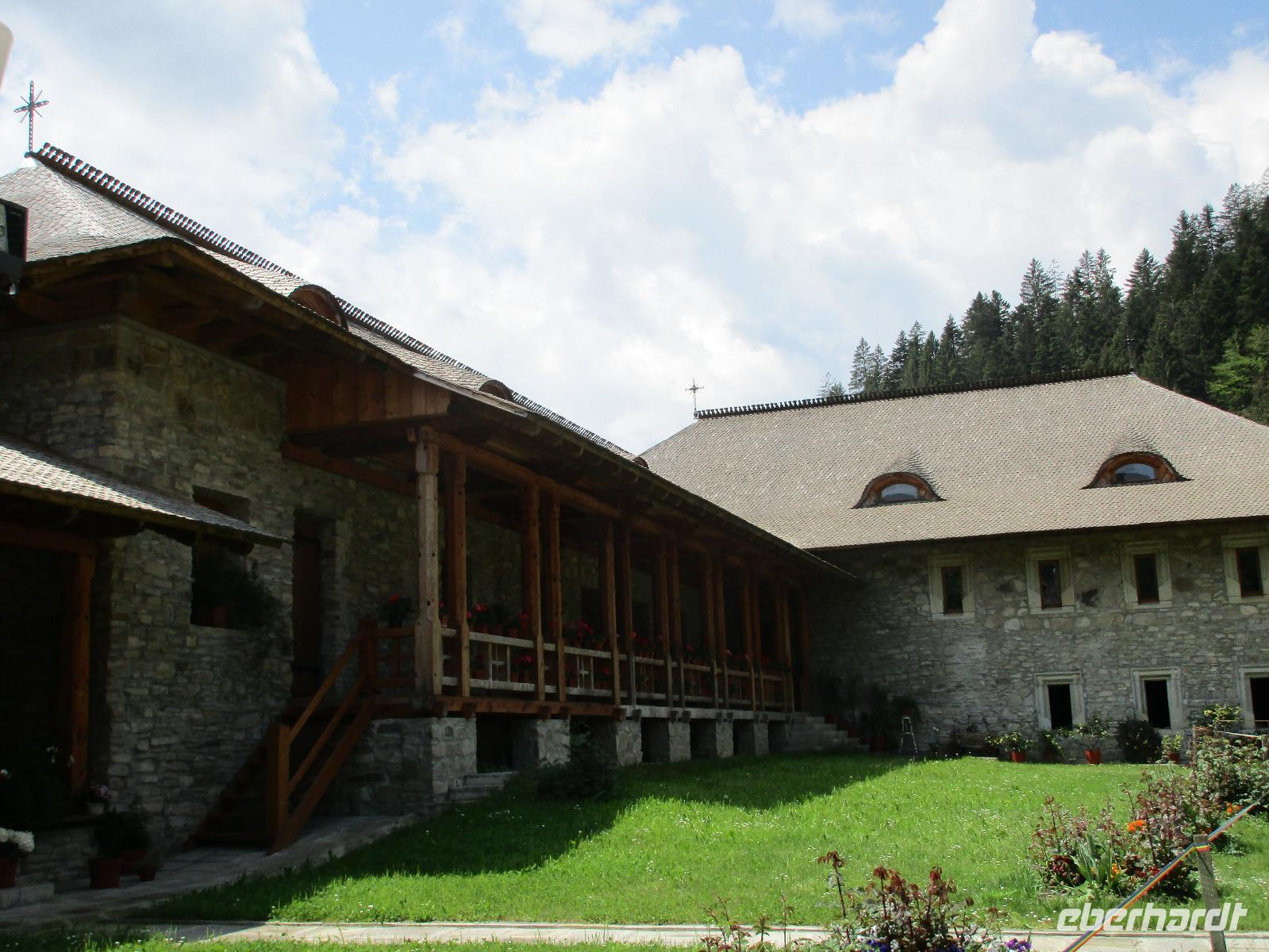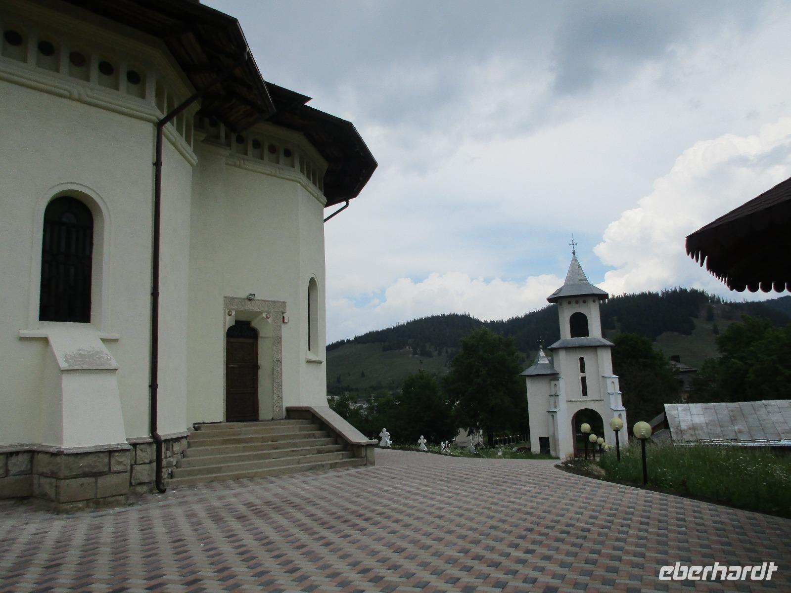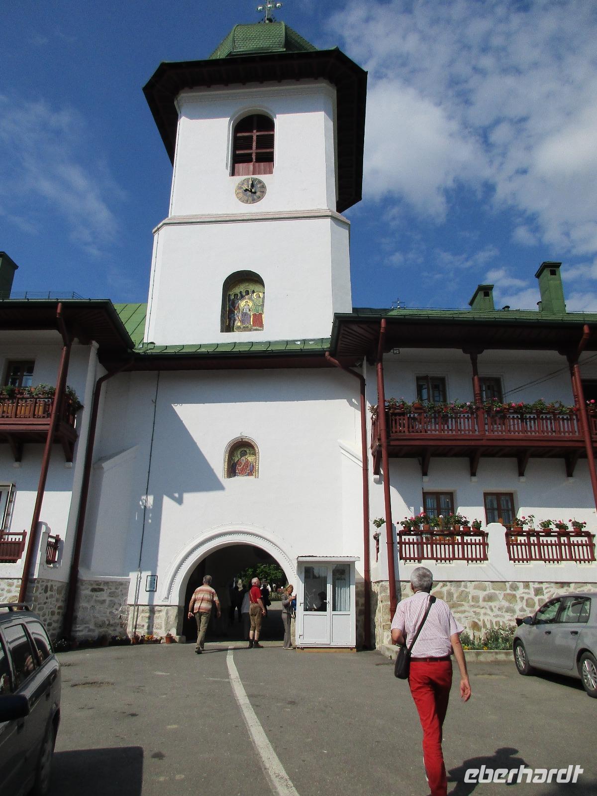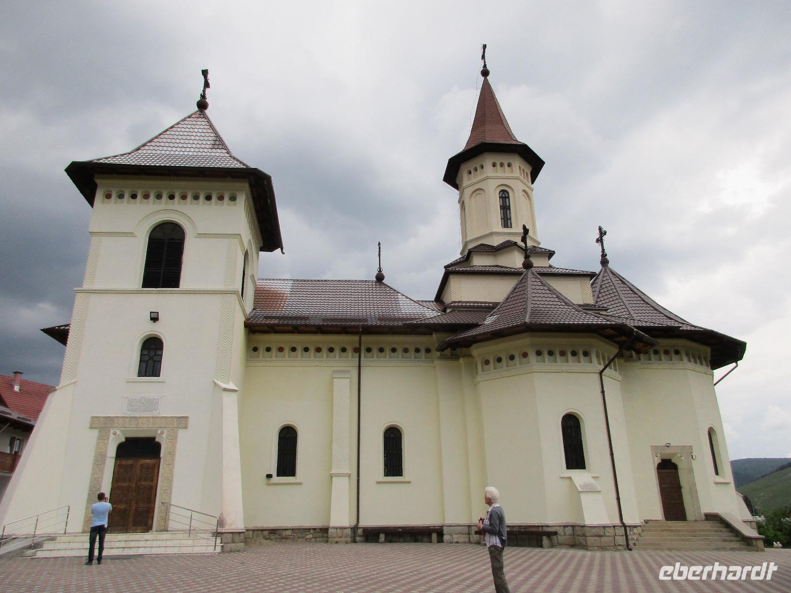 Heute treffen wir uns ohne Koffer am Bus denn wir werden eine weitere Nacht in Piatra Neamt verbringen, damit wir heute die wunderschönen Klöster der Moldauregion anschauen können. Es geht auch gleich nach dem Frühstück los und nach rund einer dreiviertel Stunde Fahrt erreichen wir das orthodoxe Nonnenkloster Agapaia. Mit unseren Audioguides im Ohr spazieren wir vorbei an den kleinen Häusern der Nonnen bis zum Eingang der Klosternanlage. Im Inneren der Anlage befindet sich eine schöne Gartenanlage, die von den Nonnen selbst gepflegt werden. So kommen wir in den Genuss, einer Nonne beim Rasenmähen zuzuschauen. Kernstück der Klosteranlage ist die hiesige Kirche, die im Inneren prunkvoll ausgestattet ist. Die Innenmalereien stammen vom bekannten rumänischen Maler Nicolae Grigorescu. Bei der anschließenden Freizeit am Kloster besichtigen wir einige Räume des Klosters und können auch selbstgemachte Schmuckstücke und Konfitüren käuflich erwerben. Unser nächstes Ziel ist das legendäre Kloster Voronet, welches wir nach rund 1,5 Stunden Fahrt erreichen. Entlang eines Basares erreichen wir diese Klosteranlage, die auf einer kleinen Anhöhe errichtet wurde. Prunkstück hier sind natürlich die Wandermalereien an der äußeren Seite der Kirche. Das bekannteste Kloster Rumäniens ist auch unter dem Beinamen Sixtinische Kapelle des Ostens bekannt. Das Innere der Kirche besticht durch seine Schlichtheit und doch wunderschönen, zahlreichen Malereien in kräftigen Farben. Besonders das Äußere der Westseite besticht, denn da ist auch einer sehr großen Fläche das Jüngste Gericht bildlich dargestellt. Corina erklärt uns einzelne Segmente davon, die von oben nach unten in fünf Abschnitte dargestellt sind. Ein wirklich beeindruckendes Kloster, dessen Besuch man absolute empfehlen muss. Nach einem kurzen Besuch auf dem vorherliegenden Friedhof bummeln wir langsam über den Basar zurück in Richtung Bus. Nico erwartet uns bereits, um uns zurück in die Stadt zu bringen, wo wir unsere Mittagspause verbringen. Einige meiner Gäste speisen im Hotelrestaurant, einige an einer Art Imbiss. Wieder andere spazieren durch den Ort und besuchen die Markthalle des Ortes, die man viel frischem Obst, Käse und Fleisch aufwartet. Auf jeden Fall auch einmal ein interessanter Einblick in das rumänische Leben. Bevor es zurück nach Pietra Neamt geht, besuchen wir das letzte Kloster für den heutigen Tag, Kloster Humor. Nicht ganz so imposant wie Kloster Voronet besticht aber auch dieses Kloster mit wunderbaren Außenmalereien, die auch das Innere verzieren. Kloster Humor ist allerdings auch etwas kleiner und irgendwie, meiner Meinung nach, auch etwas schlichter. Zum Abschluss gehen noch einige aus der Gruppe in die nebenanliegende Kirche. Schließlich setzen wir unseren Rückweg in Richtung Pietra Neamt fort. Leider verlässt uns nun der Segen des schönen Wetters und dunkle Wolken begleiten unseren Weg. Zurück in der Stadt hat sich der Himmel soweit zugezogen, dass dicke Regentropfen herunterfallen und somit das Vorhaben, mit der örtlichen Seilbahn zu fahren, nicht durchgeführt werden kann.