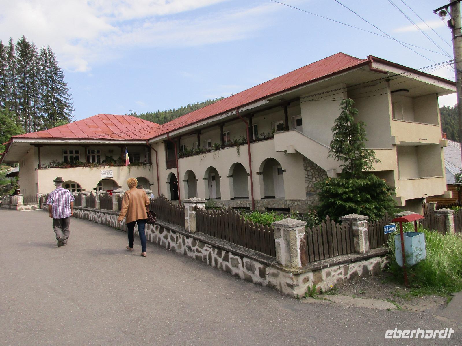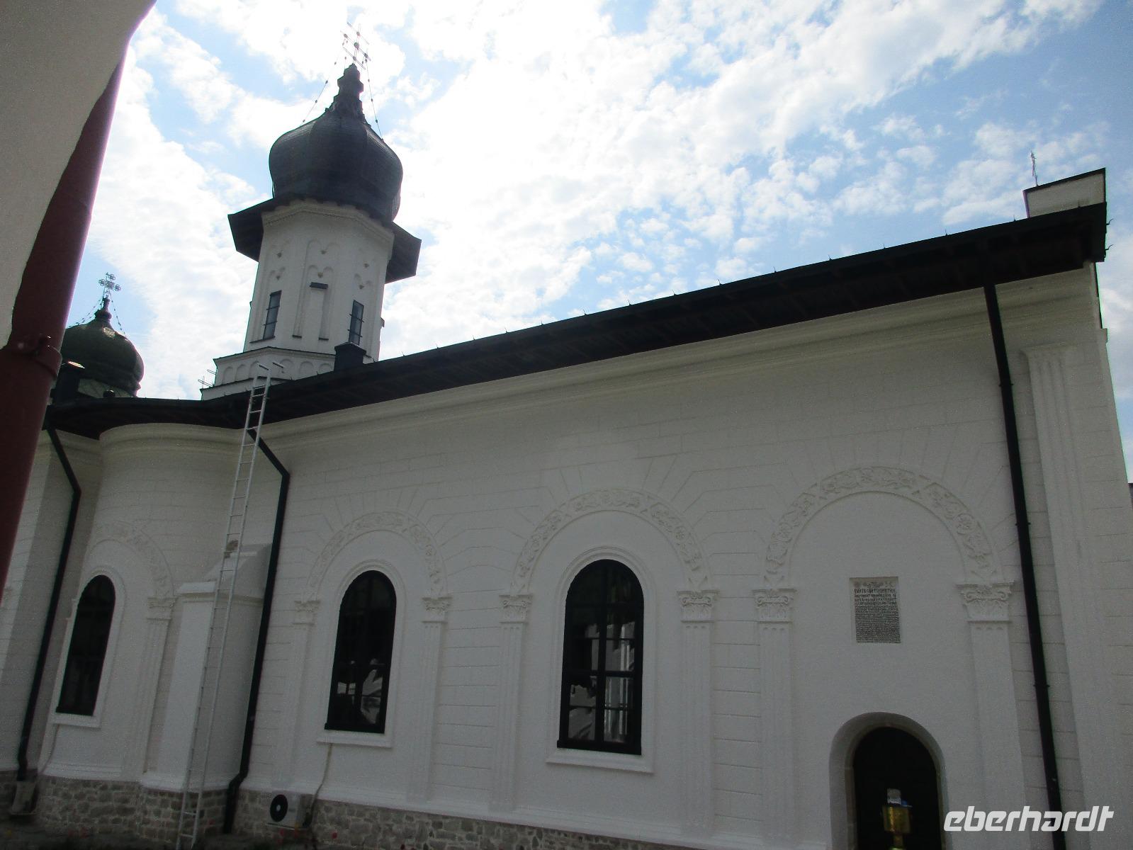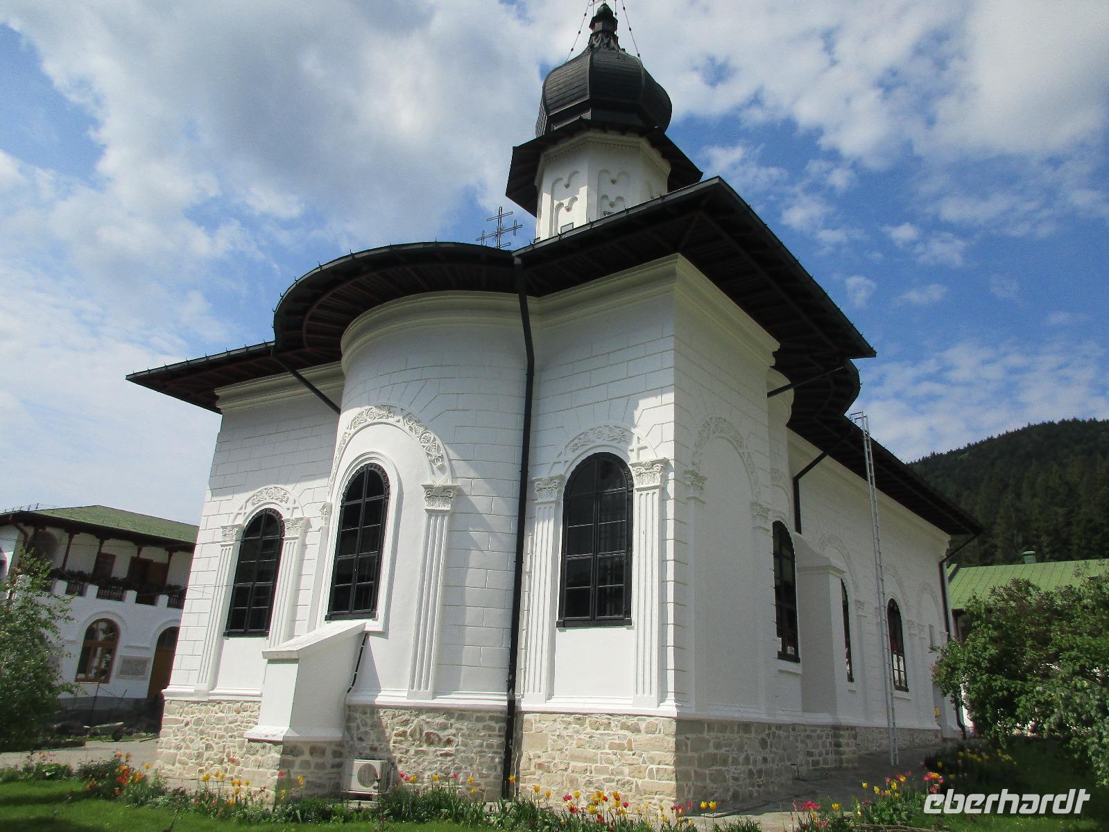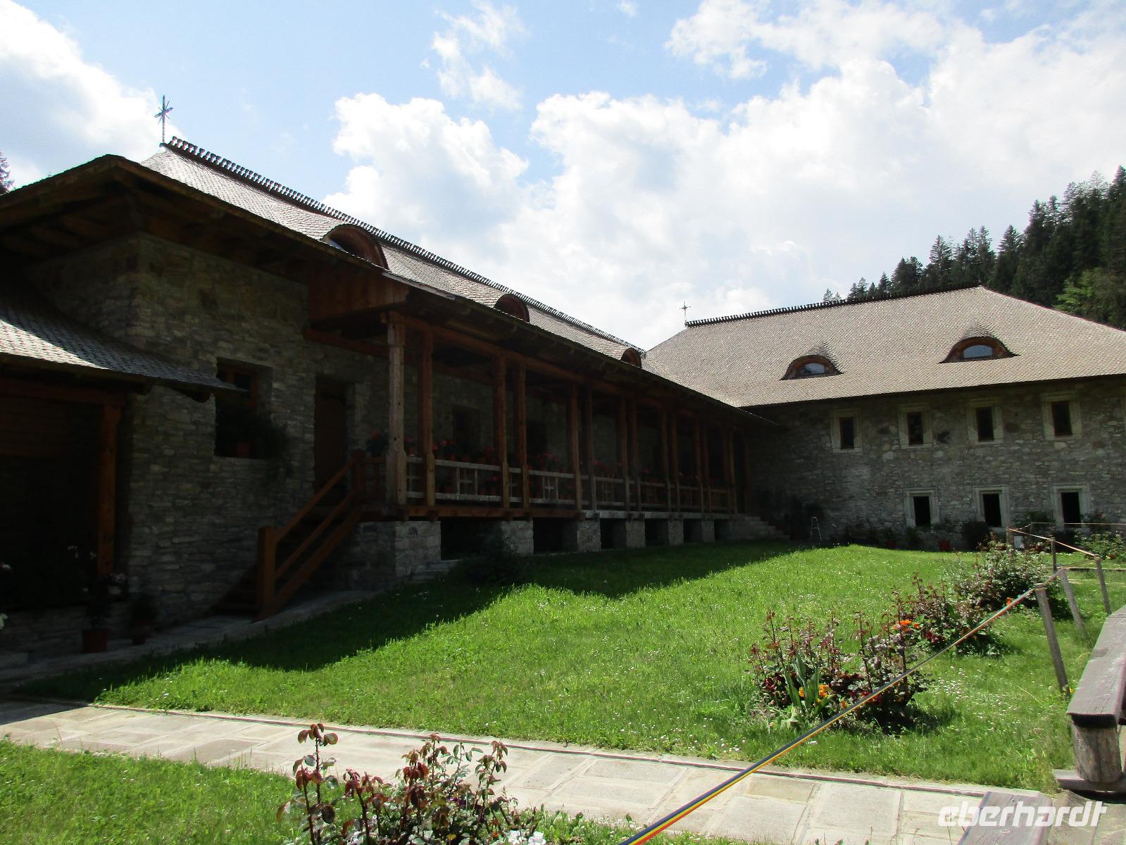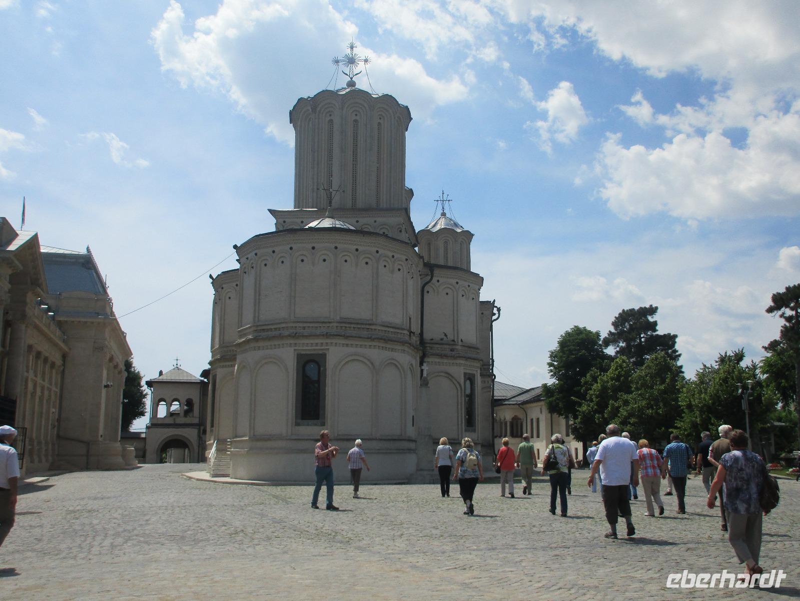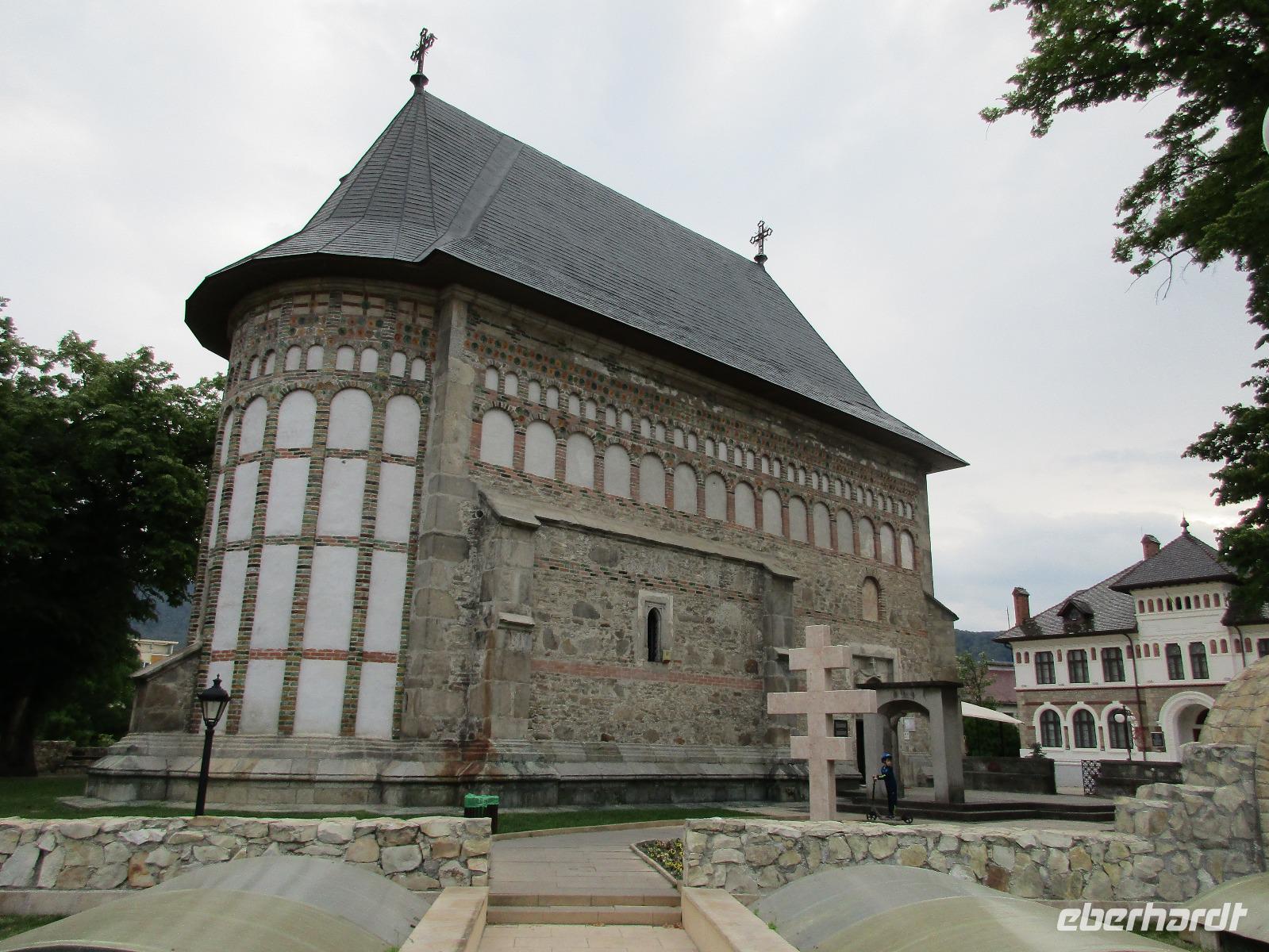 Heute treffen wir uns ohne Koffer am Bus denn wir werden eine weitere Nacht in Piatra Neamt verbringen, damit wir heute die wunderschönen Klöster der Moldauregion anschauen können. Es geht auch gleich nach dem Frühstück los und nach rund einer dreiviertel Stunde Fahrt erreichen wir das orthodoxe Nonnenkloster Agapaia. Mit unseren Audioguides im Ohr spazieren wir vorbei an den kleinen Häusern der Nonnen bis zum Eingang der Klosternanlage. Im Inneren der Anlage befindet sich eine schöne Gartenanlage, die von den Nonnen selbst gepflegt werden. So kommen wir in den Genuss, einer Nonne beim Rasenmähen zuzuschauen. Kernstück der Klosteranlage ist die hiesige Kirche, die im Inneren prunkvoll ausgestattet ist. Die Innenmalereien stammen vom bekannten rumänischen Maler Nicolae Grigorescu. Bei der anschließenden Freizeit am Kloster besichtigen wir einige Räume des Klosters und können auch selbstgemachte Schmuckstücke und Konfitüren käuflich erwerben. Unser nächstes Ziel ist das legendäre Kloster Voronet, welches wir nach rund 1,5 Stunden Fahrt erreichen. Entlang eines Basares erreichen wir diese Klosteranlage, die auf einer kleinen Anhöhe errichtet wurde. Prunkstück hier sind natürlich die Wandermalereien an der äußeren Seite der Kirche. Das bekannteste Kloster Rumäniens ist auch unter dem Beinamen Sixtinische Kapelle des Ostens bekannt. Das Innere der Kirche besticht durch seine Schlichtheit und doch wunderschönen, zahlreichen Malereien in kräftigen Farben. Besonders das Äußere der Westseite besticht, denn da ist auch einer sehr großen Fläche das Jüngste Gericht bildlich dargestellt. Corina erklärt uns einzelne Segmente davon, die von oben nach unten in fünf Abschnitte dargestellt sind. Ein wirklich beeindruckendes Kloster, dessen Besuch man absolute empfehlen muss. Nach einem kurzen Besuch auf dem vorherliegenden Friedhof bummeln wir langsam über den Basar zurück in Richtung Bus. Nico erwartet uns bereits, um uns zurück in die Stadt zu bringen, wo wir unsere Mittagspause verbringen. Einige meiner Gäste speisen im Hotelrestaurant, einige an einer Art Imbiss. Wieder andere spazieren durch den Ort und besuchen die Markthalle des Ortes, die man viel frischem Obst, Käse und Fleisch aufwartet. Auf jeden Fall auch einmal ein interessanter Einblick in das rumänische Leben. Bevor es zurück nach Pietra Neamt geht, besuchen wir das letzte Kloster für den heutigen Tag, Kloster Humor. Nicht ganz so imposant wie Kloster Voronet besticht aber auch dieses Kloster mit wunderbaren Außenmalereien, die auch das Innere verzieren. Kloster Humor ist allerdings auch etwas kleiner und irgendwie, meiner Meinung nach, auch etwas schlichter. Zum Abschluss gehen noch einige aus der Gruppe in die nebenanliegende Kirche. Schließlich setzen wir unseren Rückweg in Richtung Pietra Neamt fort. Leider verlässt uns nun der Segen des schönen Wetters und dunkle Wolken begleiten unseren Weg. Zurück in der Stadt hat sich der Himmel soweit zugezogen, dass dicke Regentropfen herunterfallen und somit das Vorhaben, mit der örtlichen Seilbahn zu fahren, nicht durchgeführt werden kann.