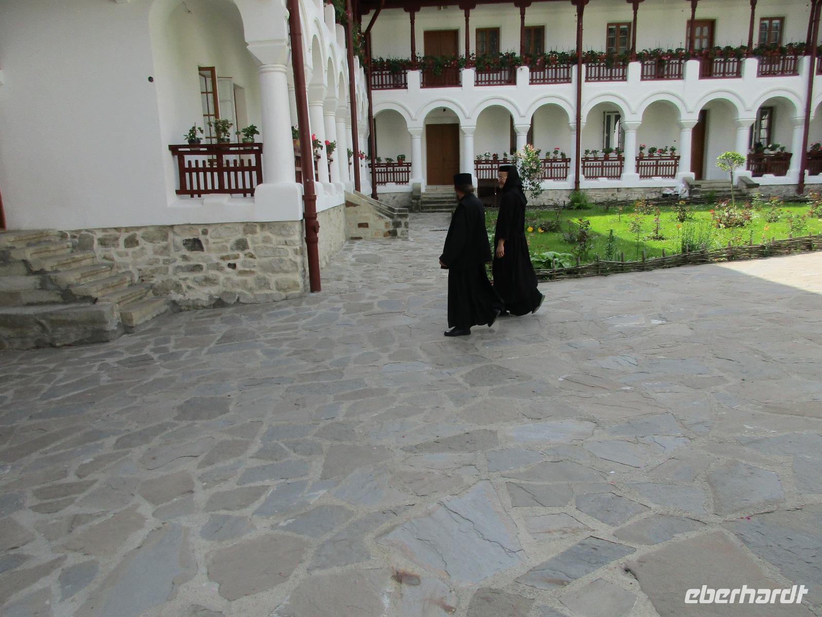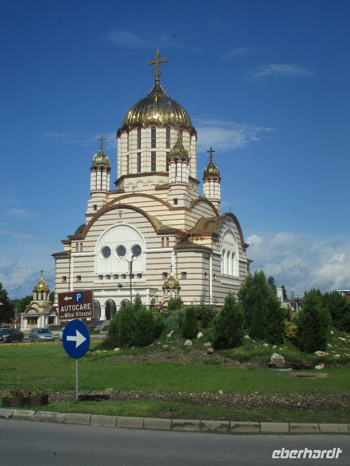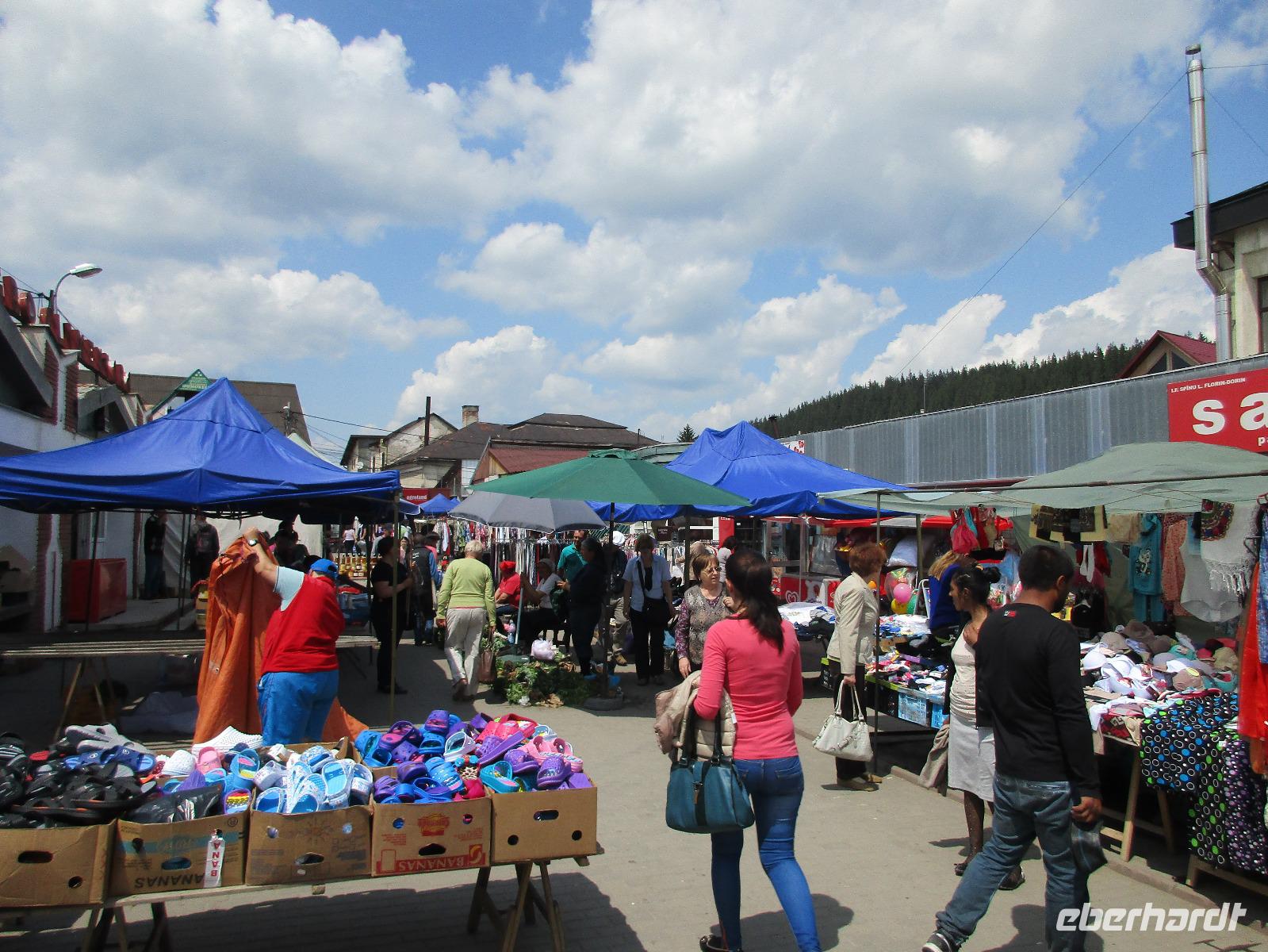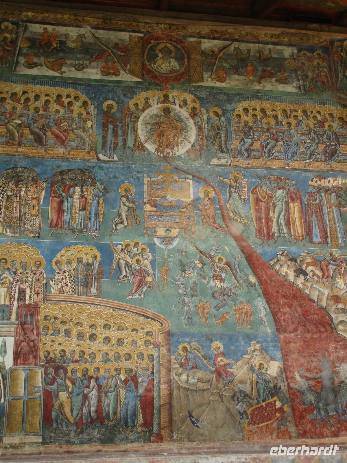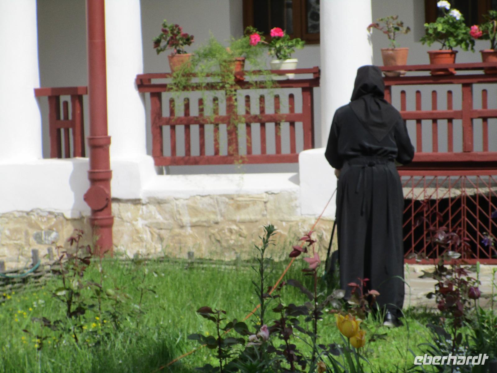 Heute treffen wir uns ohne Koffer am Bus denn wir werden eine weitere Nacht in Piatra Neamt verbringen, damit wir heute die wunderschönen Klöster der Moldauregion anschauen können. Es geht auch gleich nach dem Frühstück los und nach rund einer dreiviertel Stunde Fahrt erreichen wir das orthodoxe Nonnenkloster Agapaia. Mit unseren Audioguides im Ohr spazieren wir vorbei an den kleinen Häusern der Nonnen bis zum Eingang der Klosternanlage. Im Inneren der Anlage befindet sich eine schöne Gartenanlage, die von den Nonnen selbst gepflegt werden. So kommen wir in den Genuss, einer Nonne beim Rasenmähen zuzuschauen. Kernstück der Klosteranlage ist die hiesige Kirche, die im Inneren prunkvoll ausgestattet ist. Die Innenmalereien stammen vom bekannten rumänischen Maler Nicolae Grigorescu. Bei der anschließenden Freizeit am Kloster besichtigen wir einige Räume des Klosters und können auch selbstgemachte Schmuckstücke und Konfitüren käuflich erwerben. Unser nächstes Ziel ist das legendäre Kloster Voronet, welches wir nach rund 1,5 Stunden Fahrt erreichen. Entlang eines Basares erreichen wir diese Klosteranlage, die auf einer kleinen Anhöhe errichtet wurde. Prunkstück hier sind natürlich die Wandermalereien an der äußeren Seite der Kirche. Das bekannteste Kloster Rumäniens ist auch unter dem Beinamen Sixtinische Kapelle des Ostens bekannt. Das Innere der Kirche besticht durch seine Schlichtheit und doch wunderschönen, zahlreichen Malereien in kräftigen Farben. Besonders das Äußere der Westseite besticht, denn da ist auch einer sehr großen Fläche das Jüngste Gericht bildlich dargestellt. Corina erklärt uns einzelne Segmente davon, die von oben nach unten in fünf Abschnitte dargestellt sind. Ein wirklich beeindruckendes Kloster, dessen Besuch man absolute empfehlen muss. Nach einem kurzen Besuch auf dem vorherliegenden Friedhof bummeln wir langsam über den Basar zurück in Richtung Bus. Nico erwartet uns bereits, um uns zurück in die Stadt zu bringen, wo wir unsere Mittagspause verbringen. Einige meiner Gäste speisen im Hotelrestaurant, einige an einer Art Imbiss. Wieder andere spazieren durch den Ort und besuchen die Markthalle des Ortes, die man viel frischem Obst, Käse und Fleisch aufwartet. Auf jeden Fall auch einmal ein interessanter Einblick in das rumänische Leben. Bevor es zurück nach Pietra Neamt geht, besuchen wir das letzte Kloster für den heutigen Tag, Kloster Humor. Nicht ganz so imposant wie Kloster Voronet besticht aber auch dieses Kloster mit wunderbaren Außenmalereien, die auch das Innere verzieren. Kloster Humor ist allerdings auch etwas kleiner und irgendwie, meiner Meinung nach, auch etwas schlichter. Zum Abschluss gehen noch einige aus der Gruppe in die nebenanliegende Kirche. Schließlich setzen wir unseren Rückweg in Richtung Pietra Neamt fort. Leider verlässt uns nun der Segen des schönen Wetters und dunkle Wolken begleiten unseren Weg. Zurück in der Stadt hat sich der Himmel soweit zugezogen, dass dicke Regentropfen herunterfallen und somit das Vorhaben, mit der örtlichen Seilbahn zu fahren, nicht durchgeführt werden kann.