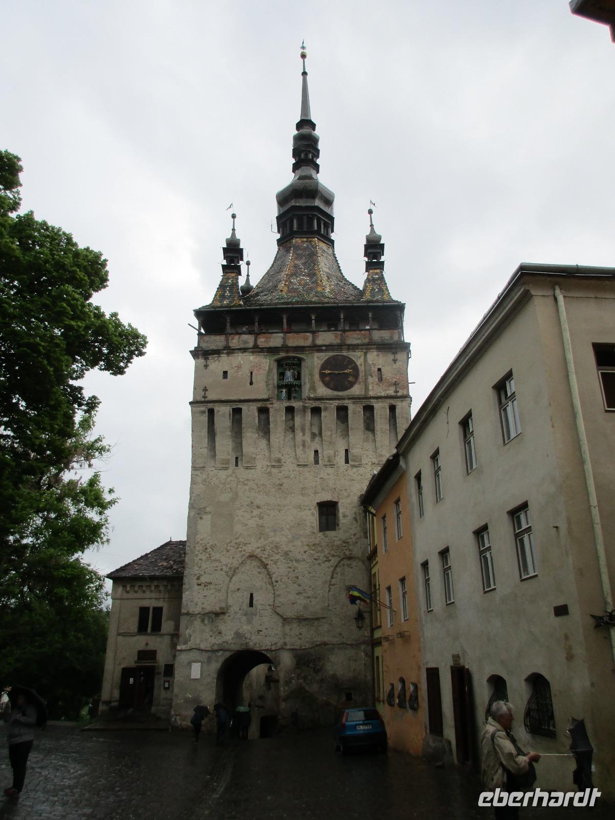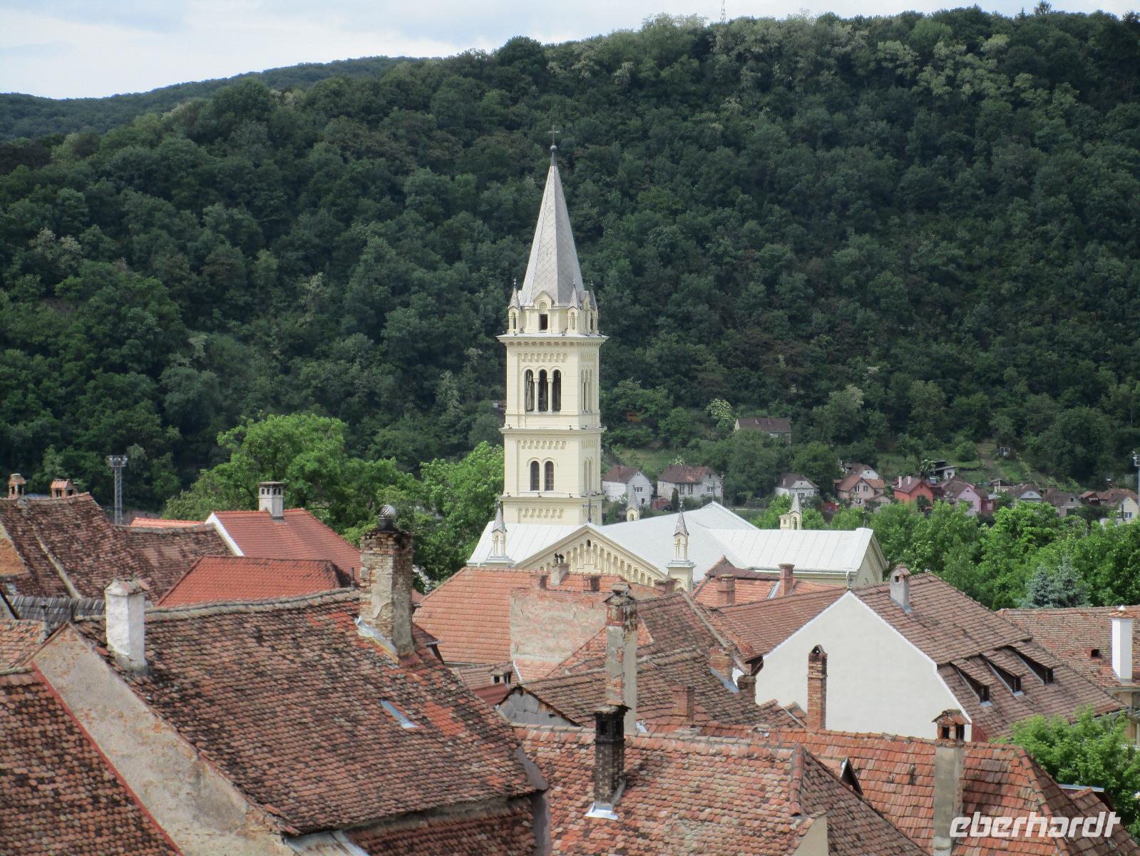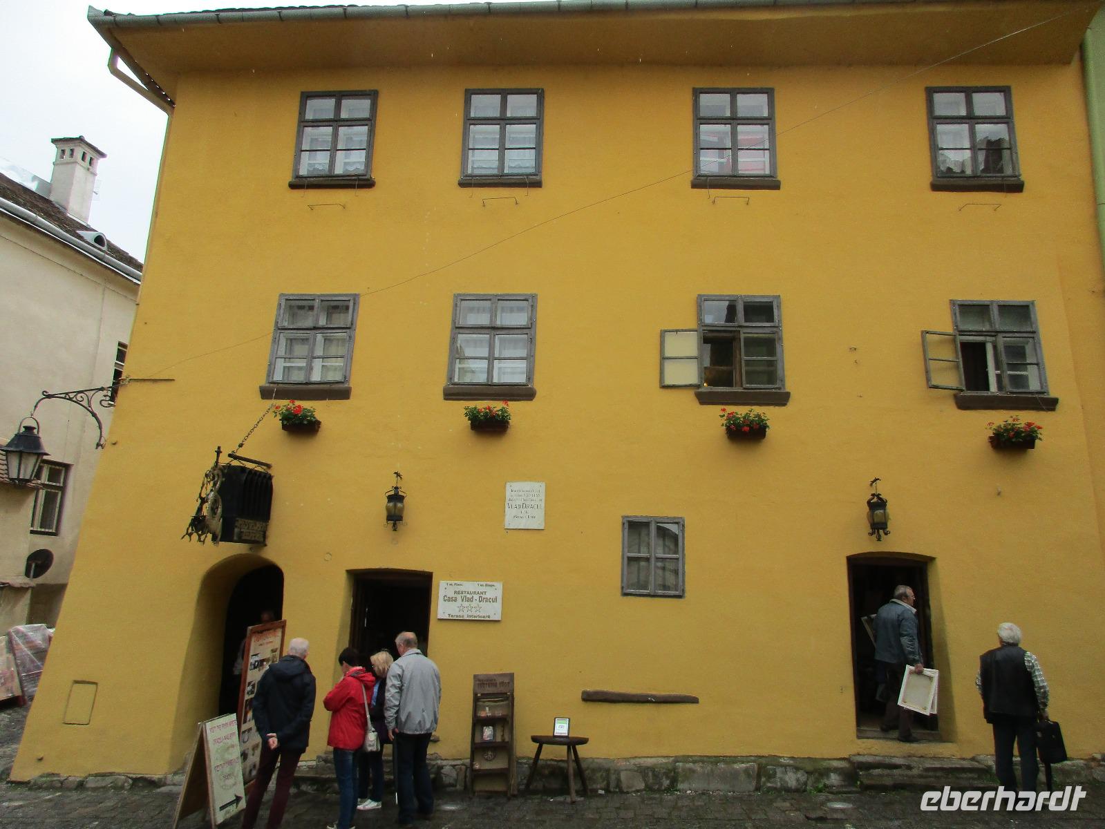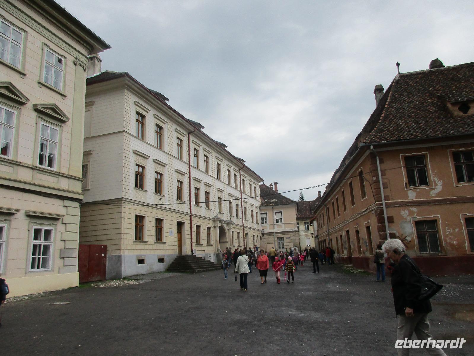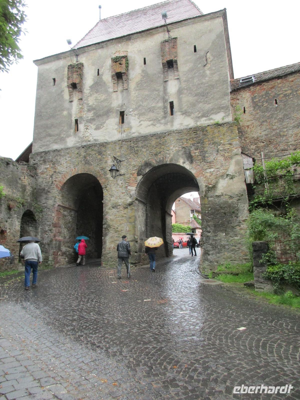 Ein weiterer Fahr-Tag liegt vor uns und wenn wir so in den Himmel schauen, ist es auch besser so, dass wir zunächst einmal im Bus sitzen werden. Einige Kilometer hinter Pietra Neamt öffnet sich langsam die Klamm der Bicaz vor uns. Aufgrund des Regens entscheiden Corina und ich uns dafür, hier leider nicht anzuhalten. Nico lenkt den Bus ruhig Kurve um Kurve durch die engen Straßen der Gebirgskette, die durch das Nass trotzdem irgendwie sehr grün wirkt. Damit wir aber nicht nur im Bus sitzen, halten wir schließlich am sogenannten Roten See, der zurzeit gar nicht rot ist. Wie legen hier am Ufer eine Pause ein, um den See, der dennoch romantisch wirkt, fotografieren zu können und um einige Andenken und Postkarten zu kaufen. Es geht weiter und Nico fährt uns durch das Seklerland, alte Siedlungen, die von den Ungarn geprägt sind. Besonders ihre herrlich, bunten Toren zu den Grundstücken beeindrucken uns und schließlich bekommen wir auch die Gelegenheit, eines dieser Tore zu fotografieren. Am zeitigen Nachmittag schließlich erreichen wir die Dracula-Stadt, Schäßburg und langsam wird auch das Wetter wieder besser. Nico lässt uns am Busparkplatz unterhalb der Burg aussteigen und gemeinsam besteigen wir den Hügel zum Burginneren. Hier eröffnet sich vor uns der Marktplatz der Stadt, um den sich herum eigentlich alles gliedert. Beim Rundgang um den Markt sehen wir das Wagner-Haus, das Sächsische Haus, eine Kirche, das neue Rathaus, natürlich eine Büste von Dracula, ein venezianisches Haus als auch das Geburtshaus von Dracula und den Stundturm. Wer kann und möchte, besteigt nun den doch etwas mühseligen Berg hoch hinauf zur Kirche (entweder über einen Pflasterweg oder mittels Stufen). Oben in der Kirche angekommen, erläutert uns ein Mitarbeiter des Ordens alle wichtigen Einzelheiten zur Kirche und deren Geschichte. Wir dürfen auch in die kleine Gruft hinab steigen. Bei der anschließenden Freizeit in Schäßburg nutzen einige die Möglichkeit, auf den Stundturm hinaufzusteigen und die wunderbare Aussicht von hier oben zu genießen. Aber auch im Geburtshaus von Dracula kommen wir auf unsere Kosten. Im zweiten Stock des Hauses in dunkler Ecke wartet im Sarg Dracula auf seine Gäste und erschreckt diese, auch wenn sie eigentlich erahnen, was gleich kommen wird;-). Nun geht auch dieser Tag zu Ende und wir fahren weiter nach Medias zu unserem Hotel mit dem komischen Namen „Binder Bubi".