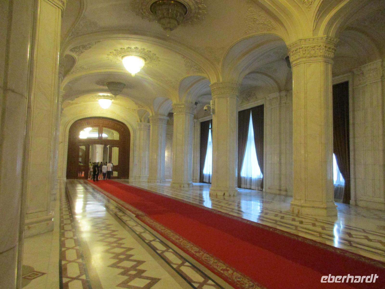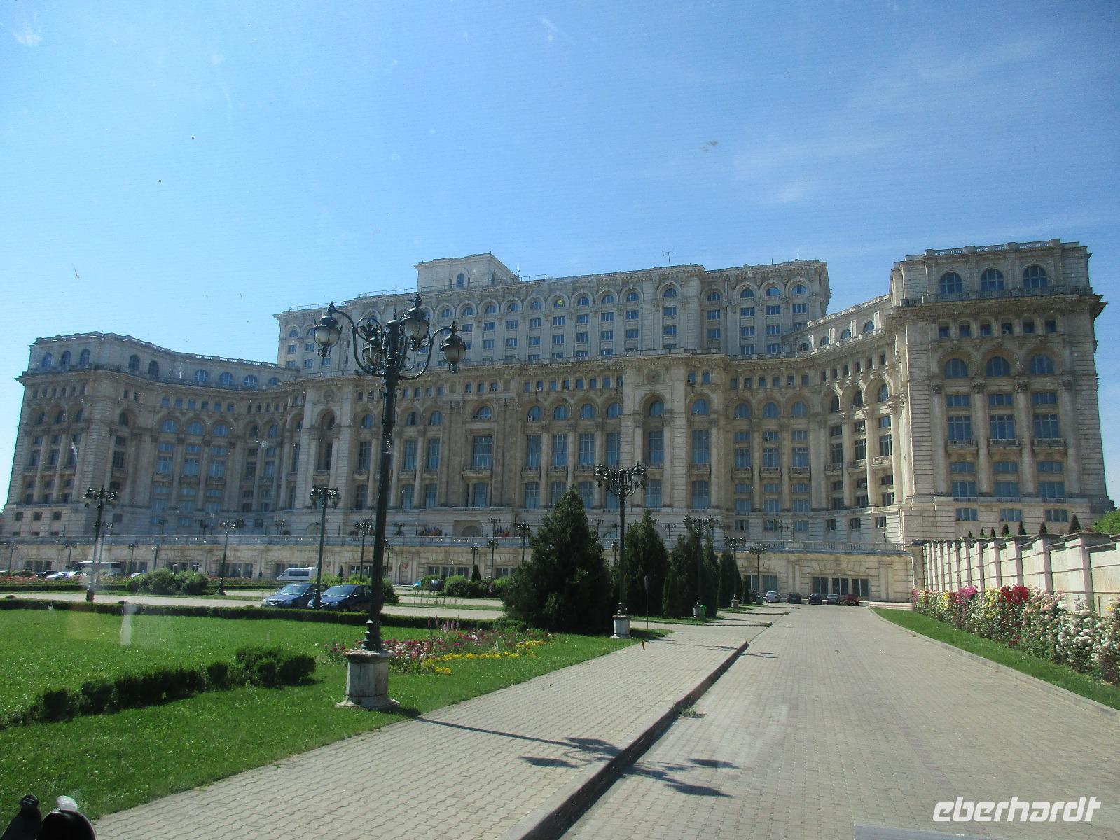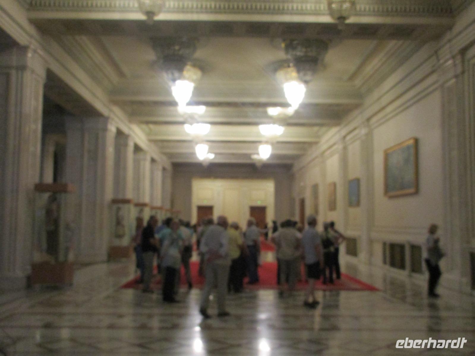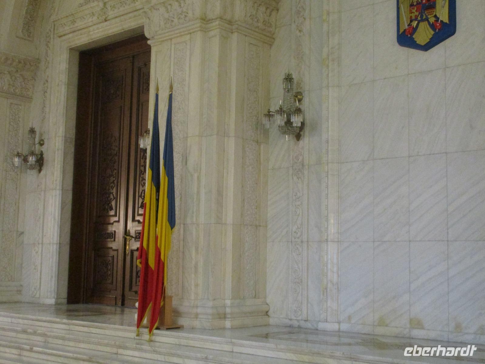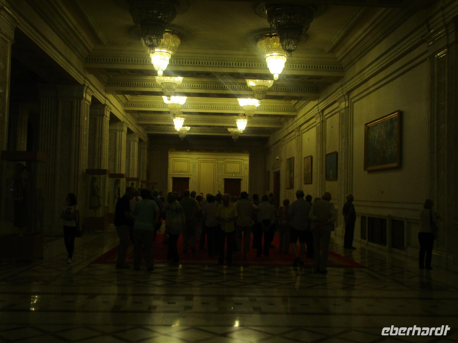 Der letzte Tag in Rumänien ist angebrochen. Nach dem Frühstück verabschiede mich von den ersten Gästen, die mit eigener Anreise angekommen sind und wegen ihrer Flugzeit eher am Tag zurück nach Hause fliegen. Wir verladen die Koffer und setzen mit der Stadtrundfahrt fort, die wir eine Woche zuvor begonnen hatten. Nochmals durch das Botschafterviertel fahren wir nun entlang der Siegerstra mit vielen namentlichen Hotelketten zum Revolutionsplatz der Stadt. Hier steigen wir aus und Corina erklärt uns die vielen Gebäude und Denkmäler, die hier ihren Platz gefunden haben. Danach haben wir noch ein wenig Zeit, um hier zu fotografieren. Danach geht es vorbei an einem militärischen Komplex hin zur staatlichen Institution, dem rumänischem Parlament. Auch wenn wir hier für 11 Uhr angemeldet sind und wir schon vor der Zeit da sind, heißt es leider warten. Mehrfach werde ich von den Mitarbeitern hier darauf hingewiesen, dass das Parlament kein Museum sondern eine Institution ist, die ihre eigenen Regeln hat, der wir uns unterordnen müssen. Jawohl, Sir;-). Als wir dann endlich dran sind, geben wir unsere Personaldokumente ab und werden wie am Flughafen durchleuchtet. Dann endlich gehen wir die imposanten Treppen hinauf und rund um jedes neue Ecke sind wir erstaunt und teilweise erschlagen von den riesigen Hallen und Sälen mit riesigen Gemälden an der Wand, großen Freitreppen, einen eigenen Musiksaal und und und. Kaum zu glauben, dass dieses riesige Gebäude, das zweitgrößte administrative Gebäude der Welt in relativ kurzer Zeit errichtet wurde. 11 Stockwerke hoch und drei Stockwerke unterhalb der Erde mit eigener Rennanlage ist doch schon mehr als imposant und deutet wahrlich auf den Größenwahn des ehemaligen Diktators Ceausescu hin. Man kann jedoch von Glück sprechen, dass die rumänische Bevölkerung dieses Bauwerk in der Wendezeit nicht zerstört hat, denn auf irgendeine Art und Weise ist es dennoch faszinierend. Nach rund einer Stunde Führung, bei der wir unserem Guide natürlich auch Fragen stellen können, verlassen wir das Gebäude und haben nun die Mittagspause an einem Park. Von hier aus kann man auch durch ein modernes Einkaufszentrum schlendern oder in die gegenüberliegende Altstadt spazieren. Letzter Punkt auf unserem Programm ist der Besuch der Patriachenkirche in Bukarest, die wir auch von Innen besichtigen. Auch diese Kirche besticht durch schöne Verzierungen und einem wundervollen Vorplatz. Nun heißt es Abschied nehmen, Abschied nehmen von Corina, Nico und Rumänien. Nachdem die beiden uns am Flughafen verabschiedet haben, beginnt unsere Heimreise nach Deutschland, die doch mit etwas Schwierigkeiten verbunden ist aufgrund der Gewitterlage am Frankfurter Flughafen. Trotz einiger Umstellungen kommen alle Gäste bis nach Dresden und Leipzig zurück und fahren anschließend nach Hause.