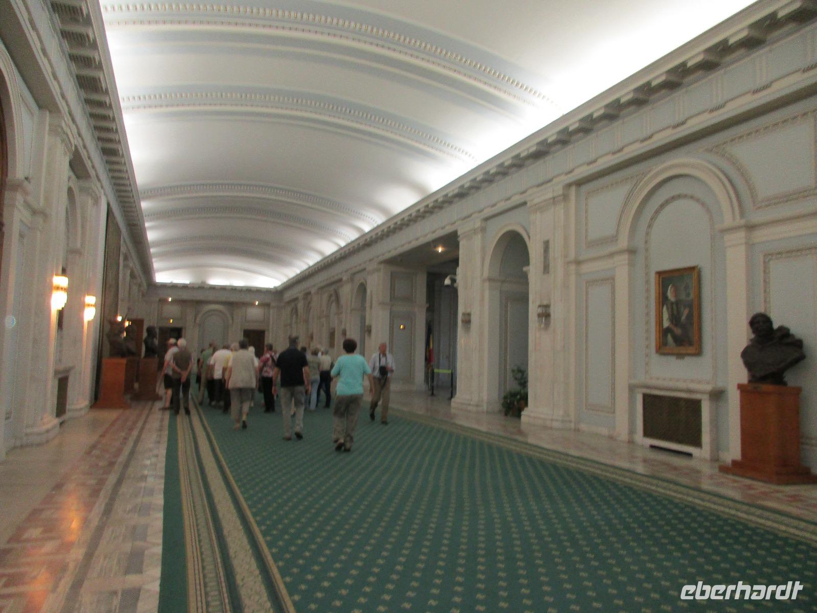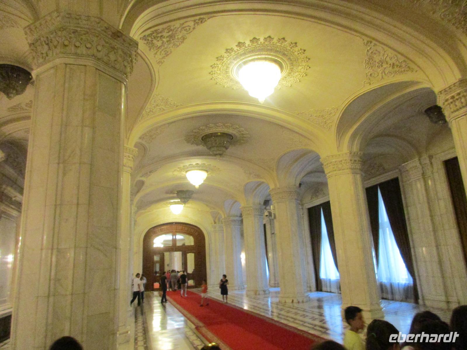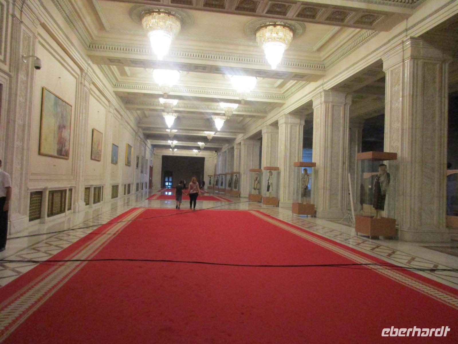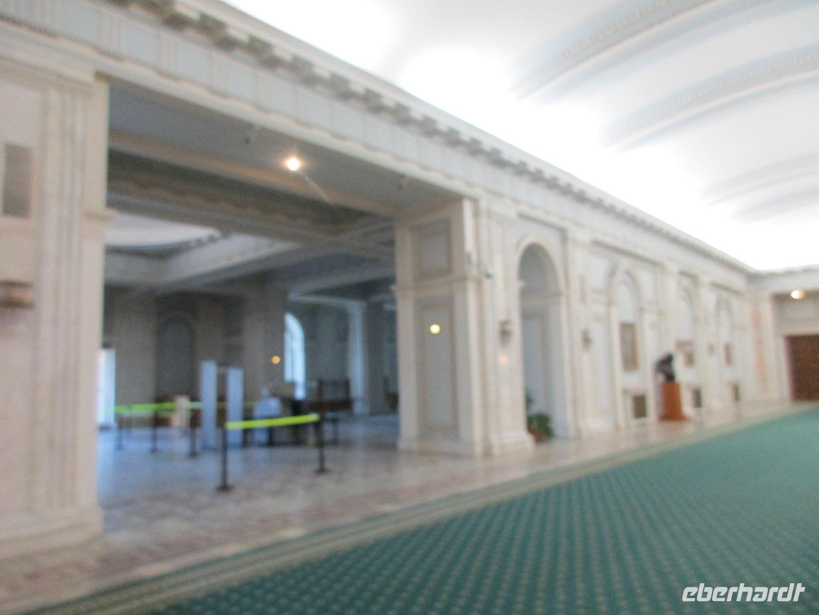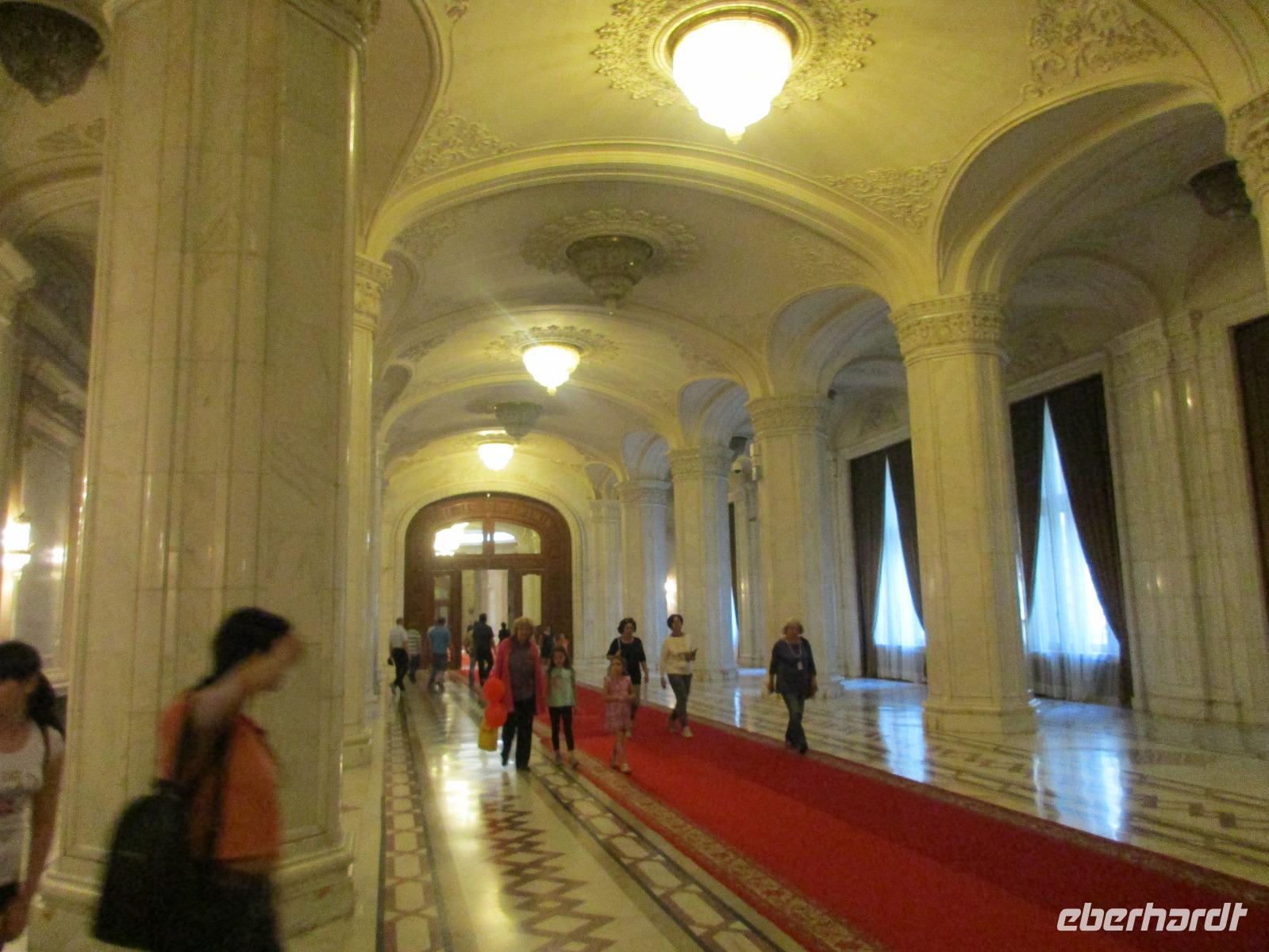 Der letzte Tag in Rumänien ist angebrochen. Nach dem Frühstück verabschiede mich von den ersten Gästen, die mit eigener Anreise angekommen sind und wegen ihrer Flugzeit eher am Tag zurück nach Hause fliegen. Wir verladen die Koffer und setzen mit der Stadtrundfahrt fort, die wir eine Woche zuvor begonnen hatten. Nochmals durch das Botschafterviertel fahren wir nun entlang der Siegerstra mit vielen namentlichen Hotelketten zum Revolutionsplatz der Stadt. Hier steigen wir aus und Corina erklärt uns die vielen Gebäude und Denkmäler, die hier ihren Platz gefunden haben. Danach haben wir noch ein wenig Zeit, um hier zu fotografieren. Danach geht es vorbei an einem militärischen Komplex hin zur staatlichen Institution, dem rumänischem Parlament. Auch wenn wir hier für 11 Uhr angemeldet sind und wir schon vor der Zeit da sind, heißt es leider warten. Mehrfach werde ich von den Mitarbeitern hier darauf hingewiesen, dass das Parlament kein Museum sondern eine Institution ist, die ihre eigenen Regeln hat, der wir uns unterordnen müssen. Jawohl, Sir;-). Als wir dann endlich dran sind, geben wir unsere Personaldokumente ab und werden wie am Flughafen durchleuchtet. Dann endlich gehen wir die imposanten Treppen hinauf und rund um jedes neue Ecke sind wir erstaunt und teilweise erschlagen von den riesigen Hallen und Sälen mit riesigen Gemälden an der Wand, großen Freitreppen, einen eigenen Musiksaal und und und. Kaum zu glauben, dass dieses riesige Gebäude, das zweitgrößte administrative Gebäude der Welt in relativ kurzer Zeit errichtet wurde. 11 Stockwerke hoch und drei Stockwerke unterhalb der Erde mit eigener Rennanlage ist doch schon mehr als imposant und deutet wahrlich auf den Größenwahn des ehemaligen Diktators Ceausescu hin. Man kann jedoch von Glück sprechen, dass die rumänische Bevölkerung dieses Bauwerk in der Wendezeit nicht zerstört hat, denn auf irgendeine Art und Weise ist es dennoch faszinierend. Nach rund einer Stunde Führung, bei der wir unserem Guide natürlich auch Fragen stellen können, verlassen wir das Gebäude und haben nun die Mittagspause an einem Park. Von hier aus kann man auch durch ein modernes Einkaufszentrum schlendern oder in die gegenüberliegende Altstadt spazieren. Letzter Punkt auf unserem Programm ist der Besuch der Patriachenkirche in Bukarest, die wir auch von Innen besichtigen. Auch diese Kirche besticht durch schöne Verzierungen und einem wundervollen Vorplatz. Nun heißt es Abschied nehmen, Abschied nehmen von Corina, Nico und Rumänien. Nachdem die beiden uns am Flughafen verabschiedet haben, beginnt unsere Heimreise nach Deutschland, die doch mit etwas Schwierigkeiten verbunden ist aufgrund der Gewitterlage am Frankfurter Flughafen. Trotz einiger Umstellungen kommen alle Gäste bis nach Dresden und Leipzig zurück und fahren anschließend nach Hause.