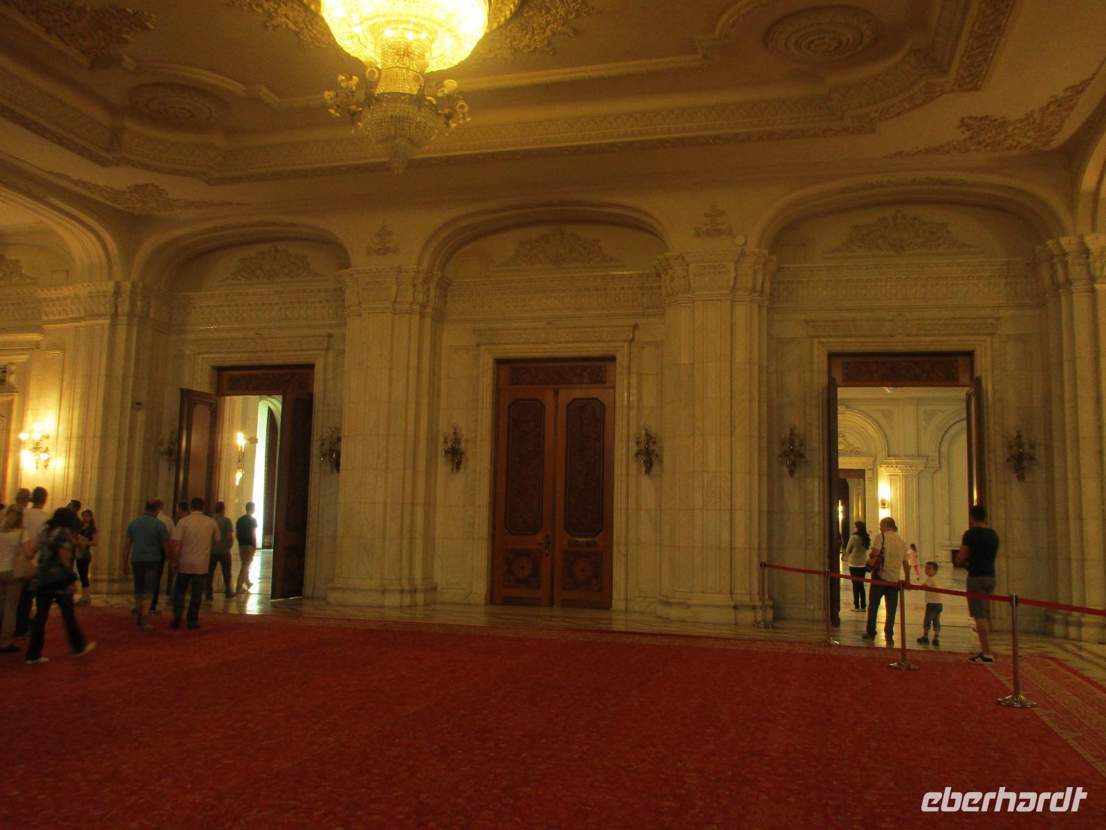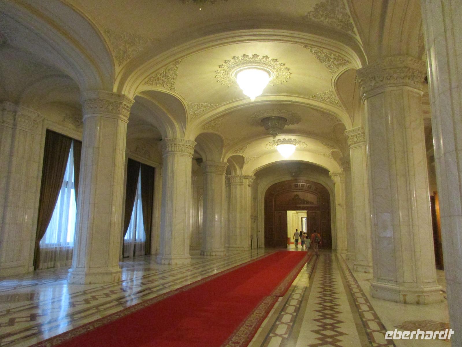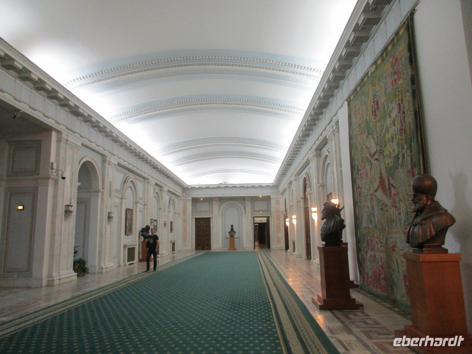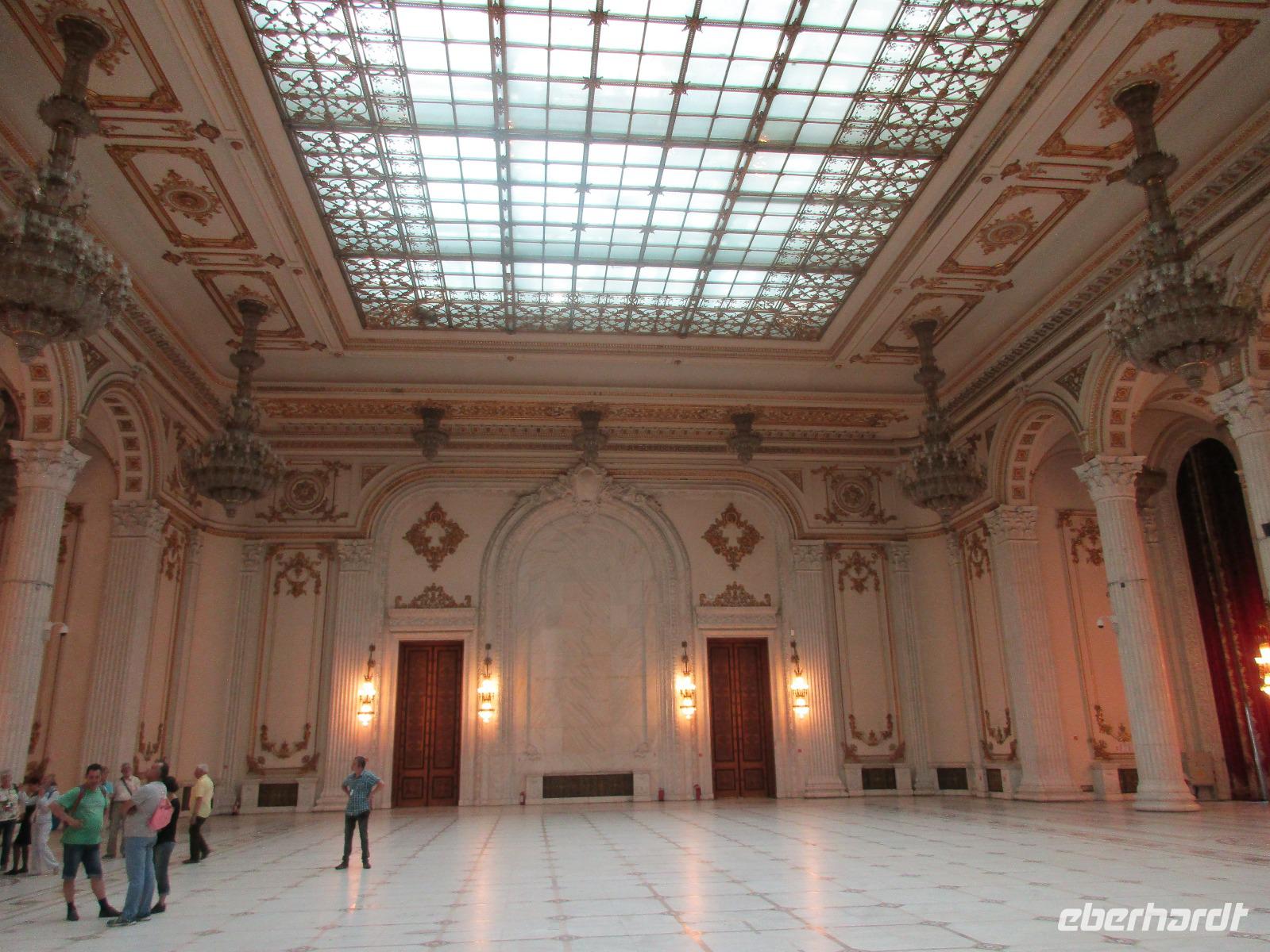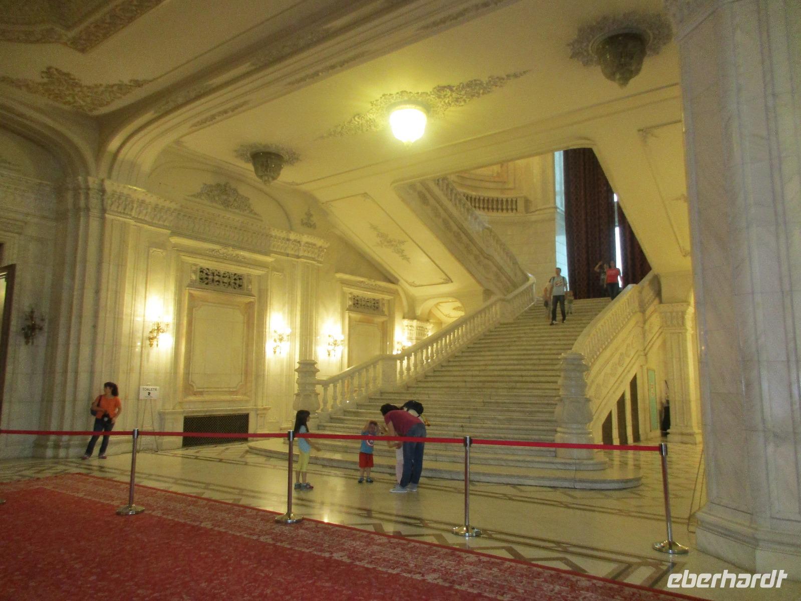 Der letzte Tag in Rumänien ist angebrochen. Nach dem Frühstück verabschiede mich von den ersten Gästen, die mit eigener Anreise angekommen sind und wegen ihrer Flugzeit eher am Tag zurück nach Hause fliegen. Wir verladen die Koffer und setzen mit der Stadtrundfahrt fort, die wir eine Woche zuvor begonnen hatten. Nochmals durch das Botschafterviertel fahren wir nun entlang der Siegerstra mit vielen namentlichen Hotelketten zum Revolutionsplatz der Stadt. Hier steigen wir aus und Corina erklärt uns die vielen Gebäude und Denkmäler, die hier ihren Platz gefunden haben. Danach haben wir noch ein wenig Zeit, um hier zu fotografieren. Danach geht es vorbei an einem militärischen Komplex hin zur staatlichen Institution, dem rumänischem Parlament. Auch wenn wir hier für 11 Uhr angemeldet sind und wir schon vor der Zeit da sind, heißt es leider warten. Mehrfach werde ich von den Mitarbeitern hier darauf hingewiesen, dass das Parlament kein Museum sondern eine Institution ist, die ihre eigenen Regeln hat, der wir uns unterordnen müssen. Jawohl, Sir;-). Als wir dann endlich dran sind, geben wir unsere Personaldokumente ab und werden wie am Flughafen durchleuchtet. Dann endlich gehen wir die imposanten Treppen hinauf und rund um jedes neue Ecke sind wir erstaunt und teilweise erschlagen von den riesigen Hallen und Sälen mit riesigen Gemälden an der Wand, großen Freitreppen, einen eigenen Musiksaal und und und. Kaum zu glauben, dass dieses riesige Gebäude, das zweitgrößte administrative Gebäude der Welt in relativ kurzer Zeit errichtet wurde. 11 Stockwerke hoch und drei Stockwerke unterhalb der Erde mit eigener Rennanlage ist doch schon mehr als imposant und deutet wahrlich auf den Größenwahn des ehemaligen Diktators Ceausescu hin. Man kann jedoch von Glück sprechen, dass die rumänische Bevölkerung dieses Bauwerk in der Wendezeit nicht zerstört hat, denn auf irgendeine Art und Weise ist es dennoch faszinierend. Nach rund einer Stunde Führung, bei der wir unserem Guide natürlich auch Fragen stellen können, verlassen wir das Gebäude und haben nun die Mittagspause an einem Park. Von hier aus kann man auch durch ein modernes Einkaufszentrum schlendern oder in die gegenüberliegende Altstadt spazieren. Letzter Punkt auf unserem Programm ist der Besuch der Patriachenkirche in Bukarest, die wir auch von Innen besichtigen. Auch diese Kirche besticht durch schöne Verzierungen und einem wundervollen Vorplatz. Nun heißt es Abschied nehmen, Abschied nehmen von Corina, Nico und Rumänien. Nachdem die beiden uns am Flughafen verabschiedet haben, beginnt unsere Heimreise nach Deutschland, die doch mit etwas Schwierigkeiten verbunden ist aufgrund der Gewitterlage am Frankfurter Flughafen. Trotz einiger Umstellungen kommen alle Gäste bis nach Dresden und Leipzig zurück und fahren anschließend nach Hause.