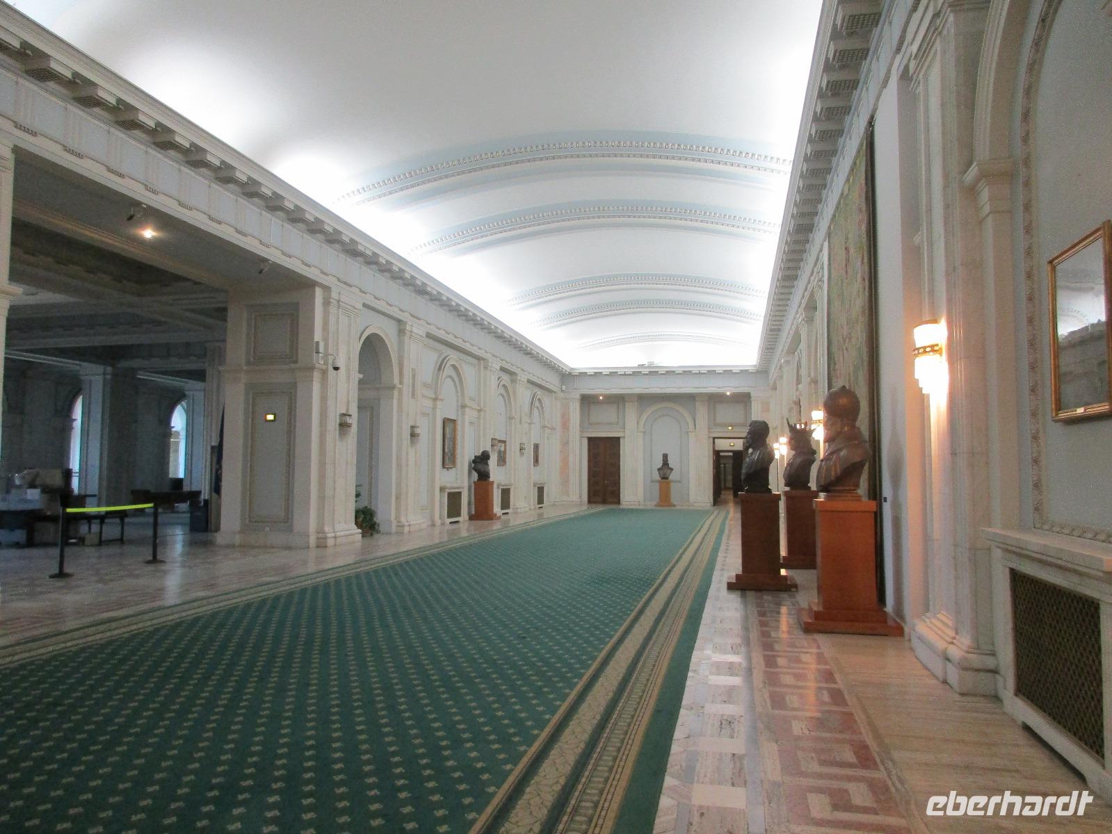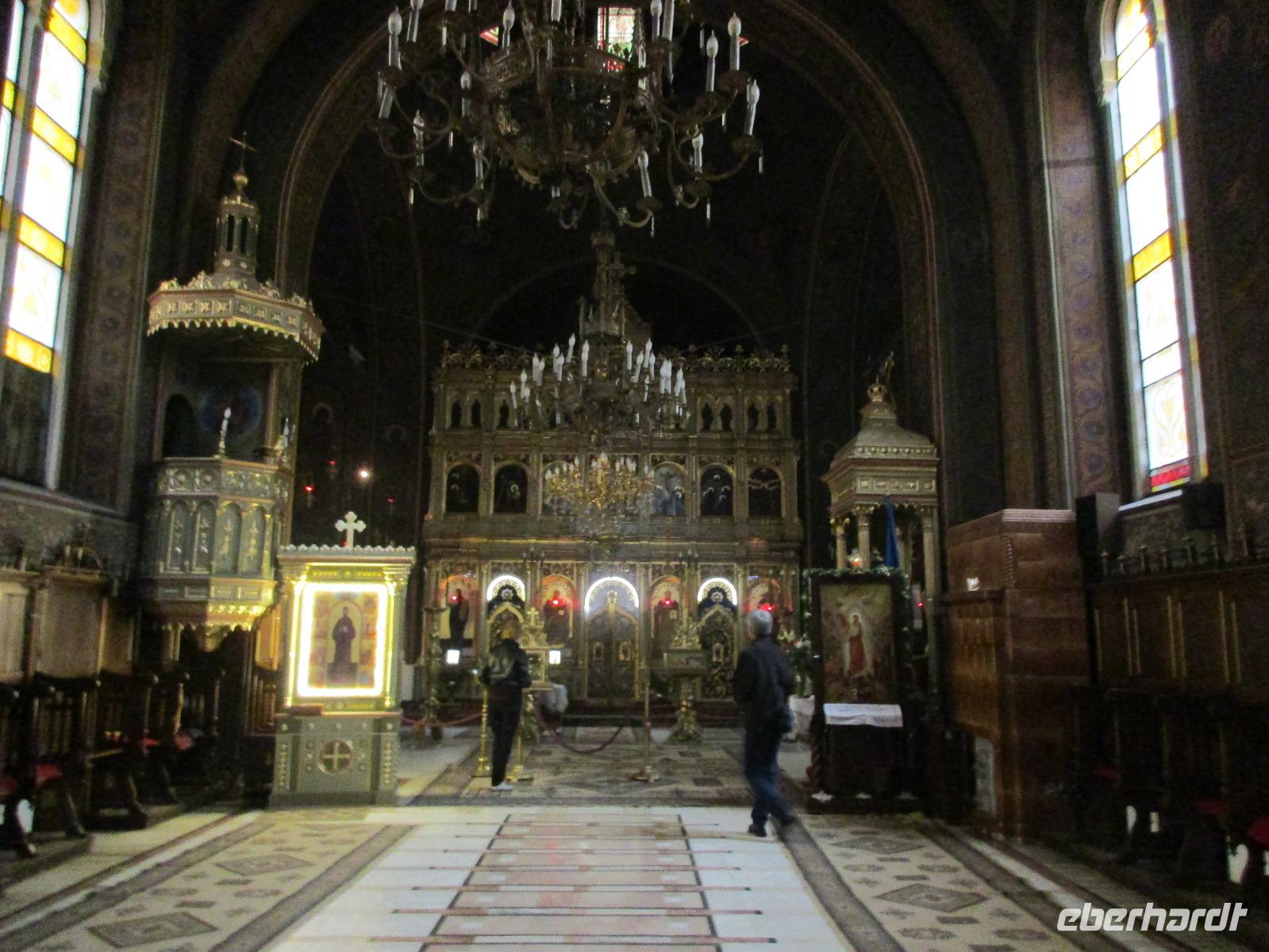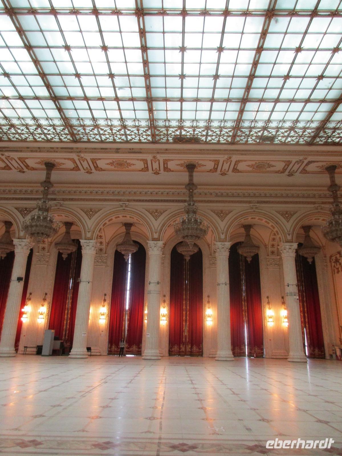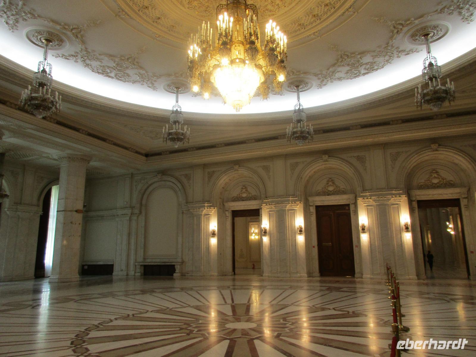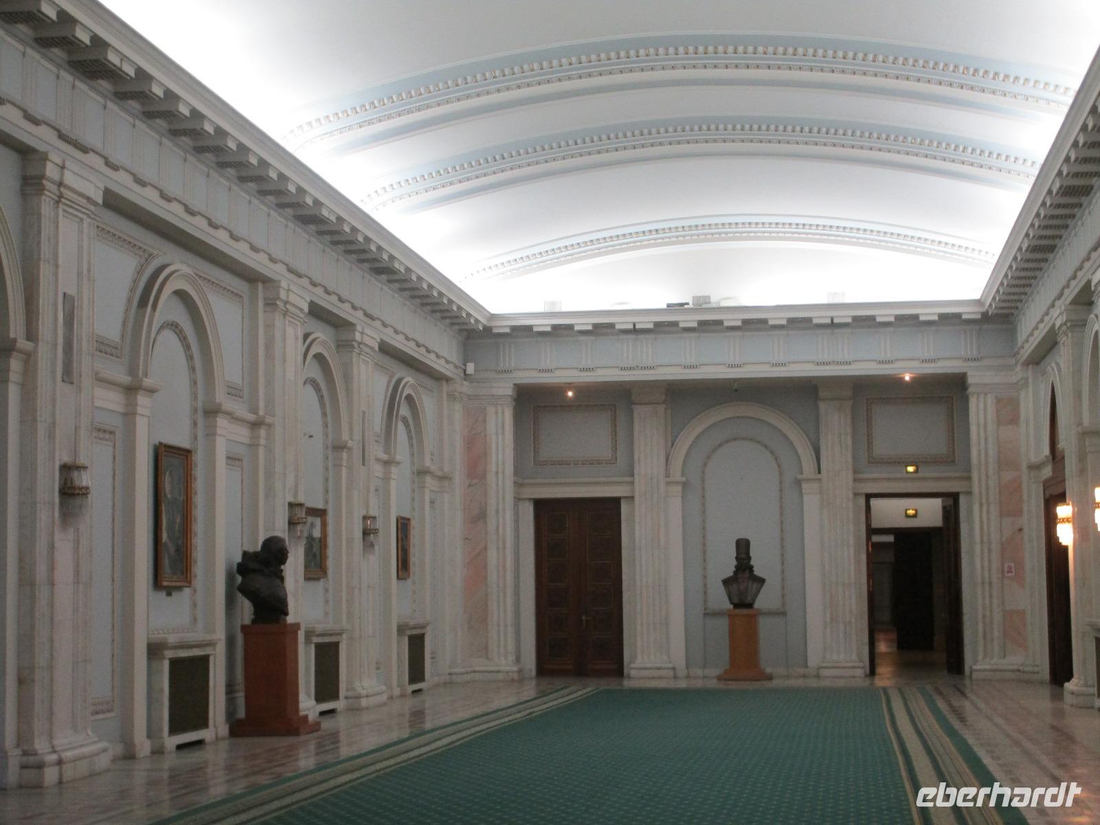 Der letzte Tag in Rumänien ist angebrochen. Nach dem Frühstück verabschiede mich von den ersten Gästen, die mit eigener Anreise angekommen sind und wegen ihrer Flugzeit eher am Tag zurück nach Hause fliegen. Wir verladen die Koffer und setzen mit der Stadtrundfahrt fort, die wir eine Woche zuvor begonnen hatten. Nochmals durch das Botschafterviertel fahren wir nun entlang der Siegerstra mit vielen namentlichen Hotelketten zum Revolutionsplatz der Stadt. Hier steigen wir aus und Corina erklärt uns die vielen Gebäude und Denkmäler, die hier ihren Platz gefunden haben. Danach haben wir noch ein wenig Zeit, um hier zu fotografieren. Danach geht es vorbei an einem militärischen Komplex hin zur staatlichen Institution, dem rumänischem Parlament. Auch wenn wir hier für 11 Uhr angemeldet sind und wir schon vor der Zeit da sind, heißt es leider warten. Mehrfach werde ich von den Mitarbeitern hier darauf hingewiesen, dass das Parlament kein Museum sondern eine Institution ist, die ihre eigenen Regeln hat, der wir uns unterordnen müssen. Jawohl, Sir;-). Als wir dann endlich dran sind, geben wir unsere Personaldokumente ab und werden wie am Flughafen durchleuchtet. Dann endlich gehen wir die imposanten Treppen hinauf und rund um jedes neue Ecke sind wir erstaunt und teilweise erschlagen von den riesigen Hallen und Sälen mit riesigen Gemälden an der Wand, großen Freitreppen, einen eigenen Musiksaal und und und. Kaum zu glauben, dass dieses riesige Gebäude, das zweitgrößte administrative Gebäude der Welt in relativ kurzer Zeit errichtet wurde. 11 Stockwerke hoch und drei Stockwerke unterhalb der Erde mit eigener Rennanlage ist doch schon mehr als imposant und deutet wahrlich auf den Größenwahn des ehemaligen Diktators Ceausescu hin. Man kann jedoch von Glück sprechen, dass die rumänische Bevölkerung dieses Bauwerk in der Wendezeit nicht zerstört hat, denn auf irgendeine Art und Weise ist es dennoch faszinierend. Nach rund einer Stunde Führung, bei der wir unserem Guide natürlich auch Fragen stellen können, verlassen wir das Gebäude und haben nun die Mittagspause an einem Park. Von hier aus kann man auch durch ein modernes Einkaufszentrum schlendern oder in die gegenüberliegende Altstadt spazieren. Letzter Punkt auf unserem Programm ist der Besuch der Patriachenkirche in Bukarest, die wir auch von Innen besichtigen. Auch diese Kirche besticht durch schöne Verzierungen und einem wundervollen Vorplatz. Nun heißt es Abschied nehmen, Abschied nehmen von Corina, Nico und Rumänien. Nachdem die beiden uns am Flughafen verabschiedet haben, beginnt unsere Heimreise nach Deutschland, die doch mit etwas Schwierigkeiten verbunden ist aufgrund der Gewitterlage am Frankfurter Flughafen. Trotz einiger Umstellungen kommen alle Gäste bis nach Dresden und Leipzig zurück und fahren anschließend nach Hause.