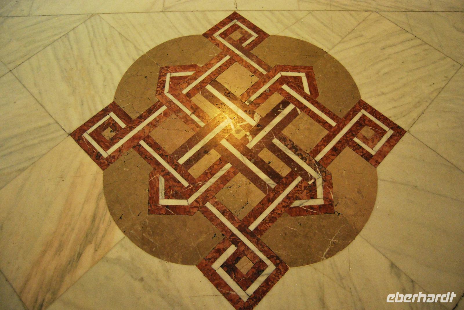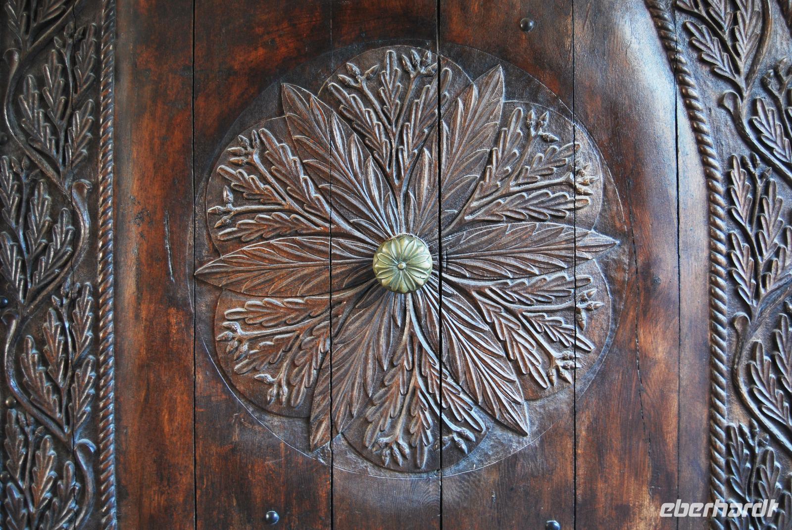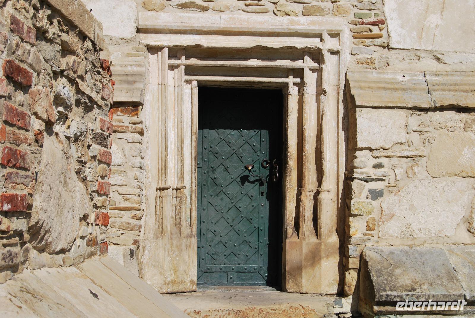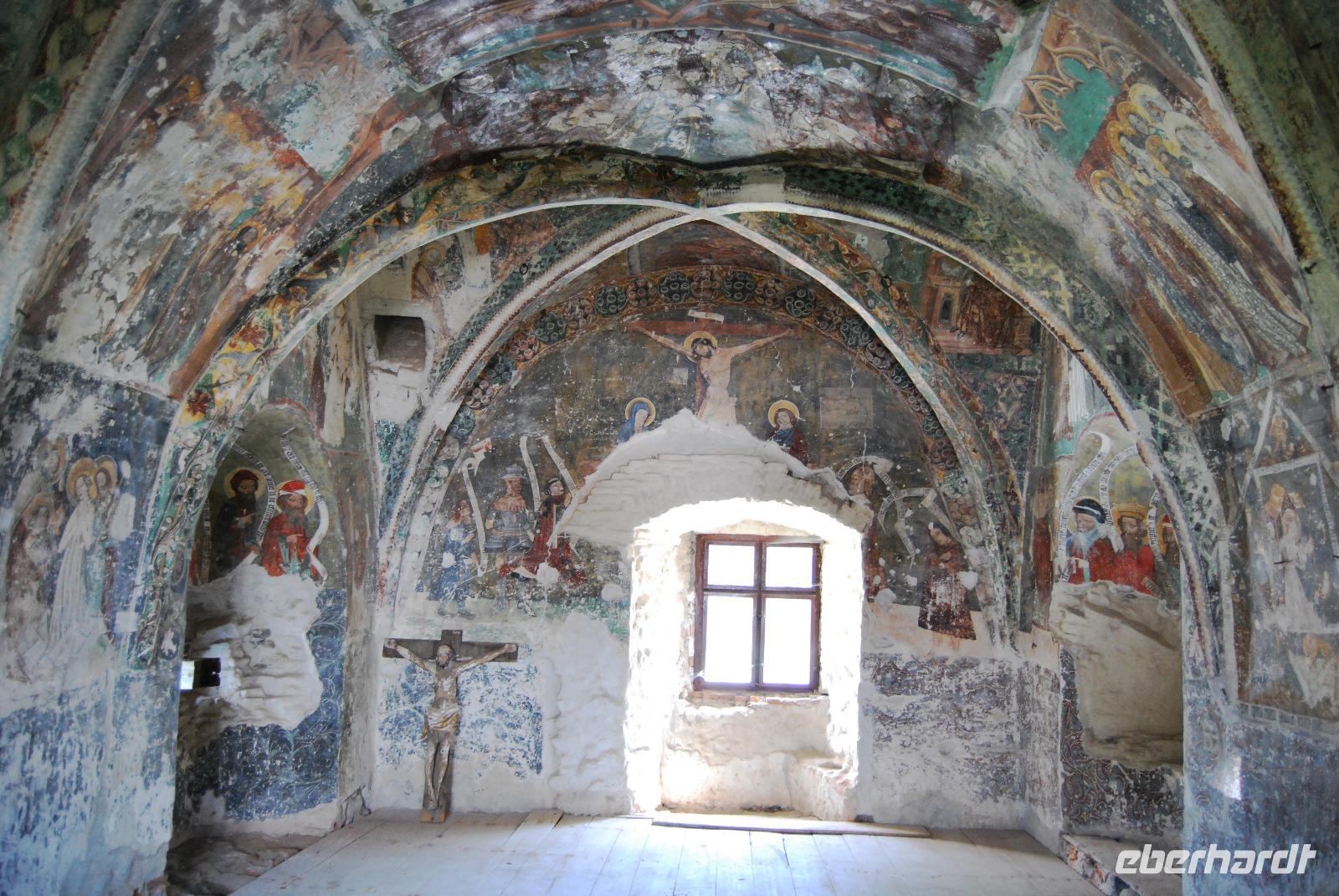 Oben ist ein Auge zu sehen. Es symbolisiert den Gott der alles sieht, und ist auch ein Zeichen der Dreifaltigkeit. Wir waren also unter ständiger Beobachtung, nicht nur von den Mönchen. Der Stil der Kirche ist aus mehreren kombiniert - dem byzantinischen Stil und dem gotischen. Wir fanden in der Kirche Malereien aus dem 15. Jahrhundert, doch die Ursprünge gehen noch viel weiter zurück. 1376 wurde hier eine Schule für Kalligraphie eingerichtet. Sie reichte noch bis Anfang des 19. Jahrhunderts und wurde dann erst vom Buchdruck abgelöst.