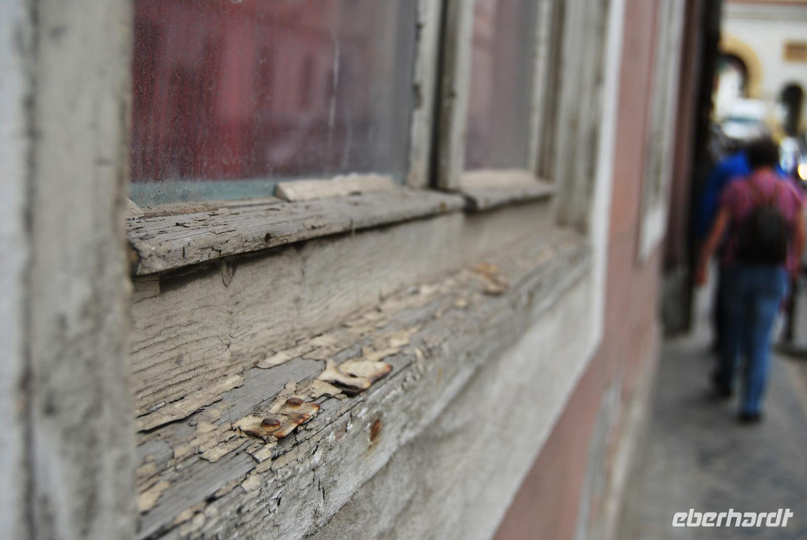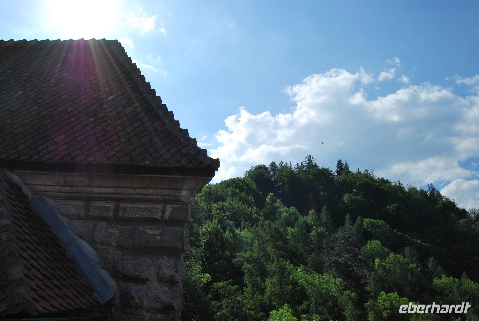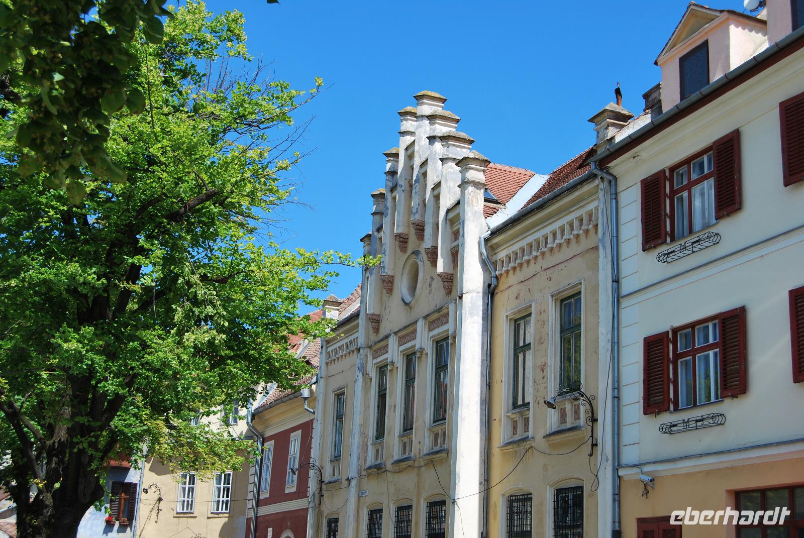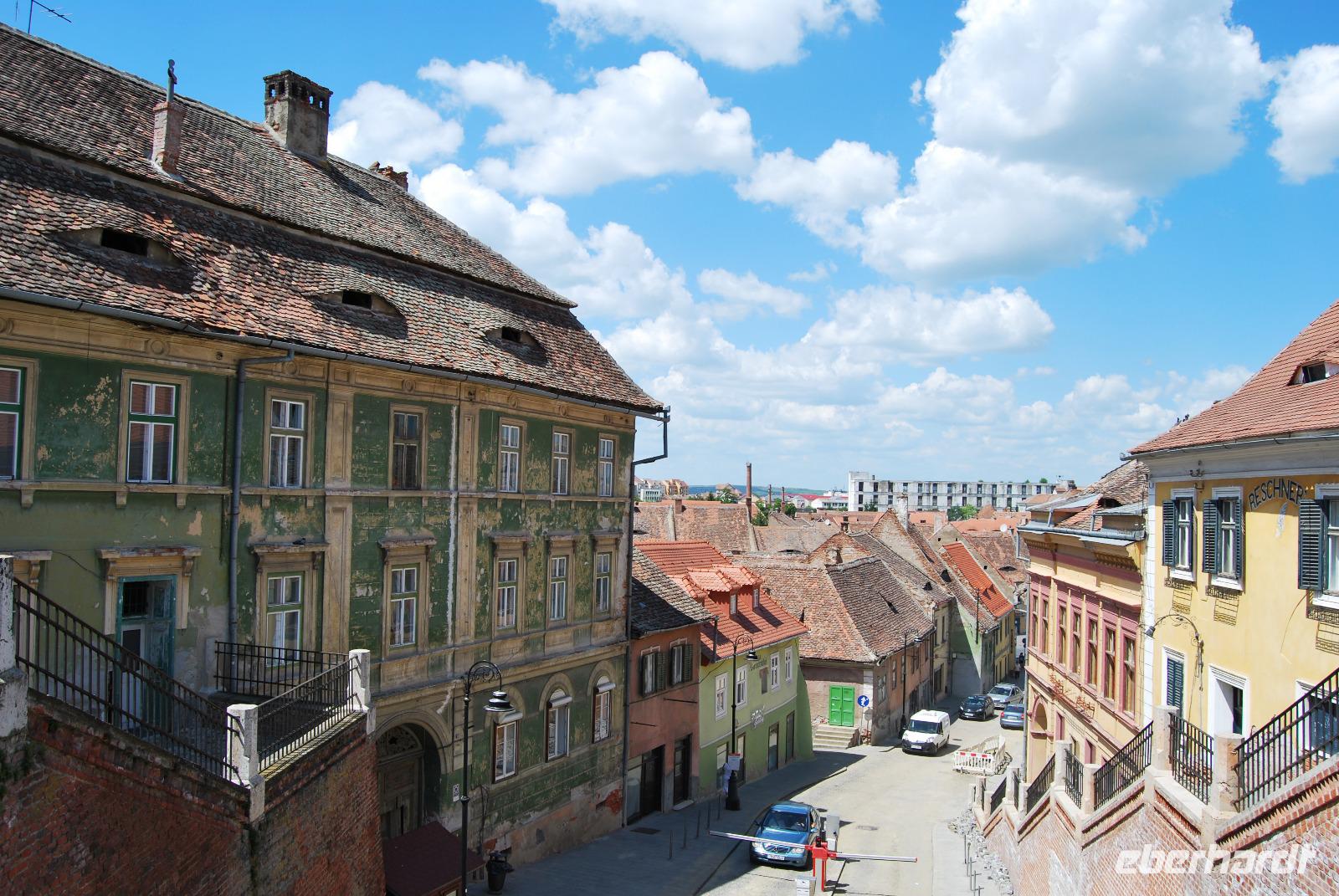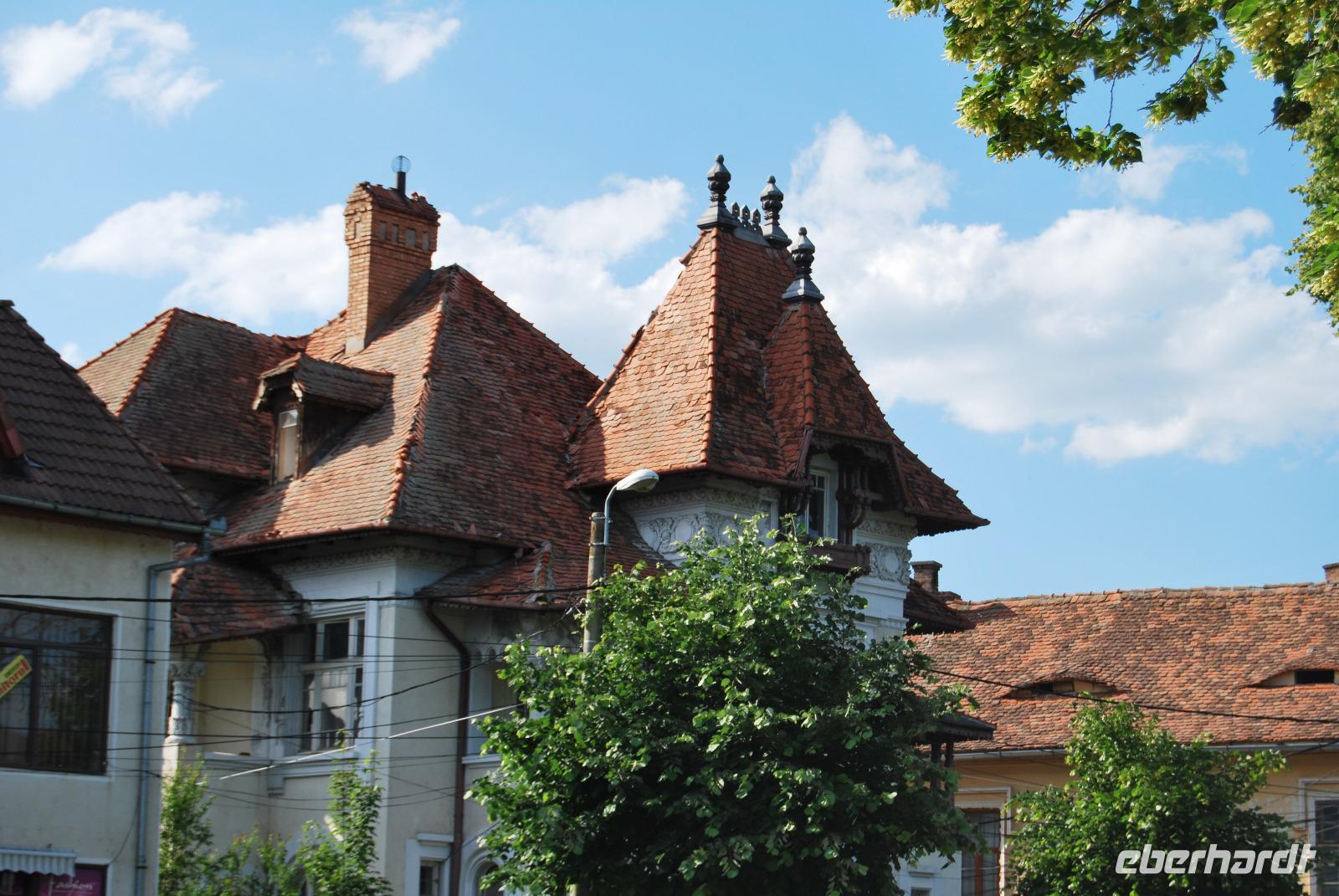 Nach dieser Stärkung starteten wir unseren Stadtrundgang. Wir besichtigten die evangelische Stadtpfarrkirche und die Lügenbrücke, die Ende des 19. Jahrhunderts in der Friedrichshütte in Hessen hergestellte wurde und damit die alte Holzbrücke ersetzte. Sie war die erste Brücke in der Stadt die nicht auf Pfeilern erbaut wurde und damit auch Liege-Brücke genannt wurde. Durch die Sprache wurde daraus auch schnell eine Lügenbrücke wozu man auch schnell ein paar Sagen und Legenden hatte. Hinter der Brücke stand auch ein sehr ansehnliches Haus wo man auch gut die Ziegel auf dem Dach sowie die Dachaugen bewundern konnte, denn diese sind schon eine Besonderheit der Stadt. Die Dachaugen nämlich gibt es in keiner anderen Stadt in Rumänien. Und auch die Ziegel, in dieser Art hatten wir sie häufig auch in Deutschland - wurden bei uns in der Heimat längst von den modernen verdrängt.