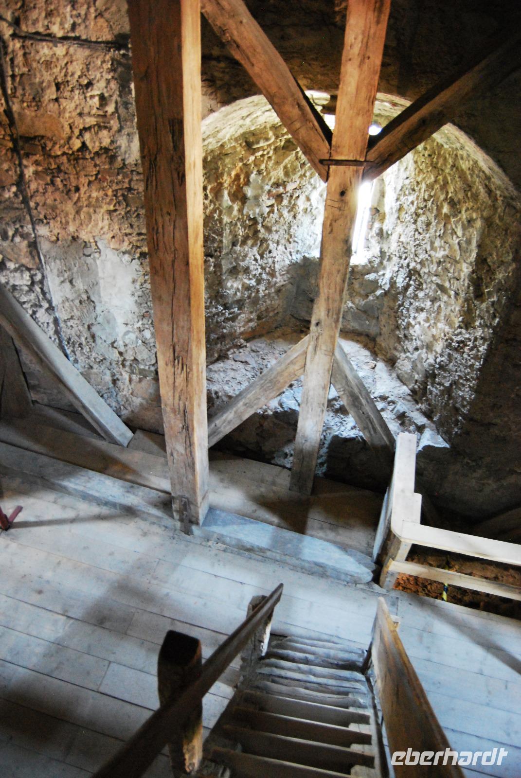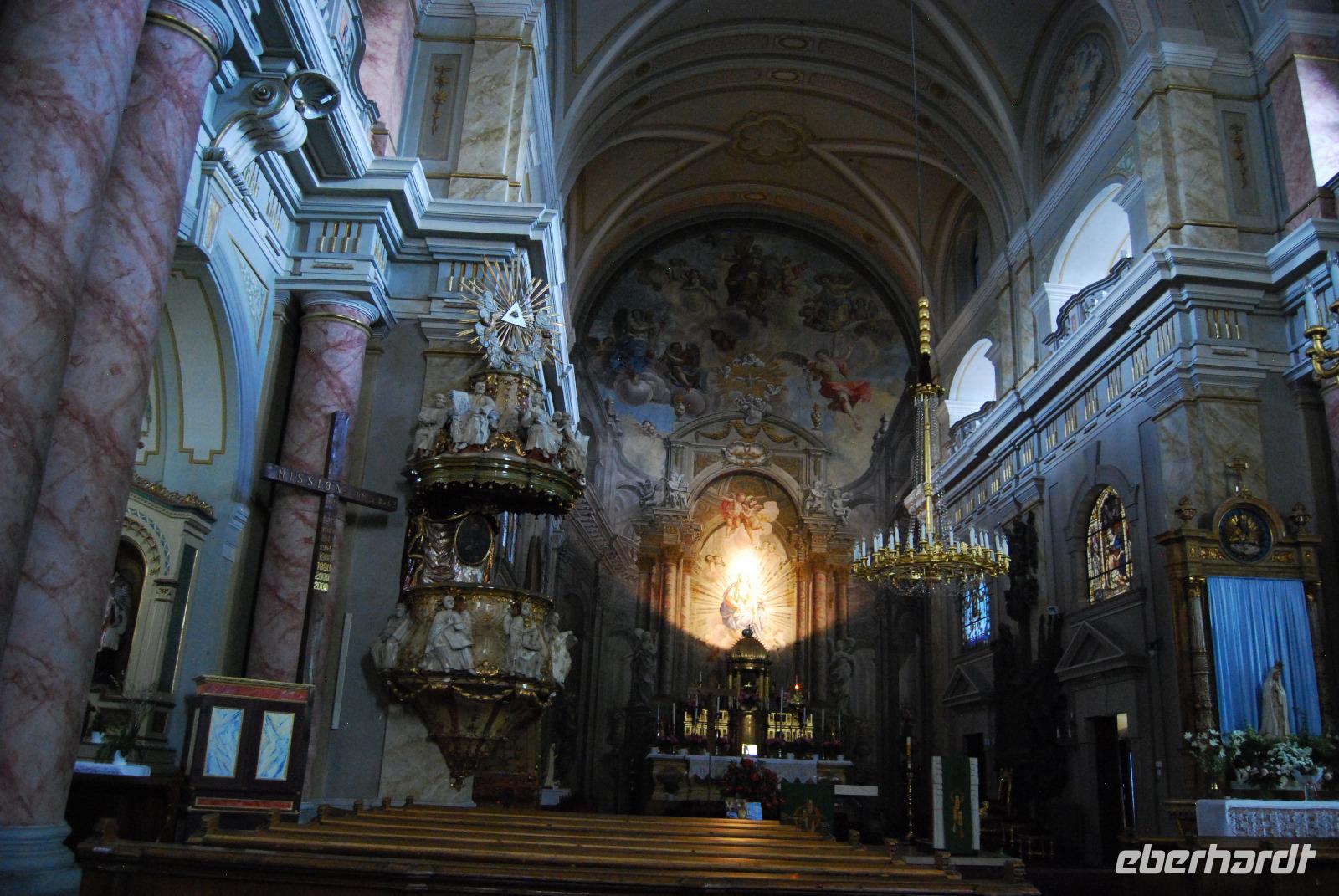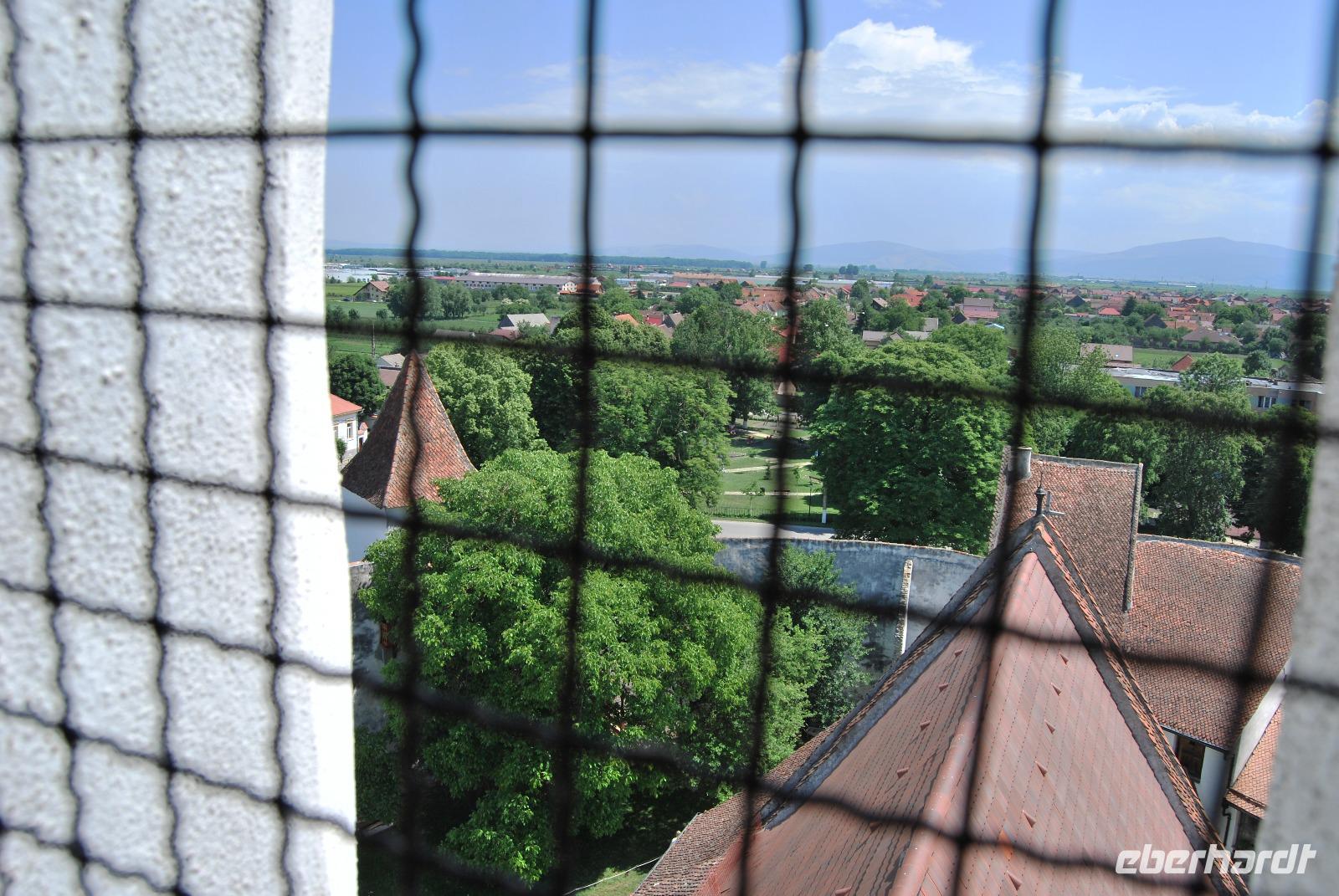 Kurz vor elf Uhr kamen wir in Medias bei angenehmen 25°C, Sonnenschein und blauem Himmel an. Wir besichtigten die Margarethenkirche, die zu den bedeutendsten spätgotischen Kirchenburgen der Siebenbürger Sachsens zählt. Jeden Sonntag werden hier noch heute Gottesdienste abgehalten - immer in deutscher Sprache. Aber auch einmal im Monat auf Rumänisch. Heute zählte die Gemeinde rund 700 Mitglieder. Wie auch in den meisten geschichtlichen Brennpunkten gab es auch hier stetige Veränderungen. So zählt man die Kirche zum gotischen Stil, die Orgel ist im Barock und das Taufbecken stammt aus dem 14. Jahrhundert und ist daher sehr besonders und wertvoll, worauf die Mitglieder der Gemeinde stolz sein können. Eine interessante Erfindung die uns begeisterte waren die klappbaren Kirchenbänke, mit denen man sich schnell drehen konnte und in die entsprechende Richtung des Redners blicken konnte.