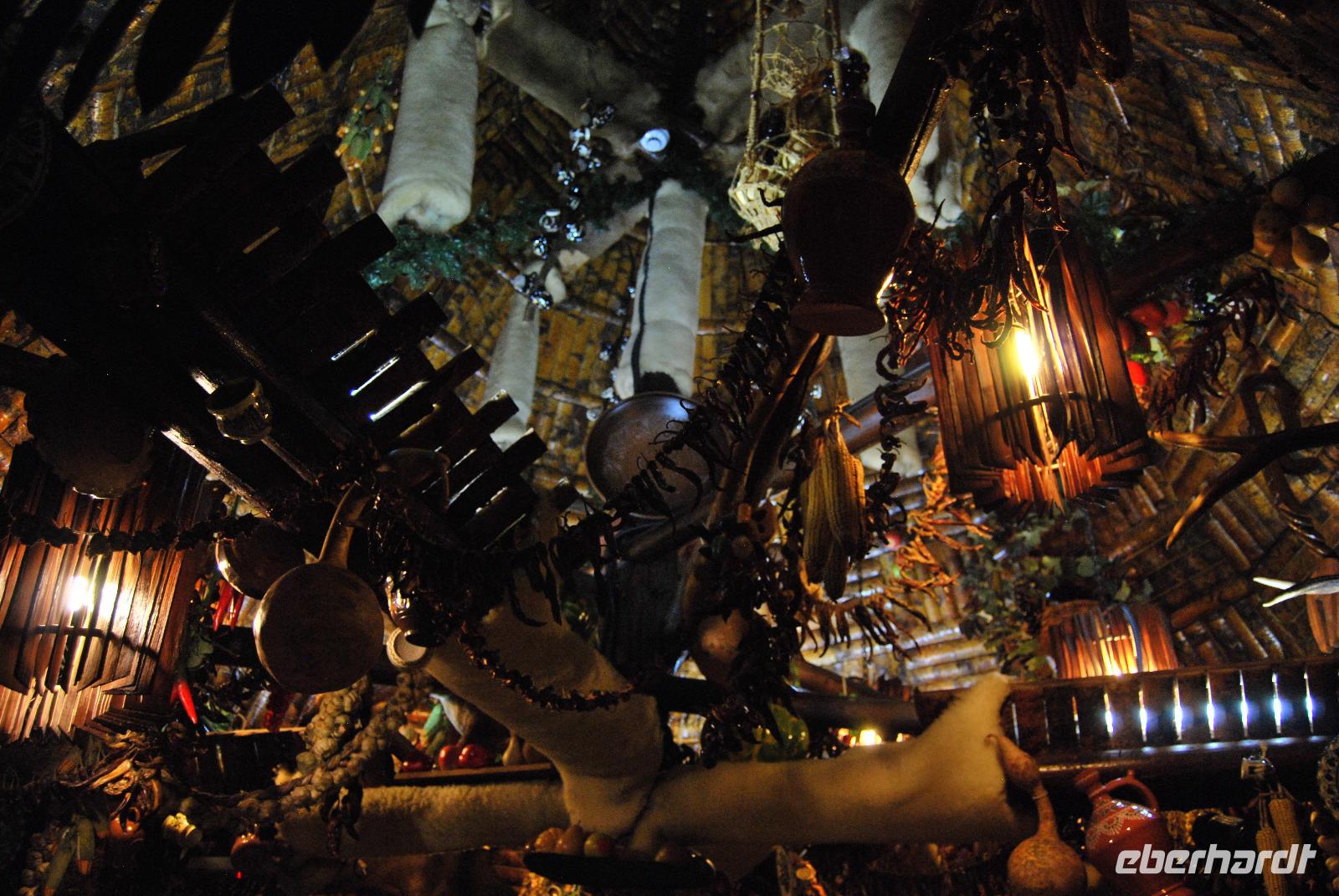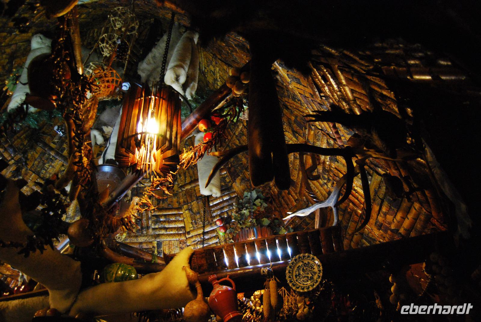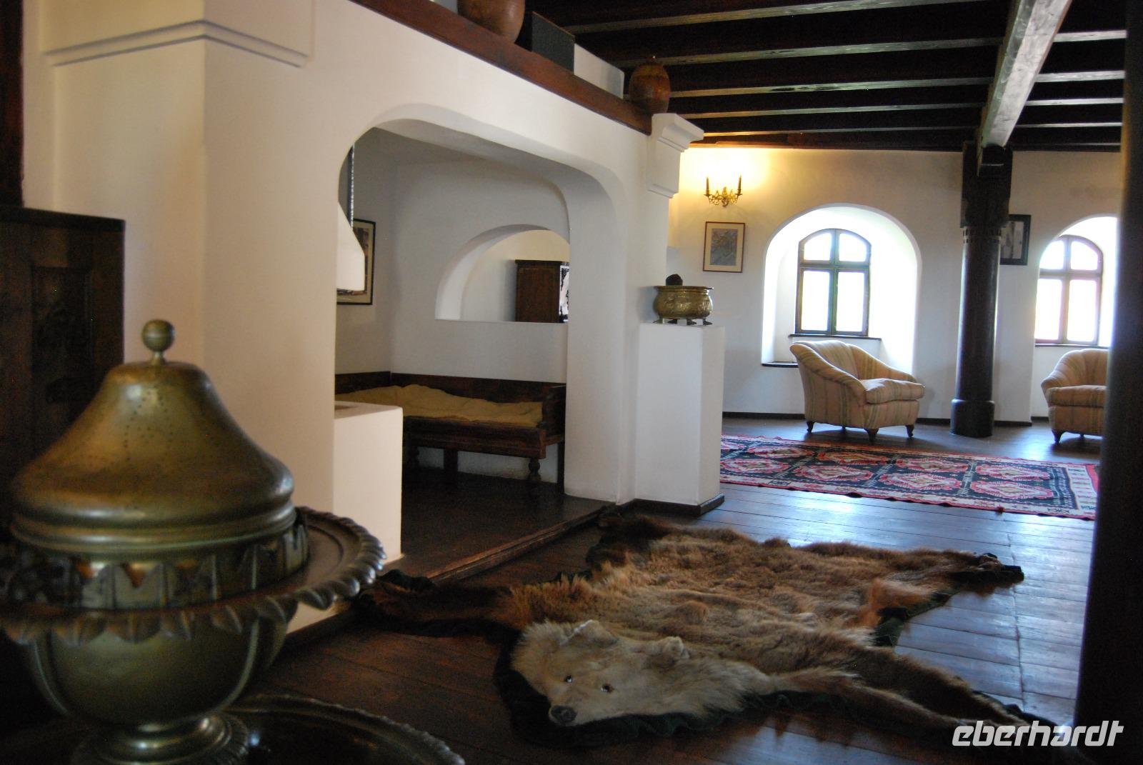 Gegen Abend erreichten wir unser Hotel in Kronstadt, Brasov. Gleich danach ging es aber wieder los. Wir hatten noch einen Termin im Skigebiet Poiana Brasov. Dort erwartete uns eine urige Mahlzeit in einer hölzernen Berghütte. Bis zum Ende der spitzzulaufenden Decke gab es zahlreiche Utensilien, von getrockneten Paprikaschoten, Knoblauch, Handwerksgeräten aber auch Felle und ausgestopfte Vögel und Jagdtrophäen. Eben eine richtige Waldhütte. Die Wände waren mit Rinde verkleidet und wir saßen auf flauschigem Schafsfell. Vier Musiker unterhielten uns mit landestypischer Musik. In der Hütte verweilten wir dann noch ein bisschen und ließen uns das würzige Essen sowie den Wein schmecken.