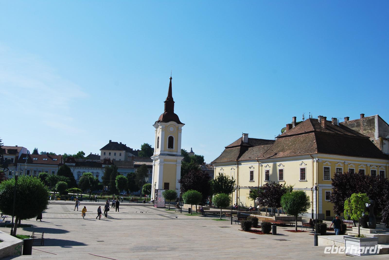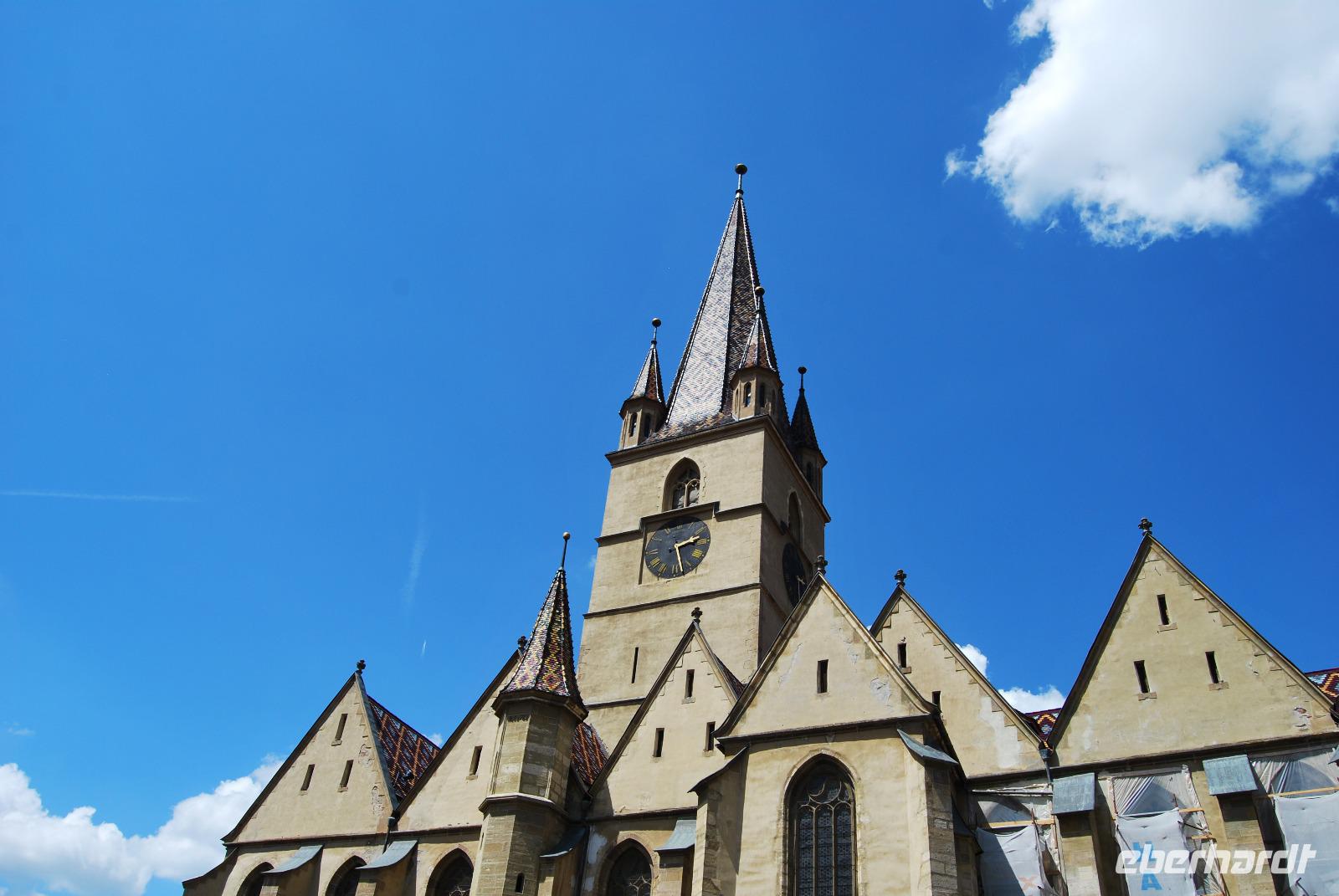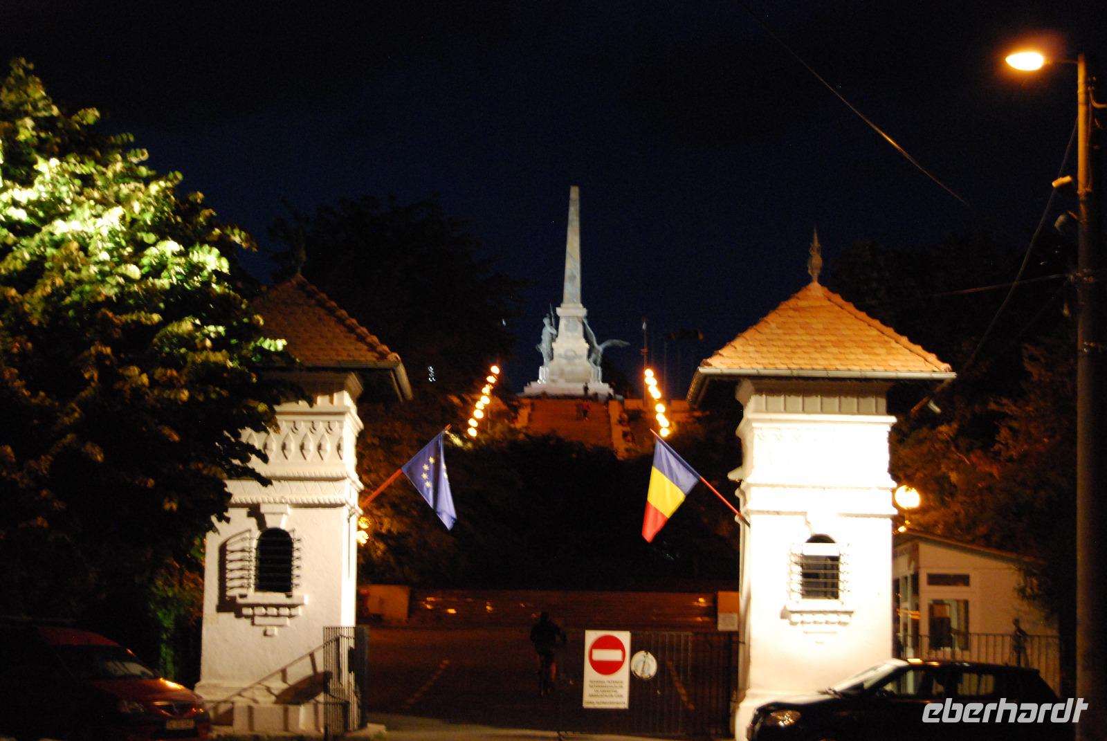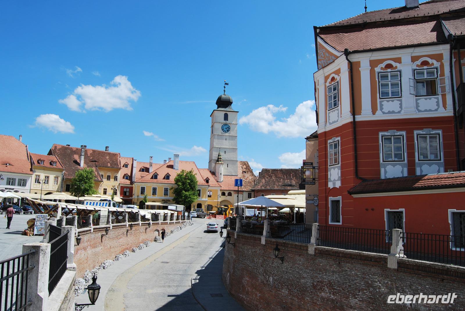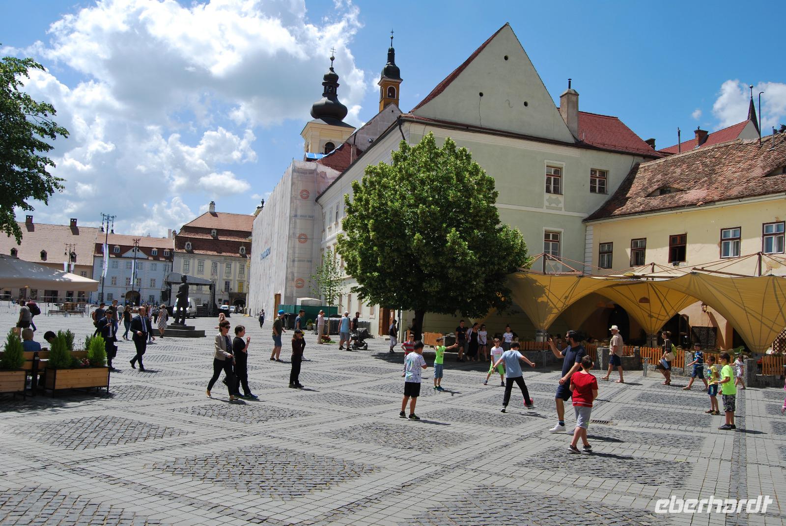 Zur Mittagszeit kamen wir in Sibiu, Hermannstadt an. Von dort marschierten wir am Schreinerturm vorbei in Richtung Marktplatz. Ein wirklich riesiger Marktplatz. In der Ecke, an der römisch-katholischen Kirche der Heiligen Dreifaltigkeit und des Rathausturms, fanden wir ein gemütliches Plätzchen. Dort gab es für uns eine leckere, fixe Mahlzeit. Entweder die typischen rumänischen Krautwickel oder eine Art Gulasch mit Polenta, einem Maisbrei.