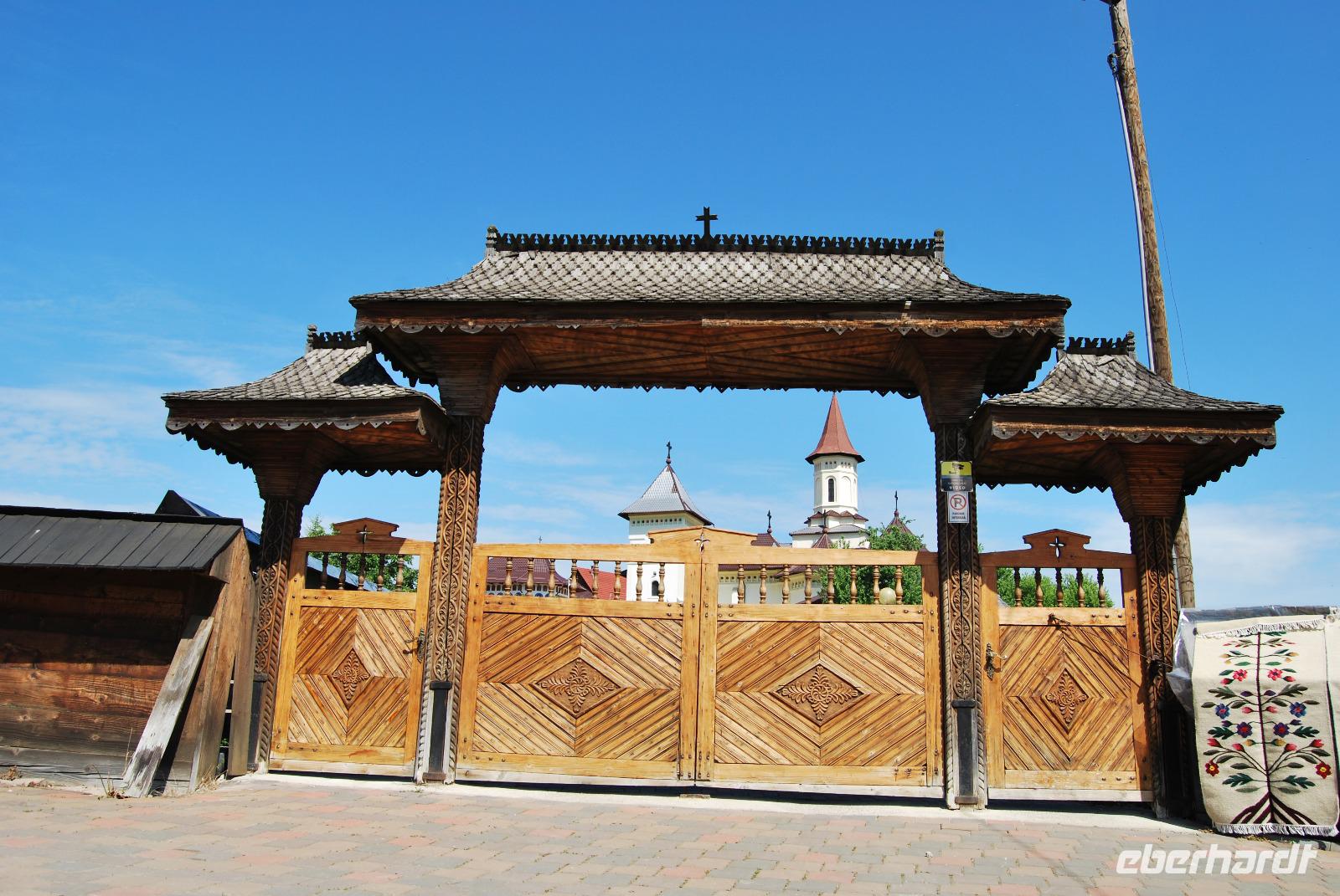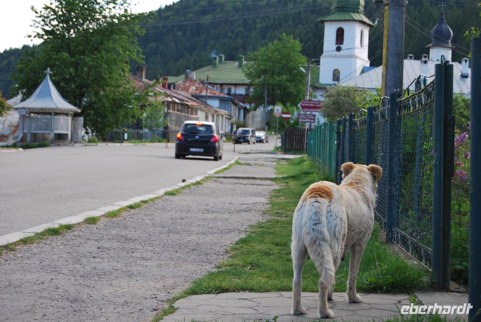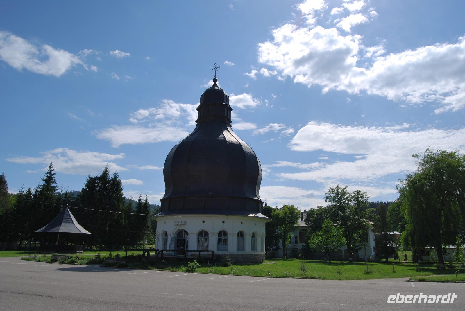 Wieder durchquerten wir Boroaia und verlassen die Region Bucovina, zu deutsch Buchenwald. Der Ort fällt mit seinen aufwändig und individuell verzierten kleinen Häusern auf, aber insbesondere durch die Kirche. Sie ist mit stark glänzenden Metallplatten auf den Dächern verziert. Sie schimmern auffällig golden bis bronzefarben. Die schimmernden Zwiebeltürme stechen empor. Ein ziemlich krasser Kontrast zu der doch eher bescheidenen Bauweise der Wohnhäuser im Dorf.