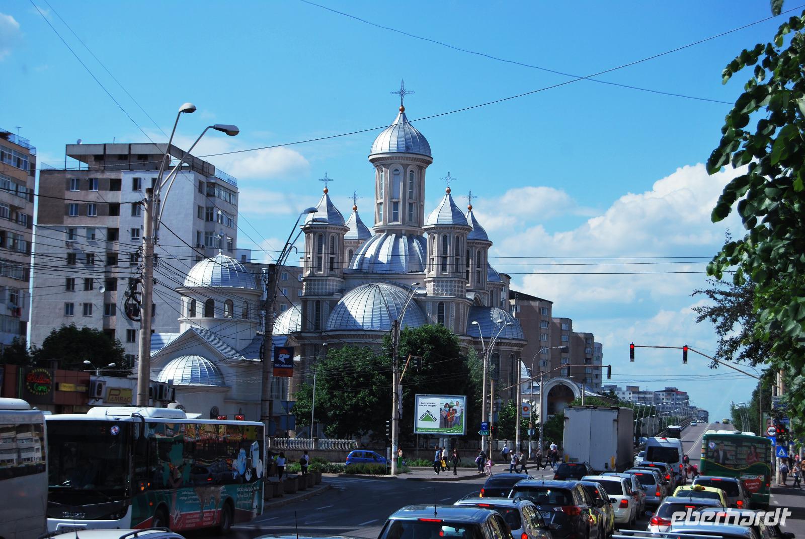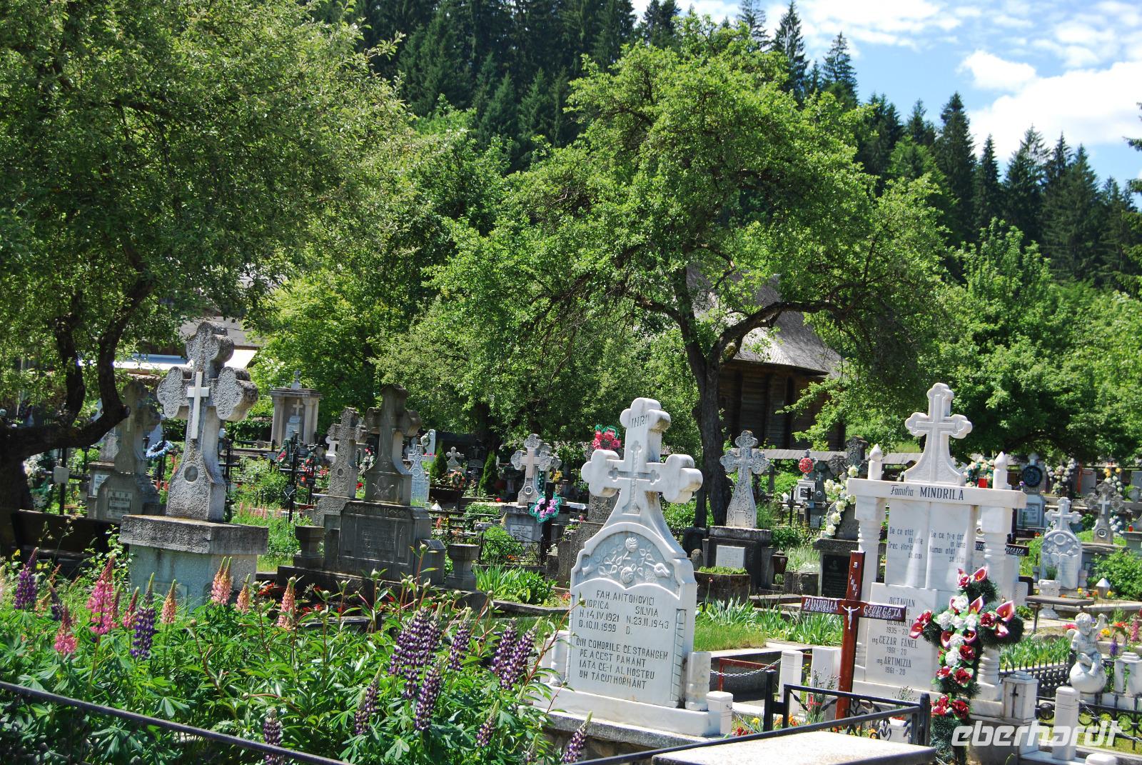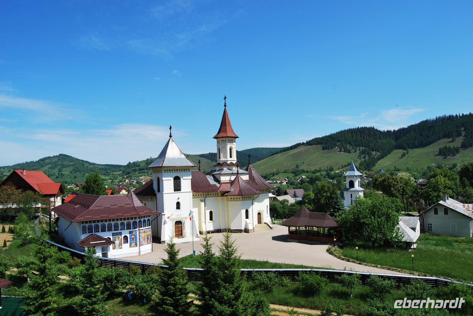 Wieder durchquerten wir Boroaia und verlassen die Region Bucovina, zu deutsch Buchenwald. Der Ort fällt mit seinen aufwändig und individuell verzierten kleinen Häusern auf, aber insbesondere durch die Kirche. Sie ist mit stark glänzenden Metallplatten auf den Dächern verziert. Sie schimmern auffällig golden bis bronzefarben. Die schimmernden Zwiebeltürme stechen empor. Ein ziemlich krasser Kontrast zu der doch eher bescheidenen Bauweise der Wohnhäuser im Dorf.