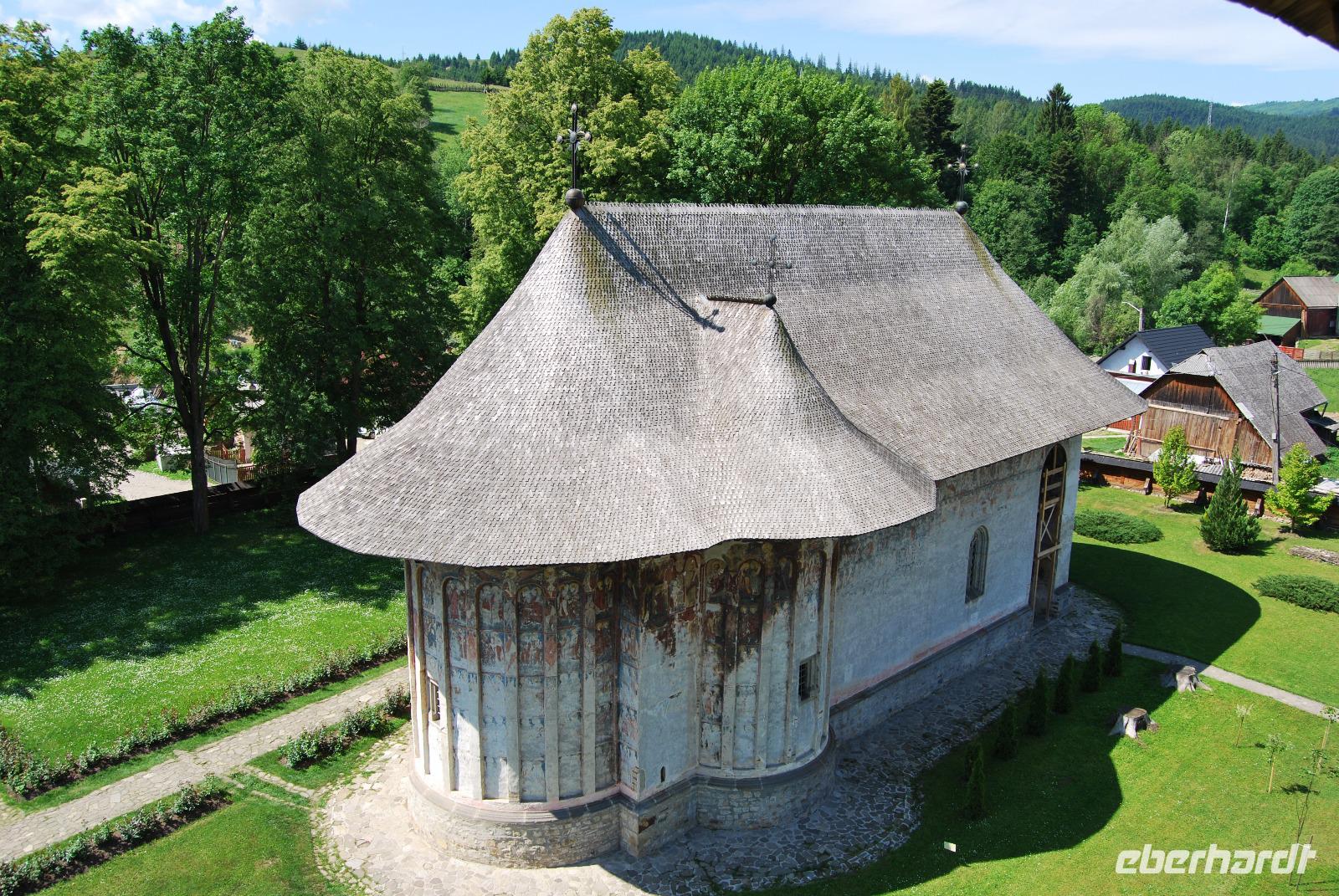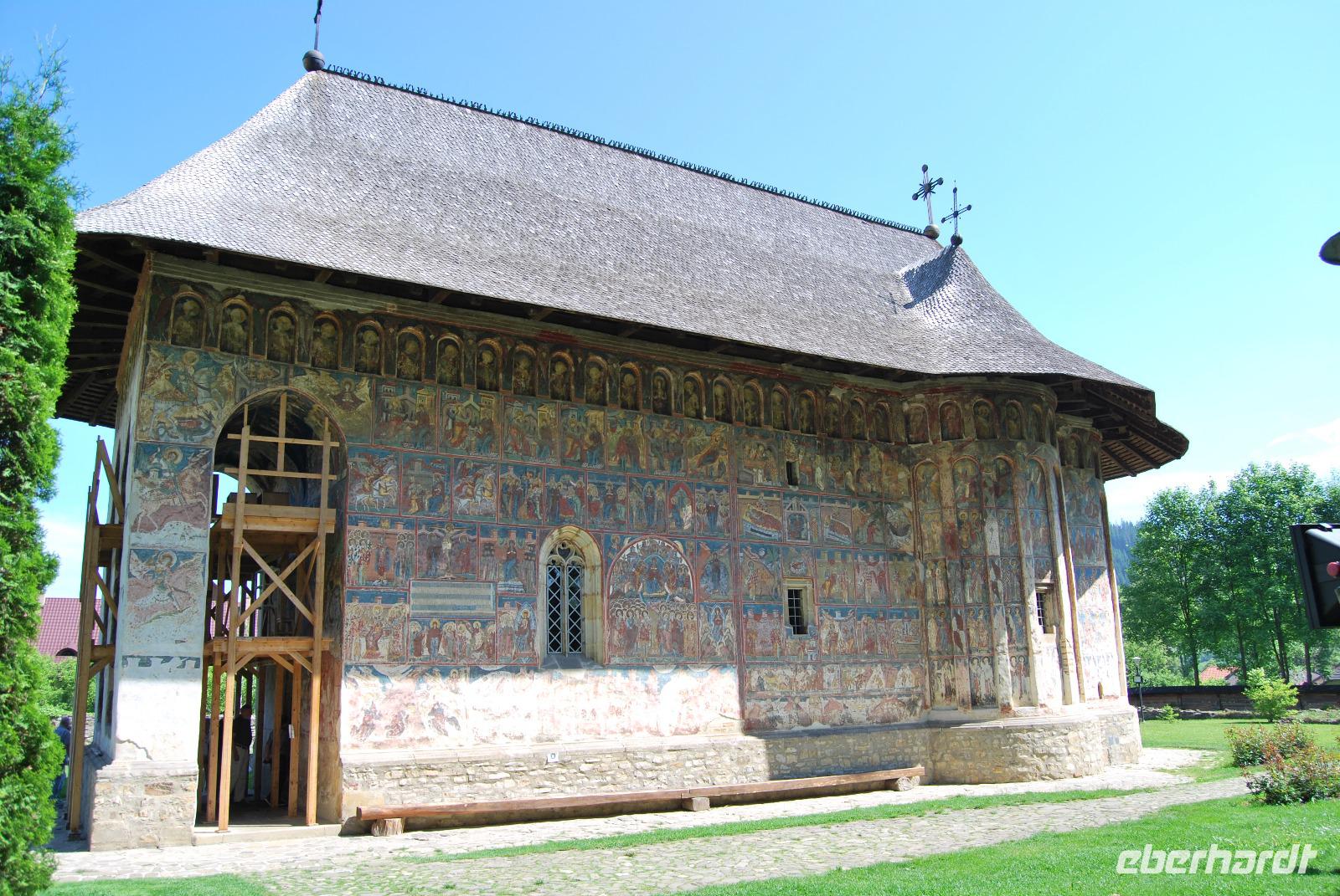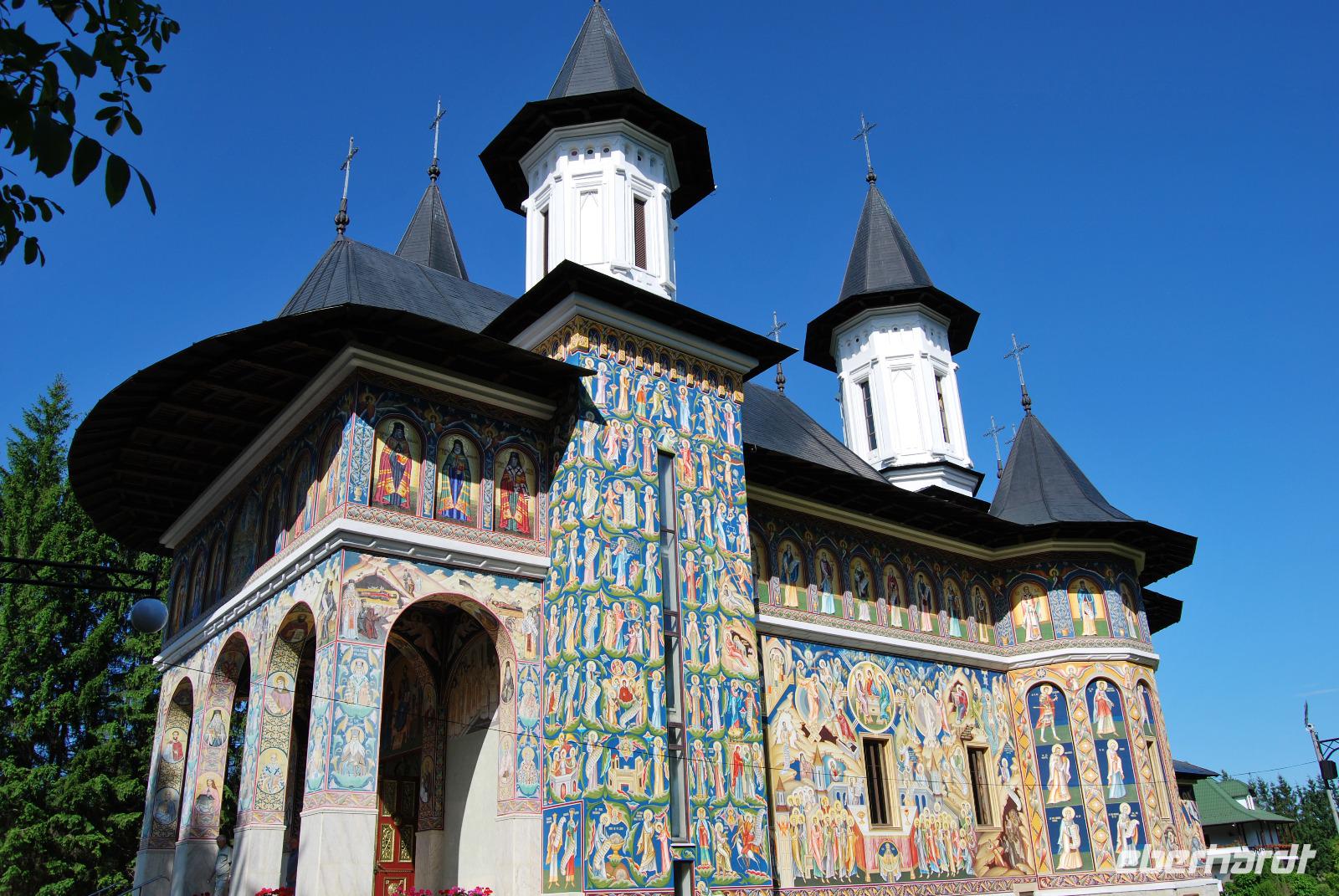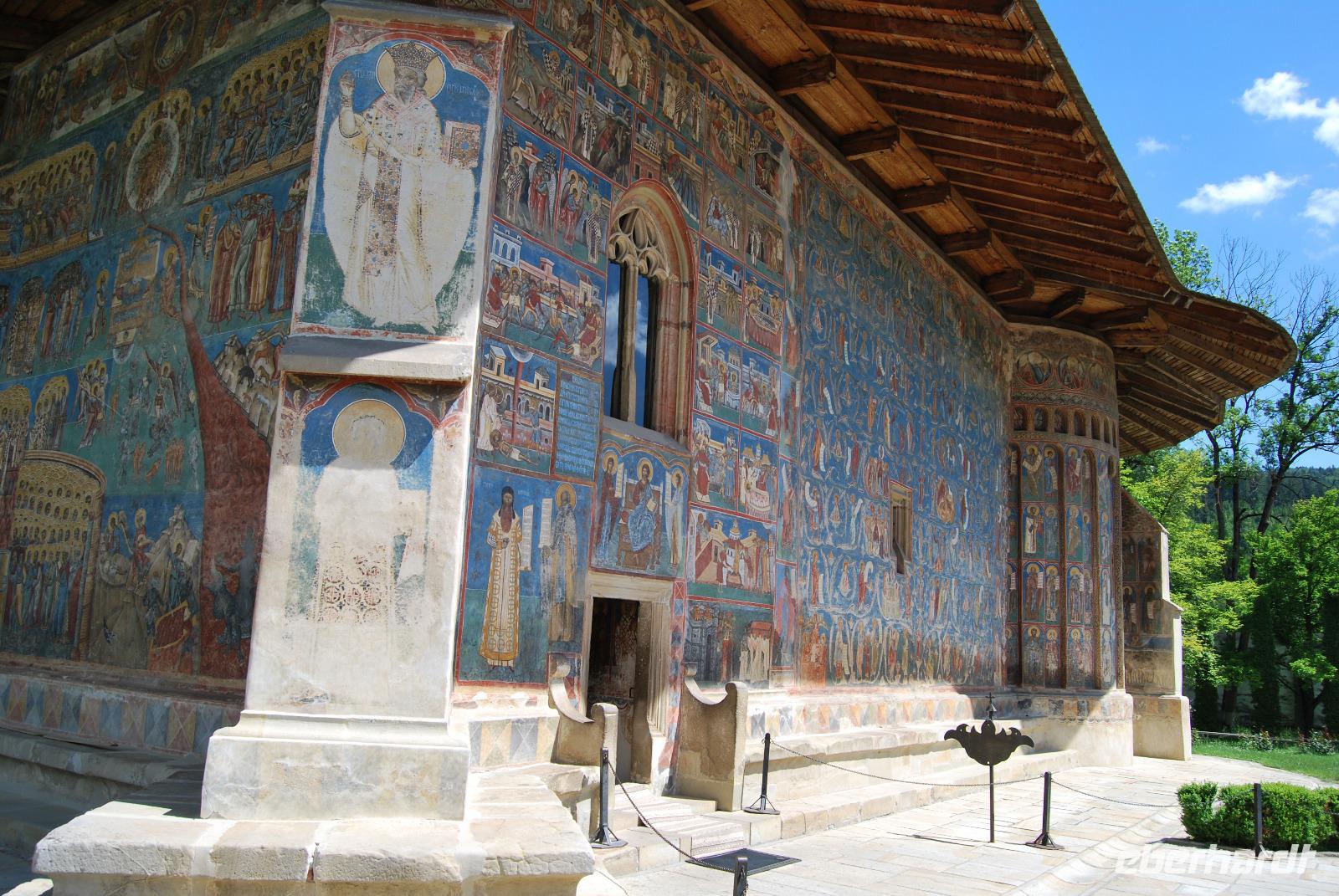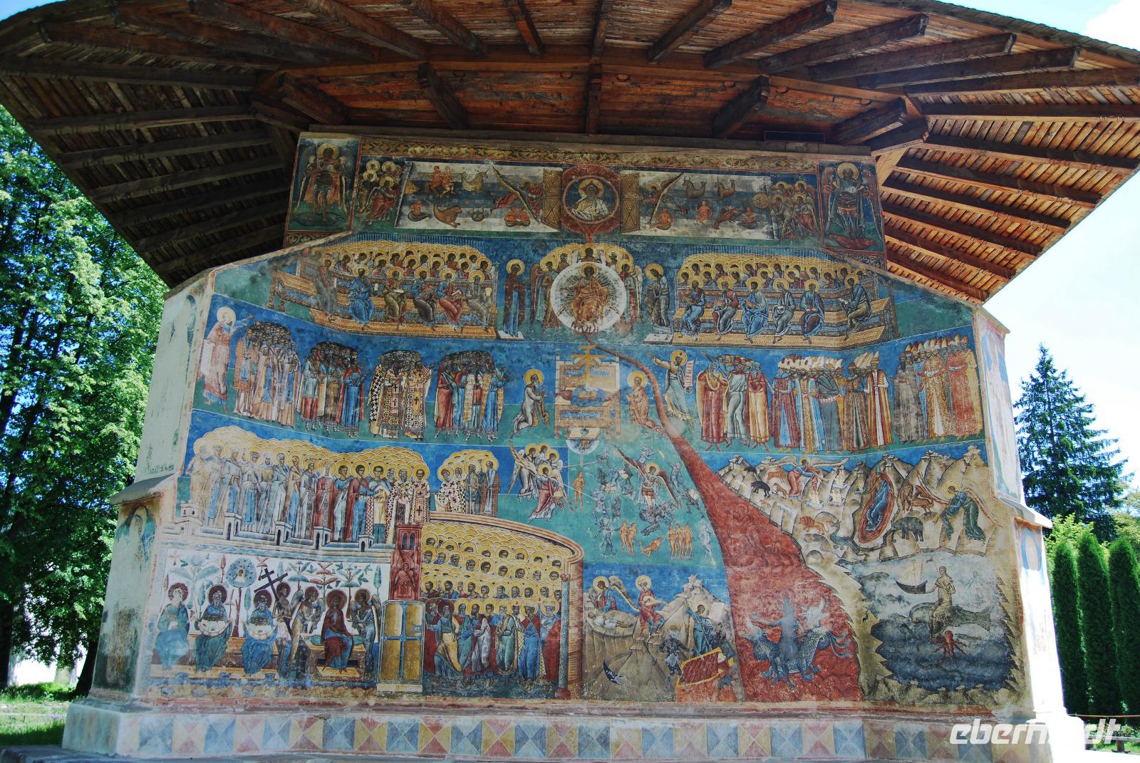 Aber nun zum Kloster. Es ist ein rumänisch-orthodoxes Frauenkloster, dessen Gebäude aus dem 16. bis 17. Jahrhundert stammen. Von dort fuhren wir weiter zum Kloster Voronet. Dort erhielten wir eine Erläuterung einer Nonne zur Darstellung des Jüngsten Gerichts - welches als riesiges Gemälde an der Kirchenwand zu sehen war.