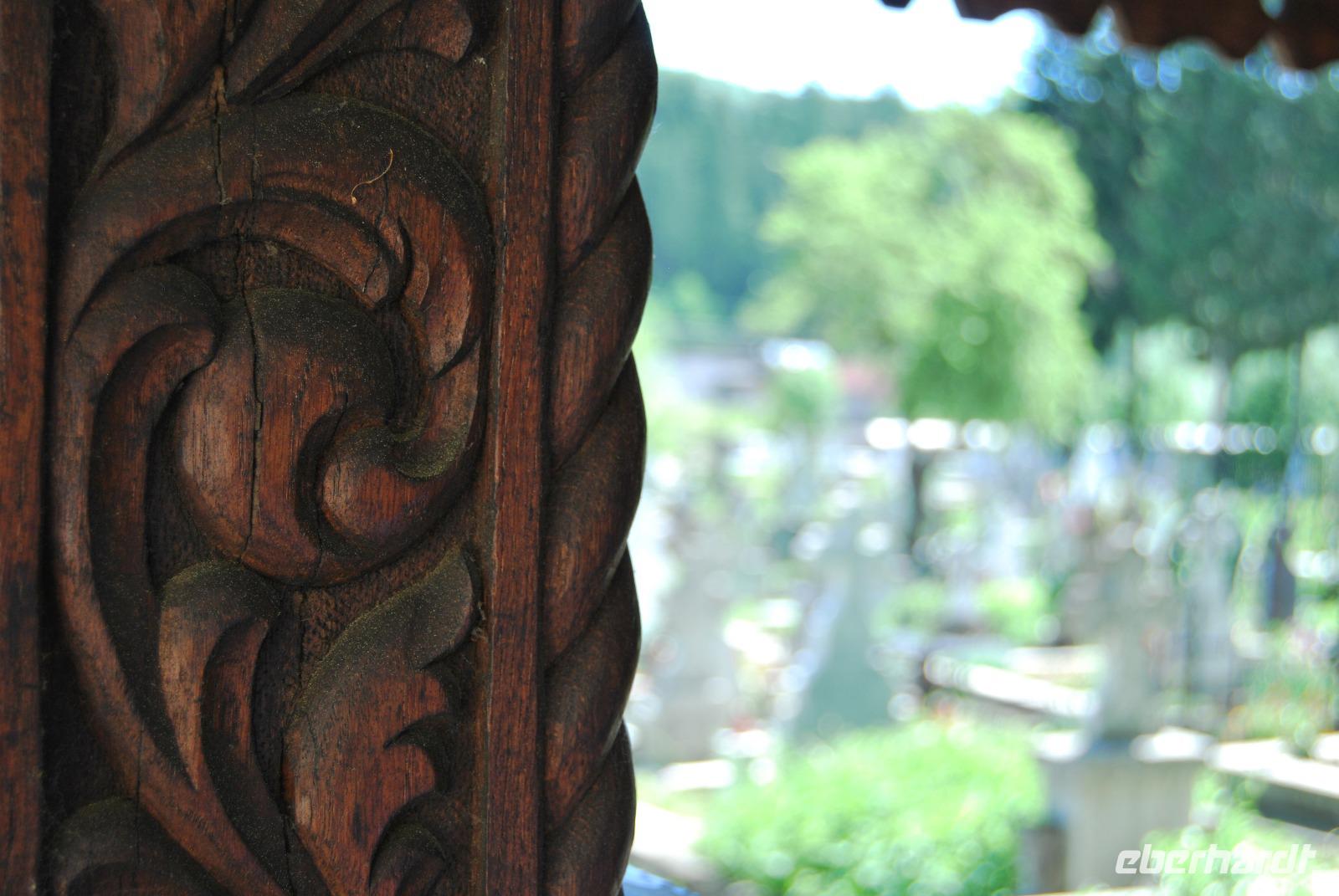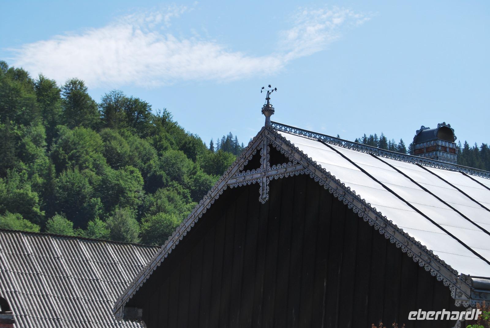 Am Morgen führte uns die Reise zum Kloster Humor. Wir machten noch einen kleinen Halt in der Ortschaft zuvor und sahen uns ein Gebäude und den Brunnen an. Es war ein sehr typisches Gebäude. Auch an den Tagen zuvor fiel auf, dass die Rumänen sehr, sehr kleine Häuser besitzen. Von außen würde ich sie gerade einmal auf 40 m² schätzen, kaum größer. Doch die meisten waren so aufwändig verziert wie es so manch ein Palast nicht ist. Zahlreiche Torbogen, jedes Fenster, jede Tür, sogar die Ecken, Wände und Dächer sind mit feinen Mustern, Dekorationen und Ornamenten versehen. Jedes Haus war einzigartig und mit enormer Handwerkskunst versehen. An diesem Haus wo wir kurz hielten, waren unter anderem das Dach und die Zäune mit einer aufwändigen Blecharbeit versehen. Jede paar Zentimeter stand eine Blume aus Blech - alles in mühseliger Handarbeit, ein wahrer Schatz der dort zu entdecken ist.