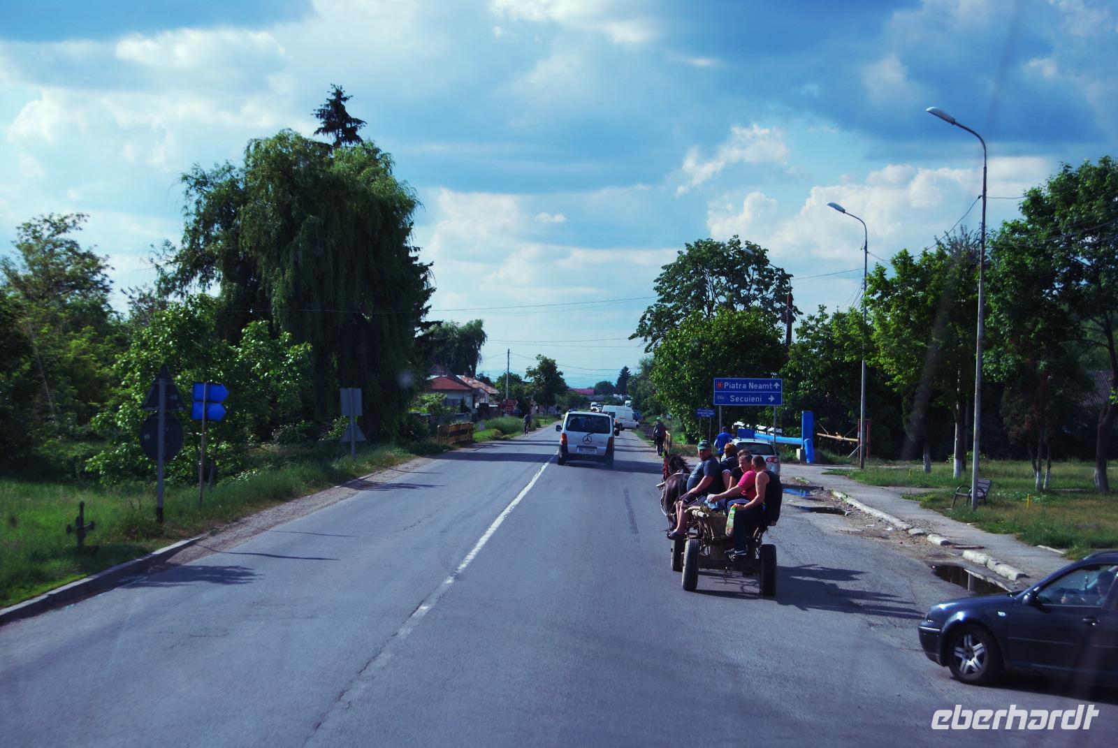 Dann ging es mit dem Bus weiter. Unser Busfahrer Simion brachte uns gut hundertsechzig Kilometer weiter nördlich nach Piatra Neamt oder auch Kreuzburg an der Bistritz genannt. Auf der Fahrt dorthin passierten wir einige Ortschaften. Interessant war dabei zu beobachten, dass viele der Bewohner vor ihrem Haus auf einer Bank sitzen. Direkt an der befahrenen Straße. Wo wir uns eher weit nach hinten, in die letzte Ecke des Gartens verkrümeln, sitzen die Rumänen an der Straße und beobachten das rege Treiben auf der Straße. Da man hier auch meistens zu Fuß, mit dem Fahrrad oder Pferd unterwegs ist, bieten sich auch oft Gelegenheiten mit den Nachbarn zu quatschen. So spielt sich in dieser Gegend das Leben noch auf der Straße ab, wo dagegen in meinem Heimatort in Niedersachsen man eher vermutet, es sei alles ausgestorben - doch es ist einfach nur die Mentalität eine andere.