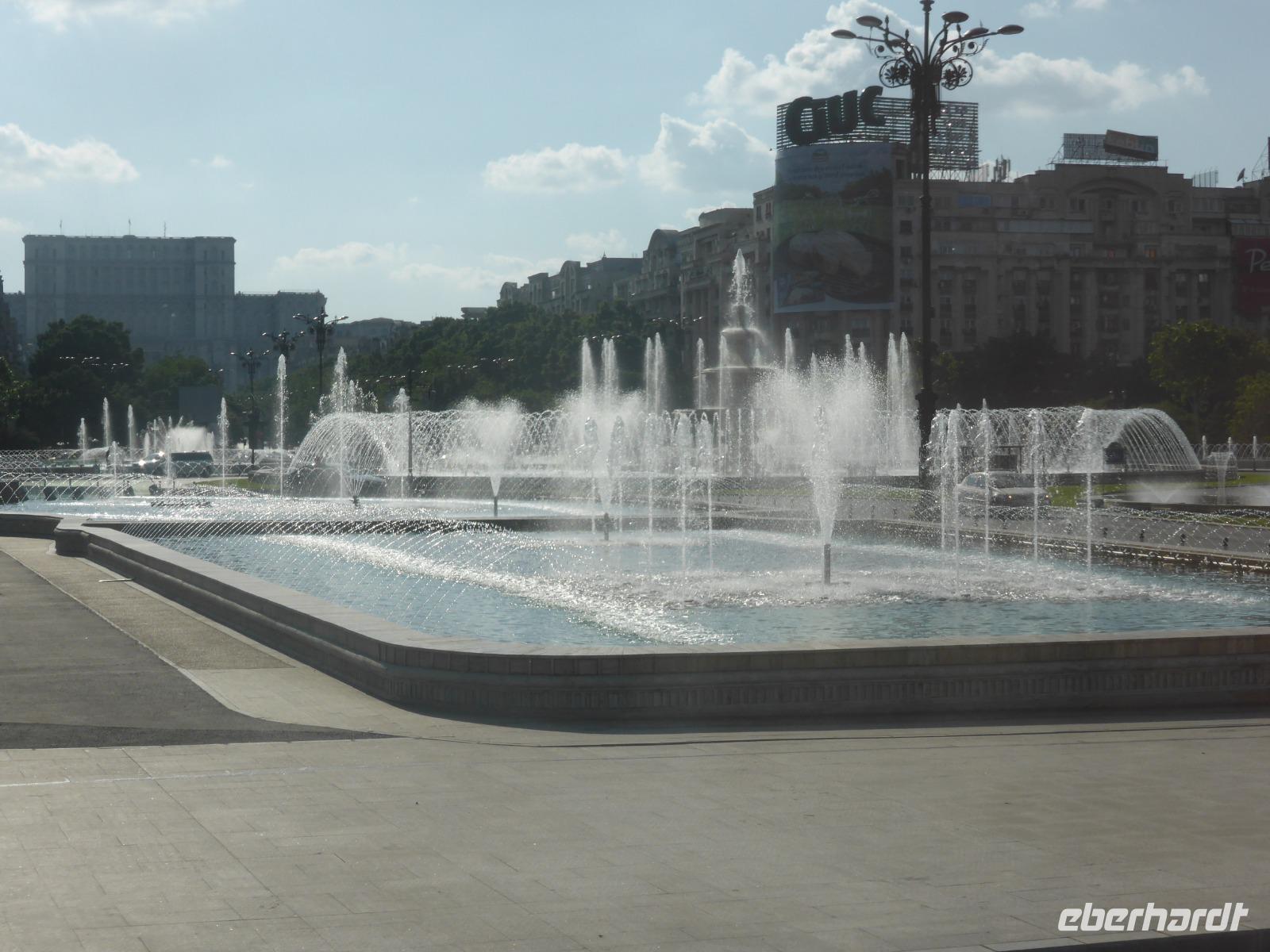 Vorbei am Arc de Triumph und am Botschaftsviertel erreichen wir das Stadtzentrum. Die bevorstehenden Europawahlen sind auch in Rumäniens Hauptstadt omnipräsent. Überall wehen Europaflaggen. Die Stadt wirkt mit ihren vielen Parks und Alleen sehr grün. Das Zentrum von Bukarest erinnert mit seiner Architektur an Wien und Budapest. Omnipräsent ist jedoch der "Palast des Volkes" / Parlamentsgebäude, der vom ehemaligen Staatsoberhaupt Nicolae Ceaucescu gegen alle Widerstände erbaut worden ist. Das zweitgrösste und gleichzeitig schwerste Verwaltungsgebäude der Welt ist von weithin sichtbar.