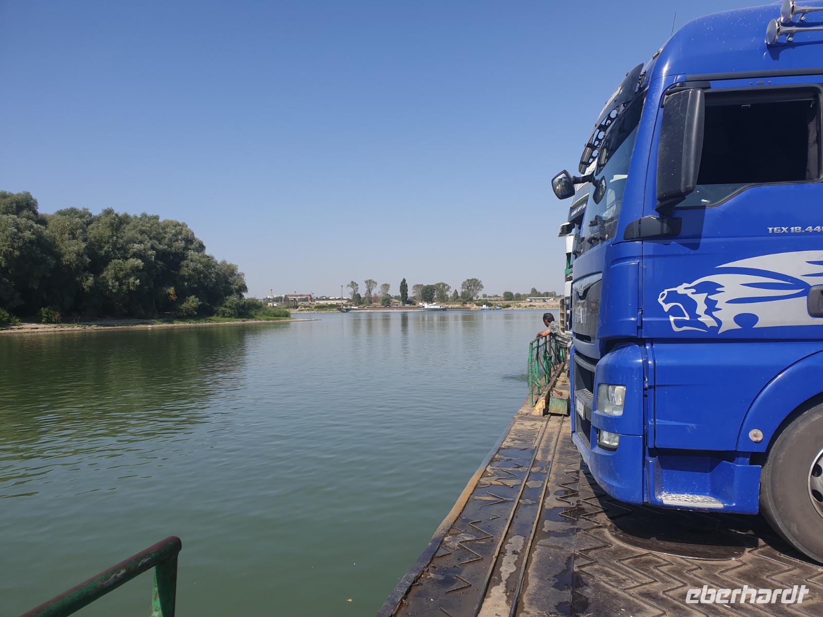 Nach rund zwei Stunden Fahrt hat uns die Donau wieder. Wir dürfen an dieser Stelle aber nicht mit der Fähre übersetzen. Der Wasserstand ist zu niedrig. Wir fahren weiter in die Nähe von Brâila. Hier klappt es und zusammen mit vier anderen Brummi-Schwergewichten borden wir unseren grünen Bus. Das Treiben beim Rangieren der LKWs ist ein Erlebnis für sich und wir beobachten es mit Interesse. Pragmatismus wird hier gross geschrieben. Die deutsche Gründlichkeit kommt hier jedenfalls zu kurz. Wir staunen und schmunzeln.