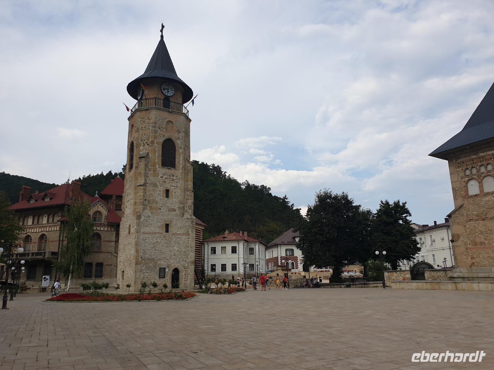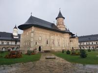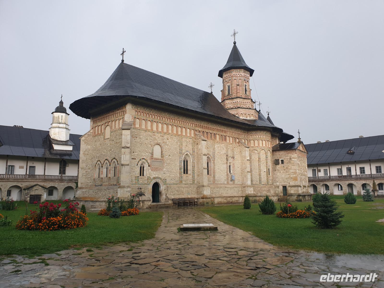 Unsere Mittagspause machen wir im nahe gelegenen Ort Gora Humorului. Die Zeit steht zur freien Verfügung. Gelegenheit, die Stadt auf eigene Faust zu erkunden oder sich einen Mittagsimbiss auf dem Bauernmarkt zu holen. In der Markthalle selbst versteckt sich auch ein sehr gut besuchter Cevapcici-Grill. Bebe, unser Fahrer, holt uns mit unserem Bus am vereinbarten Treffpunkt wieder ab und zu guter Letzt steuern wir das Männerkloster Neamt an. Auch dieses wurde vom Moldaufürsten Stefan dem Grossen gegründet und ist das grösste seiner Art in Rumänien. Es ist ausserdem bekannt für seine Miniaturmalereien und die grösste Klosterbibliothek des Landes mit seltenen Werken. Gerade geht ein heftiger Regenschauer und Gewitter nieder, was die Klosteranlage in ein besonderes Licht wirft. Gleich neben dem Kloster liegt die besonders schöne "Heilige Jakob"-Kirche auf dem Gelände eines Priesterseminars. Das leuchtende Blau der Aussenmalereien erinnert an das Blau vom Kloster Voronet des bekannten Malers Grigorescu.