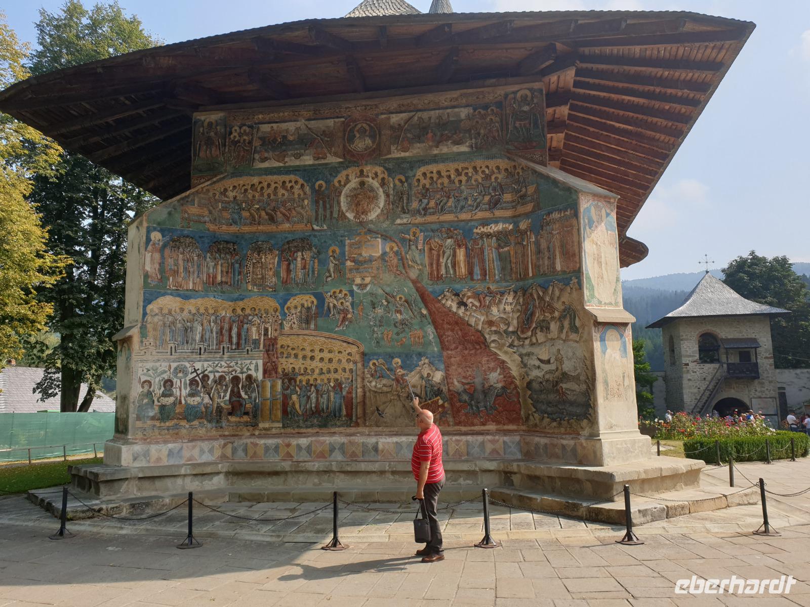 Wir fahren weiter durch die Bukowina, begleitet von vielen bewaldeten Hügeln. Kurz vor dem Kloster Voronet gibt es in ebendiesen Wäldern ein Naturschutzgebiet, in dem Wisente, die in Europa fast ausgestorben waren, wieder angesiedelt worden sind. Das Kloster Voronet, dass den Beinamen "Sixtinische Kapelle des Ostens" trägt, gehört zu den Klöstern mit dem Siegel des Weltkulturerbe. Das Kloster wurde im 15. und 16. Jahrhundert von Stefan dem Großen, einem Herrscher des Fürstentums Moldau, und später seinen Nachfolgern, erbaut. Doru zeigt uns die Besonderheiten bei den Fresken auf jeder Seite der innerhalb der Klostermauern liegenden Kirche "Heiliger Georg". Besonders die Westseite ist besonders gut erhalten und ein farbenfrohes Spektakel mit Szenen aus dem "Jüngsten Gericht". Der Blick in die kleine Kirche ist nicht minder faszinierend. Der gesamte Innenraum ist voller Malereien. Und - wer findet die Geheimtür?