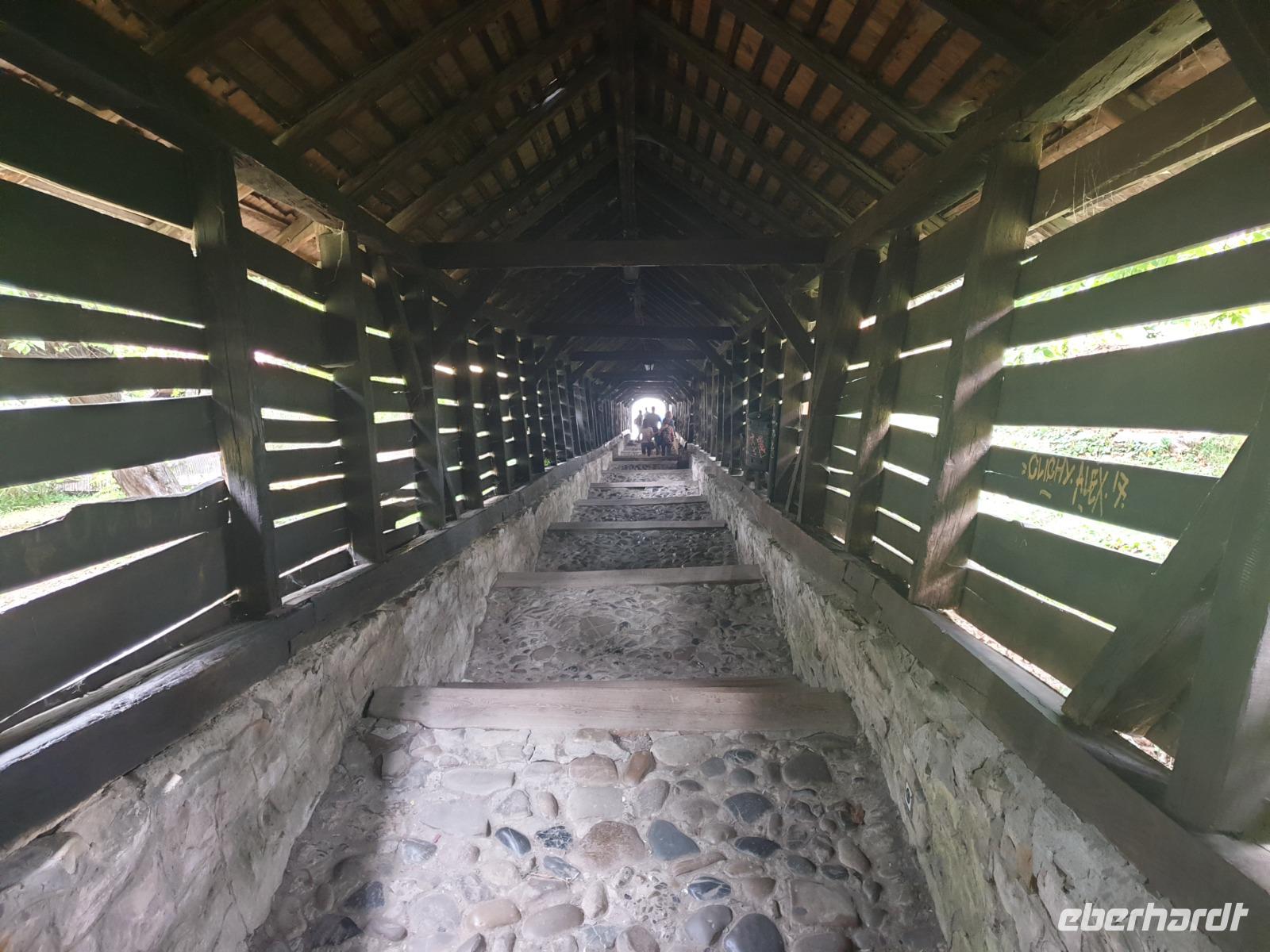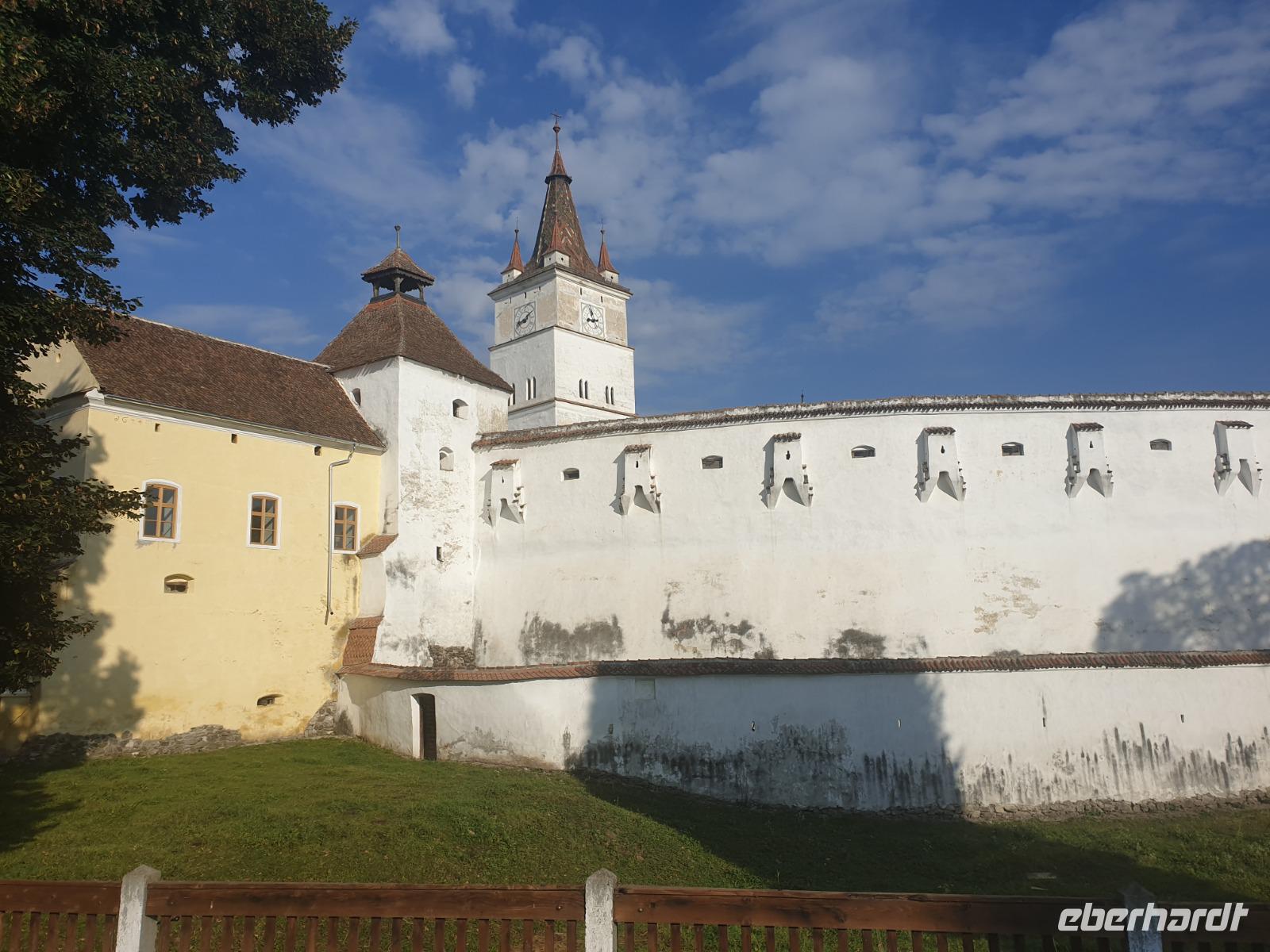 Unser erstes Ziel des Tages ist die Wehrkirche in Harman (Honigberg). Die kolossale und doch idyllische Anlage ist sehr gut erhalten und beim Spaziergang durch die Wehrmauer bekommen wir ein "Geheimgang-Gefühl" und können uns leicht in die damalige Zeit hineinversetzen. Der Anstieg auf den Kirchenturm befeuert unseren Abenteuergeist und bringt vielleicht auch ein paar Kindheitserinnerungen zurück. Besonders gefällt auch das in einem der Räume eingerichtete Schulzimmer, in dem ein Junge im Siebenbürger Sächsisch eine Geschichte vorliest. Wer kann diesen Dialekt verstehen?