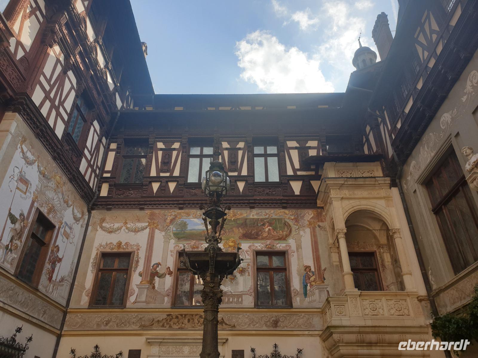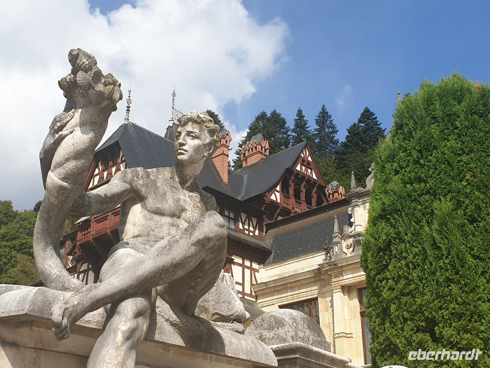 Gegen 10.00 Uhr erreichen wir Sinaia, den bekanntesten Ort im Tal. Hier steigen wir aus und gehen zu Fuss zum Schloss Peles - und müssen uns erst einmal buchstäblich hintenanstellen. Viele andere Gäste wollen diese prächtige Schloss mit all seinen Reichtümern besuchen. Doch nicht lange müssen wir warten, bald dürfen wir eintreten. Dieses gigantische Schloss atmet nicht nur Geschichte, sondern auch Kunst und Kultur vom ersten bis zum letzten Zentimeter. Doru weist auf die vielen besonderen Details hin, die sich in jedem Zimmer des Schlosses befinden. Wir staunen! Es bleibt noch Zeit, im Schlossgarten zu flanieren, den Spätsommertag zu geniessen und originelle Fotomotive zu finden.