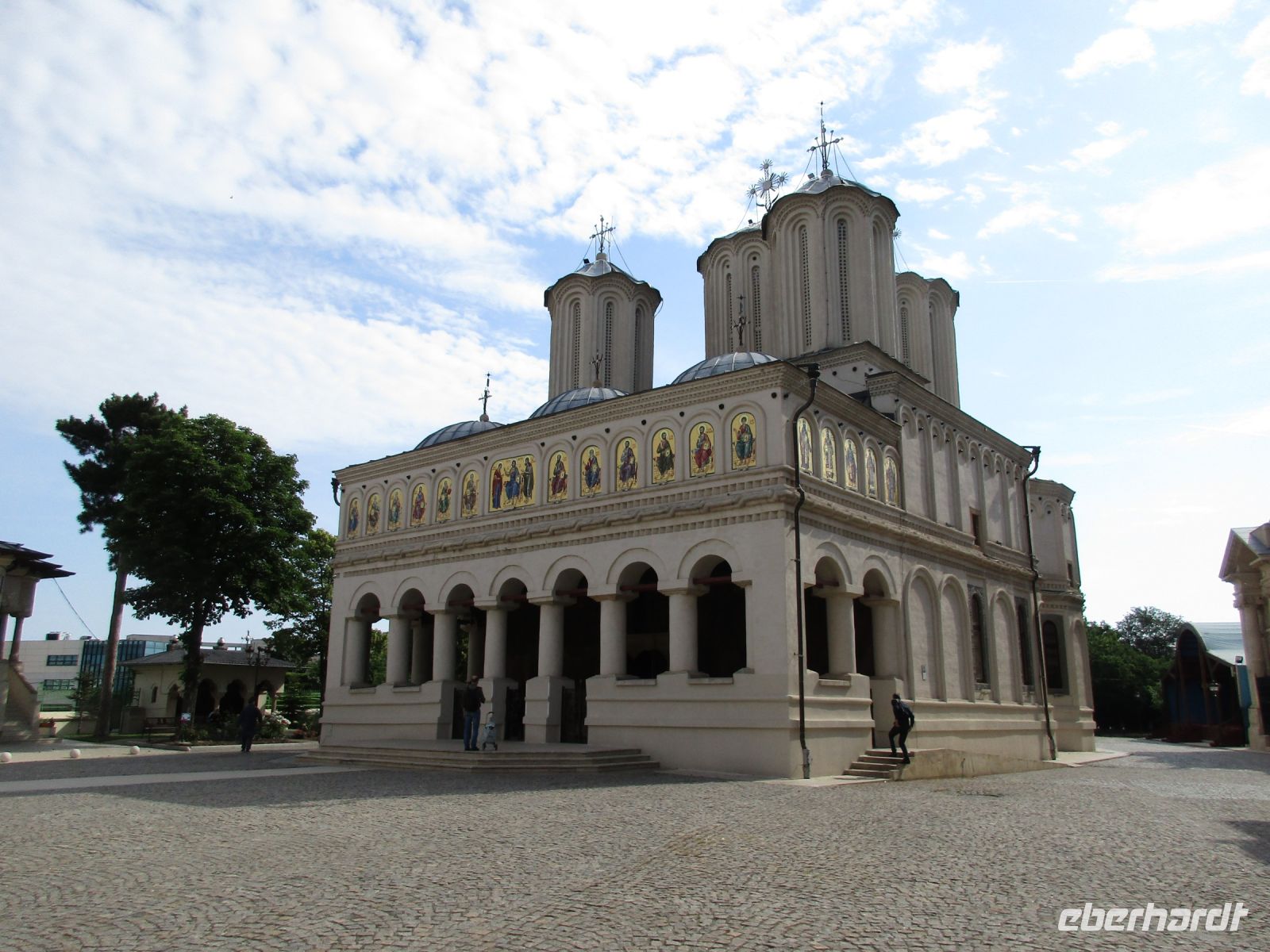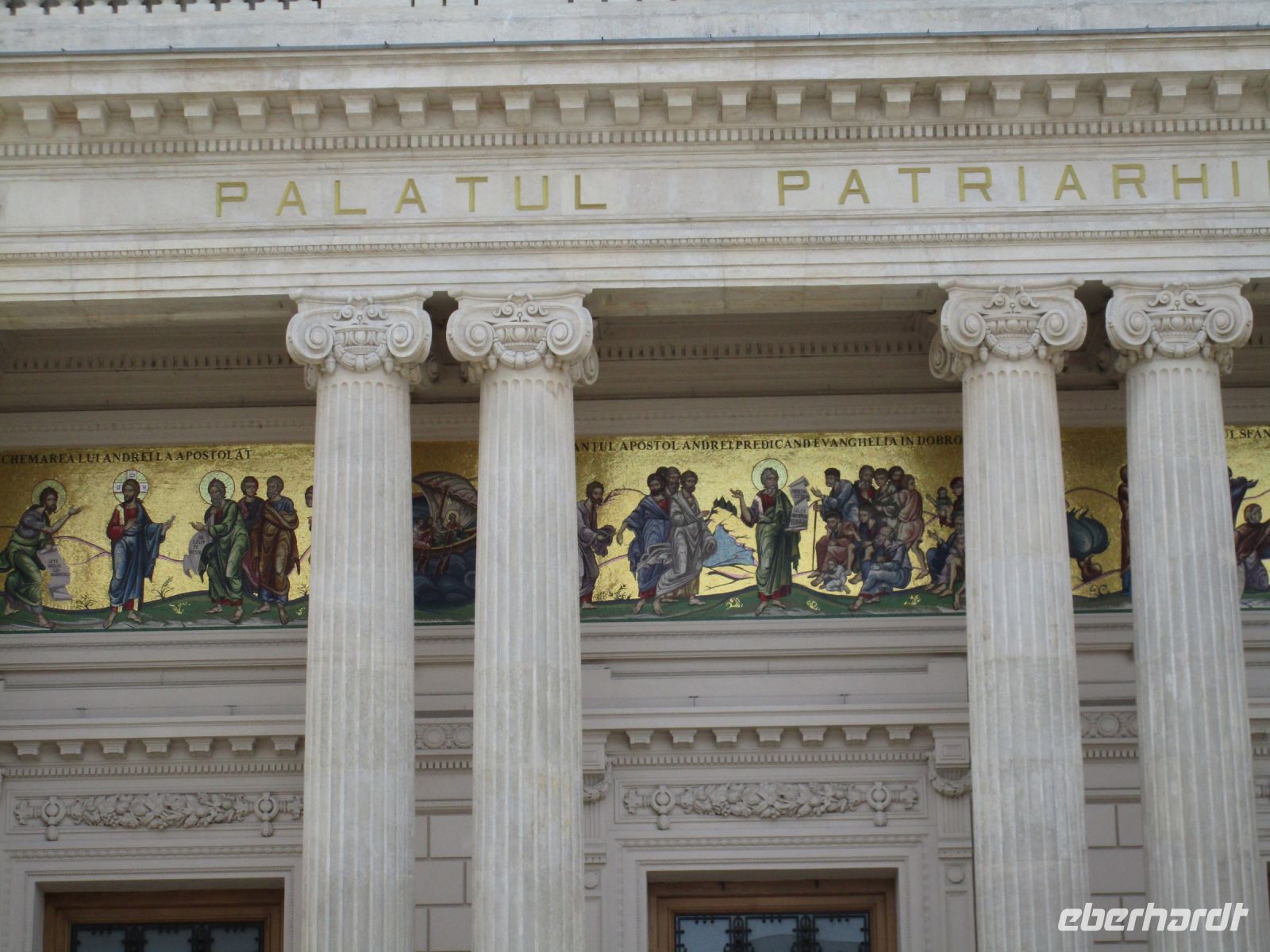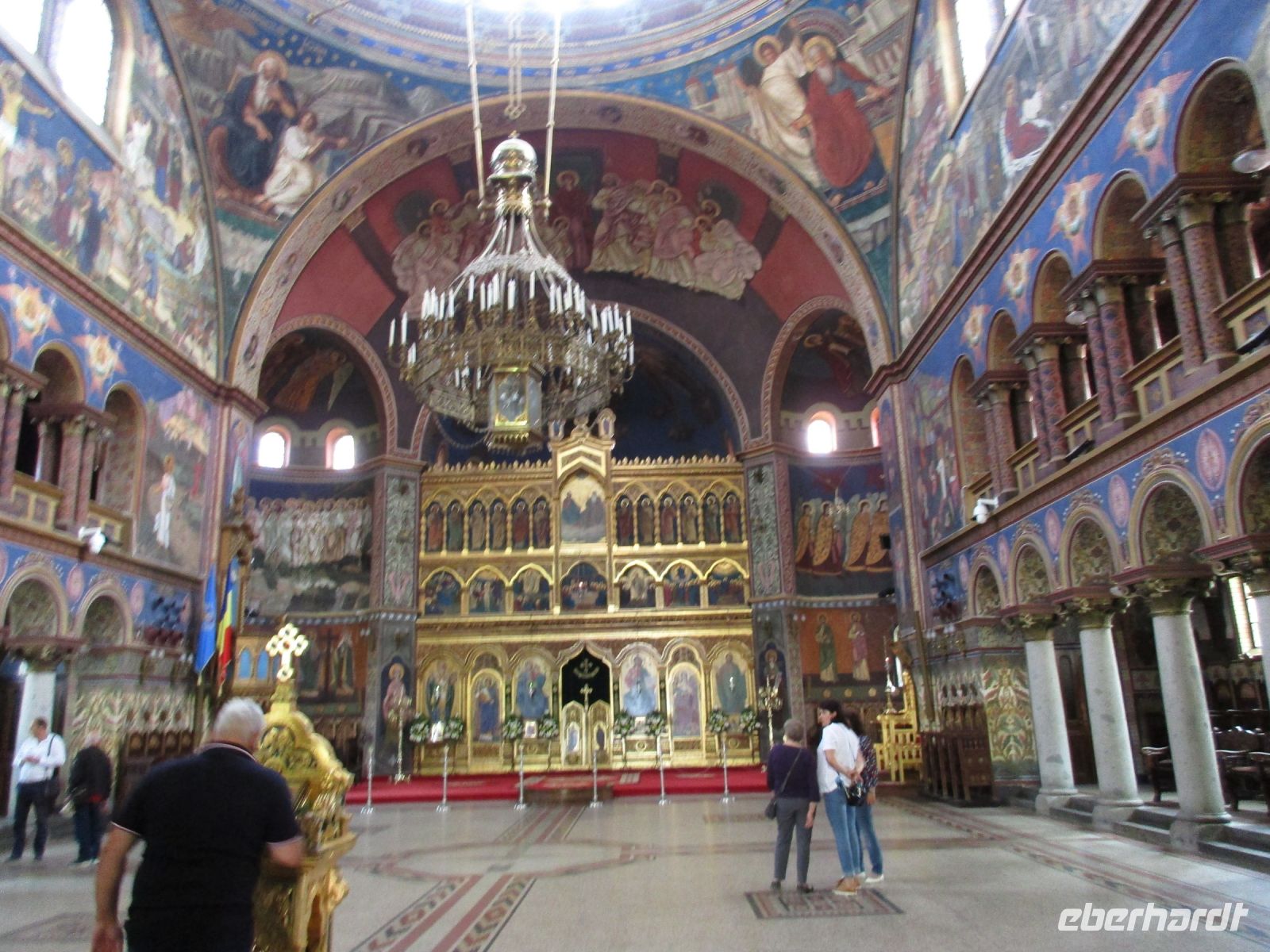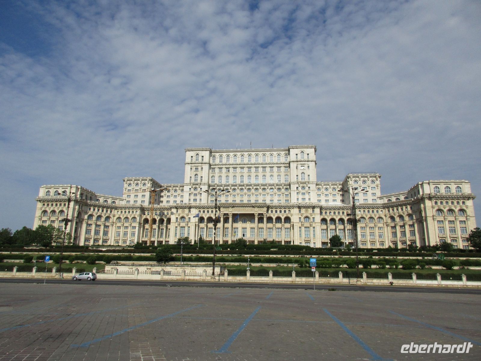 Nach einem exzellenten Frühstück, das keine Wünsche offenlässt, packen wir leider wieder unsere Koffer. Wir würden gern noch bleiben, aber Rumänien ist mit über 238 Tsd. km² flächenmäßig an achter Stelle in der Europäischen Union, und wir wollen ja eine Rundreise in 10 Tagen absolvieren. Bukarest ist die siebtgrößte Stadt der Union und hier gäbe es noch sehr viel zu entdecken. Im 19. Jhd. orientierten sich die Baumeister an den Plänen von Napoleon III. und Haussmann, berühmt für seine eleganten Boulevards und Wohnhäuser in Paris. So ist beispielsweise der Bulevardul Unirii 60 m länger und 1 m breiter als die berühmte Avenue des Champs-Elysées. Cosmin zeigt uns alte und neue Prachtbauten zwischen dem Platz der Vereinigung und dem Cismigiu-Park, der Nationaloper und dem Platz der Revolution. Wir fahren zum Parlamentsgebäude, dem legendären Prestigebau von Ceausescu. Die Bukarester bezeichneten diesen Bau auch als „Haus des Sieges über das Volk“ und viele Menschen trauern heute noch dem ehemaligen Uranus-Viertel nach. 65.000 m² bebaute Grundfläche, 275 m lang und 235 m breit, 365.000 m² Geschossfläche, um nur einige Parameter zu nennen. 1 Mrd. m³ Marmor aus Siebenbürgen, Stahl, Bronze, Kristallglas, Holz und weitere wertvolle Materialien flossen in den Bau ein. Man schätzt Baukosten in Höhe von 3,3 Mrd. €, von den heutigen laufenden Kosten gar nicht zu reden. Bemerkenswert ist, dass der damaligen 26-jährigen Absolventin Anca Petrescu die Leitung von über 700 Architekten übertragen wurde. 1984 war die Grundsteinlegung und auf dem Territorium des Palastes befindet sich heute die größte orthodoxe Kathedrale Rumäniens noch im Bau, die „Kathedrale der Erlösung des Volkes“… Daran arbeiten hier in der Abgeordnetenkammer 330 Abgeordnete Rumäniens.