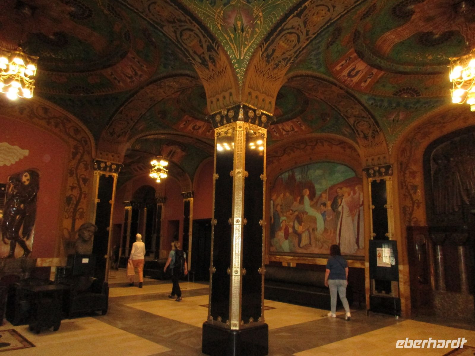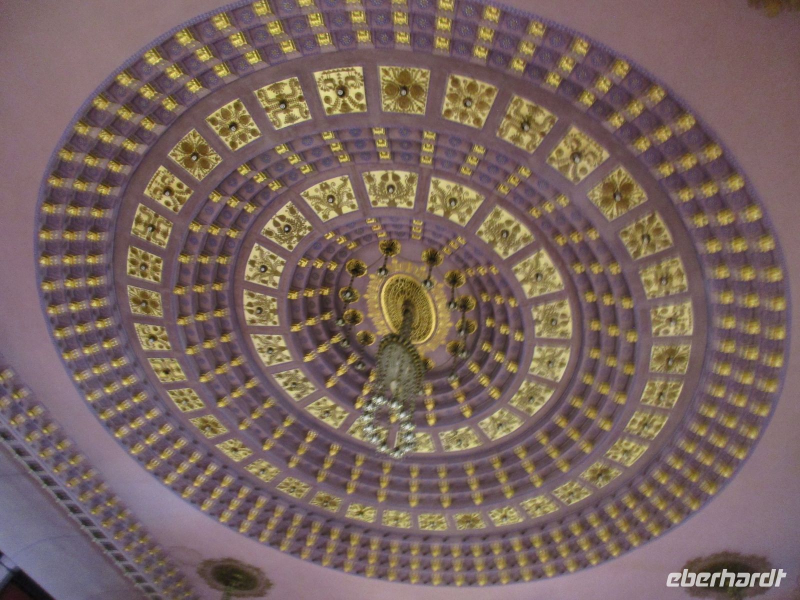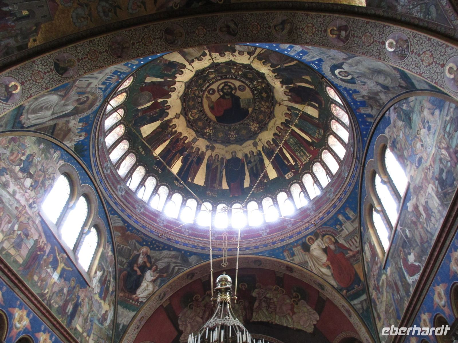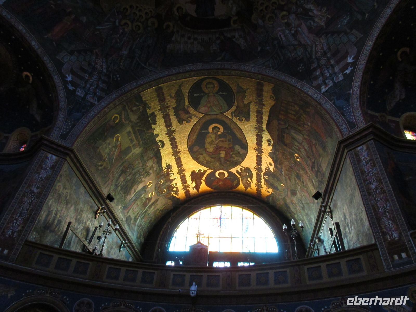 Nach einem exzellenten Frühstück, das keine Wünsche offenlässt, packen wir leider wieder unsere Koffer. Wir würden gern noch bleiben, aber Rumänien ist mit über 238 Tsd. km² flächenmäßig an achter Stelle in der Europäischen Union, und wir wollen ja eine Rundreise in 10 Tagen absolvieren. Bukarest ist die siebtgrößte Stadt der Union und hier gäbe es noch sehr viel zu entdecken. Im 19. Jhd. orientierten sich die Baumeister an den Plänen von Napoleon III. und Haussmann, berühmt für seine eleganten Boulevards und Wohnhäuser in Paris. So ist beispielsweise der Bulevardul Unirii 60 m länger und 1 m breiter als die berühmte Avenue des Champs-Elysées. Cosmin zeigt uns alte und neue Prachtbauten zwischen dem Platz der Vereinigung und dem Cismigiu-Park, der Nationaloper und dem Platz der Revolution. Wir fahren zum Parlamentsgebäude, dem legendären Prestigebau von Ceausescu. Die Bukarester bezeichneten diesen Bau auch als „Haus des Sieges über das Volk“ und viele Menschen trauern heute noch dem ehemaligen Uranus-Viertel nach. 65.000 m² bebaute Grundfläche, 275 m lang und 235 m breit, 365.000 m² Geschossfläche, um nur einige Parameter zu nennen. 1 Mrd. m³ Marmor aus Siebenbürgen, Stahl, Bronze, Kristallglas, Holz und weitere wertvolle Materialien flossen in den Bau ein. Man schätzt Baukosten in Höhe von 3,3 Mrd. €, von den heutigen laufenden Kosten gar nicht zu reden. Bemerkenswert ist, dass der damaligen 26-jährigen Absolventin Anca Petrescu die Leitung von über 700 Architekten übertragen wurde. 1984 war die Grundsteinlegung und auf dem Territorium des Palastes befindet sich heute die größte orthodoxe Kathedrale Rumäniens noch im Bau, die „Kathedrale der Erlösung des Volkes“… Daran arbeiten hier in der Abgeordnetenkammer 330 Abgeordnete Rumäniens.