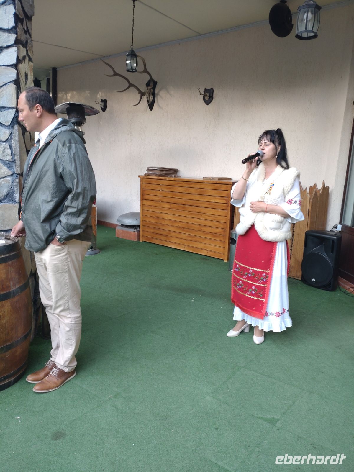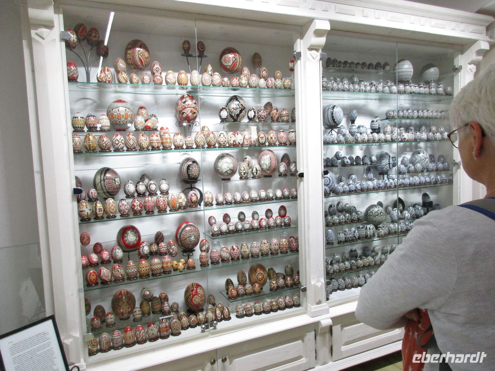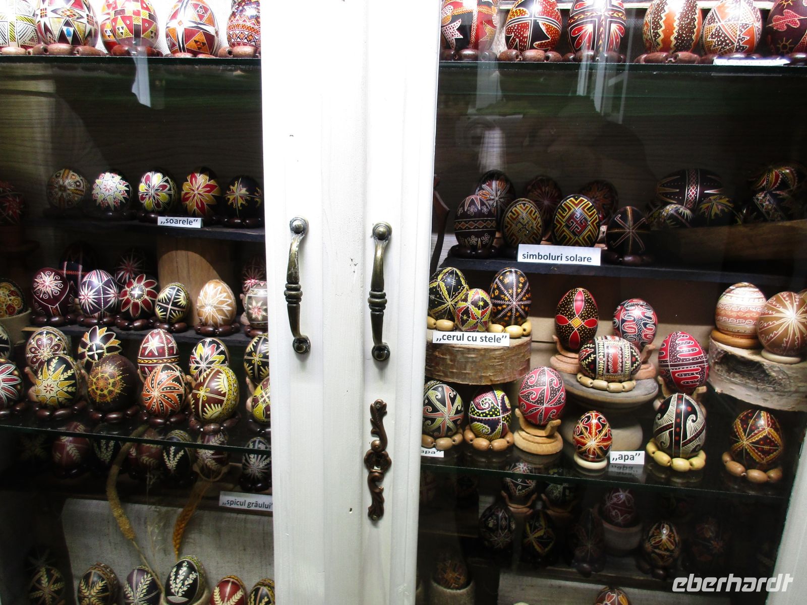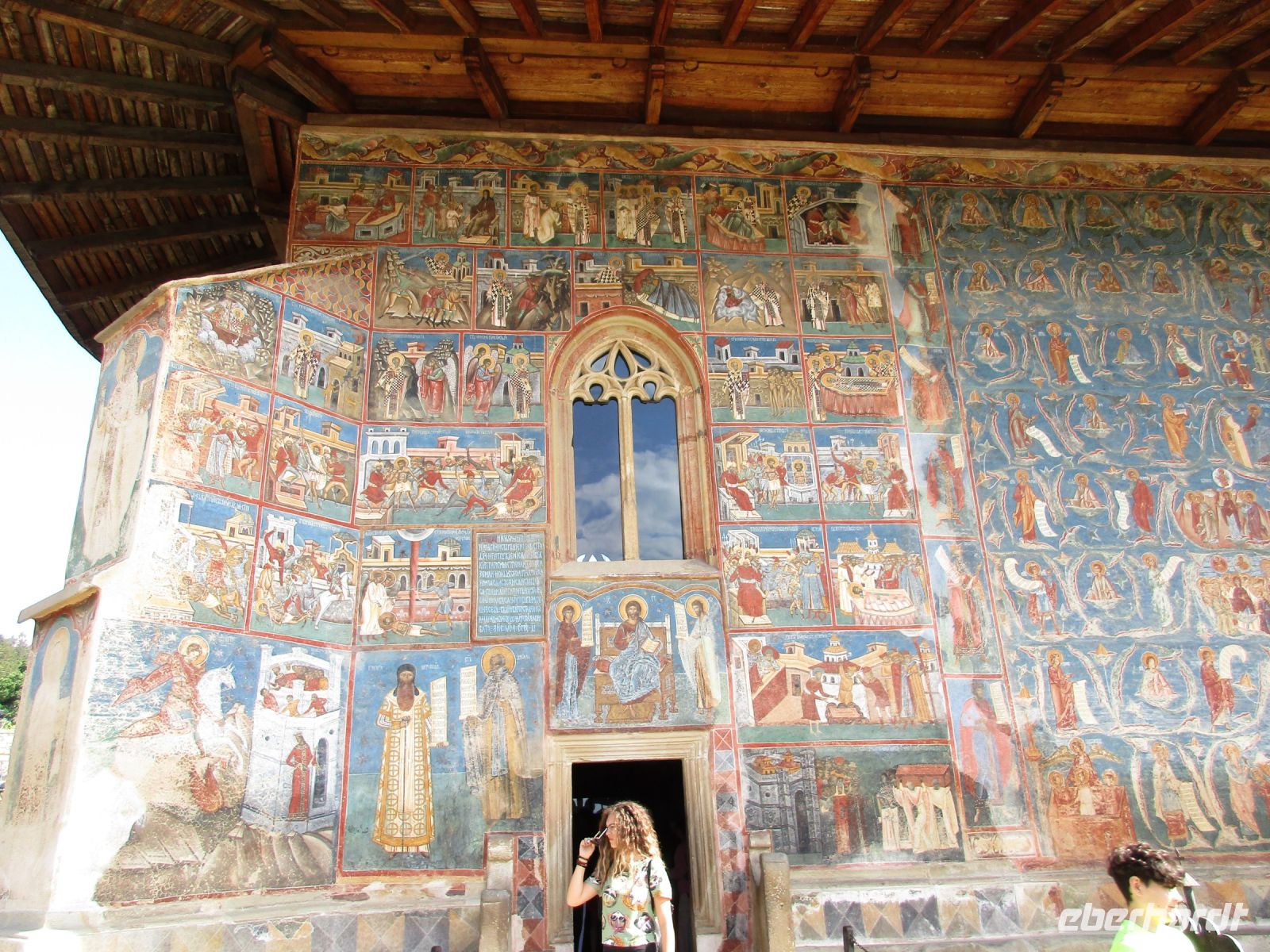 Nach dem Frühstück heißt es wieder Koffer laden, denn heute geht es weiter nach Moldawien. Wir besuchen das rumänisch-orthodoxe Kloster Moldovita im Kreis Suceava, das von dem unehelichen Sohn des Herrschers Stefan der Große, Petru Raresch, 1532 gestiftet wurde. Fünf Jahre später wurde es mit prächtigen Wandmalereien „Mariä Verkündigung“, dem Jüngsten Gericht und der Belagerung von Konstantinopel versehen. Das Kloster im byzantinischen und gotischen Stil ist ebenfalls mit einer Mauer und Wehrtürmen umgeben. Seit 1993 gehört es zu Recht mit 6 anderen Klöstern zum UNESCU-Weltkulturerbe. Wir bewundern die Kunstfertigkeit der Baumeister und Künstler, die hier gewirkt haben. Zu unserer großen Freude hat Maica Tatiana einen Augenblick Zeit für uns, denn wir möchten ihr Grüße aus Deutschland ausrichten, über die sie sich sehr freut! Wir schwatzen ein wenig und zum Abschied gibt es sogar noch eine herzliche Umarmung mit viel Energie von dieser bemerkenswerten Frau. Ich werde mich heute nicht waschen. Zoltan hat wieder zwischendurch eine warme Mahlzeit für uns organisiert, bevor es weiter zum Ei-Museum nach Vama geht. Hier erwartet uns das größte Museum Europas mit bemalten und künstlerisch bearbeiteten Eiern. Die Sammlung wird ständig erweitert. Frau Orsischi hat zwischenzeitlich etwa 11.000 Eier erworben und gesammelt und ihr Museum wird immer mehr erweitert und ausgebaut. Man kommt aus dem Staunen nicht mehr heraus. Und eine hübsche Geschenkidee! Wir fahren nun weiter nach Gura Humorului, der Stadt im Süden der Bukowina, in der der Fluss Humora in die Moldau mündet. Der Ort erscheint uns etwas unscheinbar, aber unser 4-Sterne-Hotel „Best Western Bucovina“ lässt keine Wünsche offen. Nach dem Abendessen entschließt sich die Hälfte der Gruppe, einen Spaziergang zum Fontainen-Park zu unternehmen. Was für eine tolle Entscheidung. Wasserspiele mit Licht und Rockmusik, sensationell umgesetzt. Wir sind begeistert! Danach gibt es noch einen Absacker an der Bar und wir fallen hochzufrieden in unsere Betten.