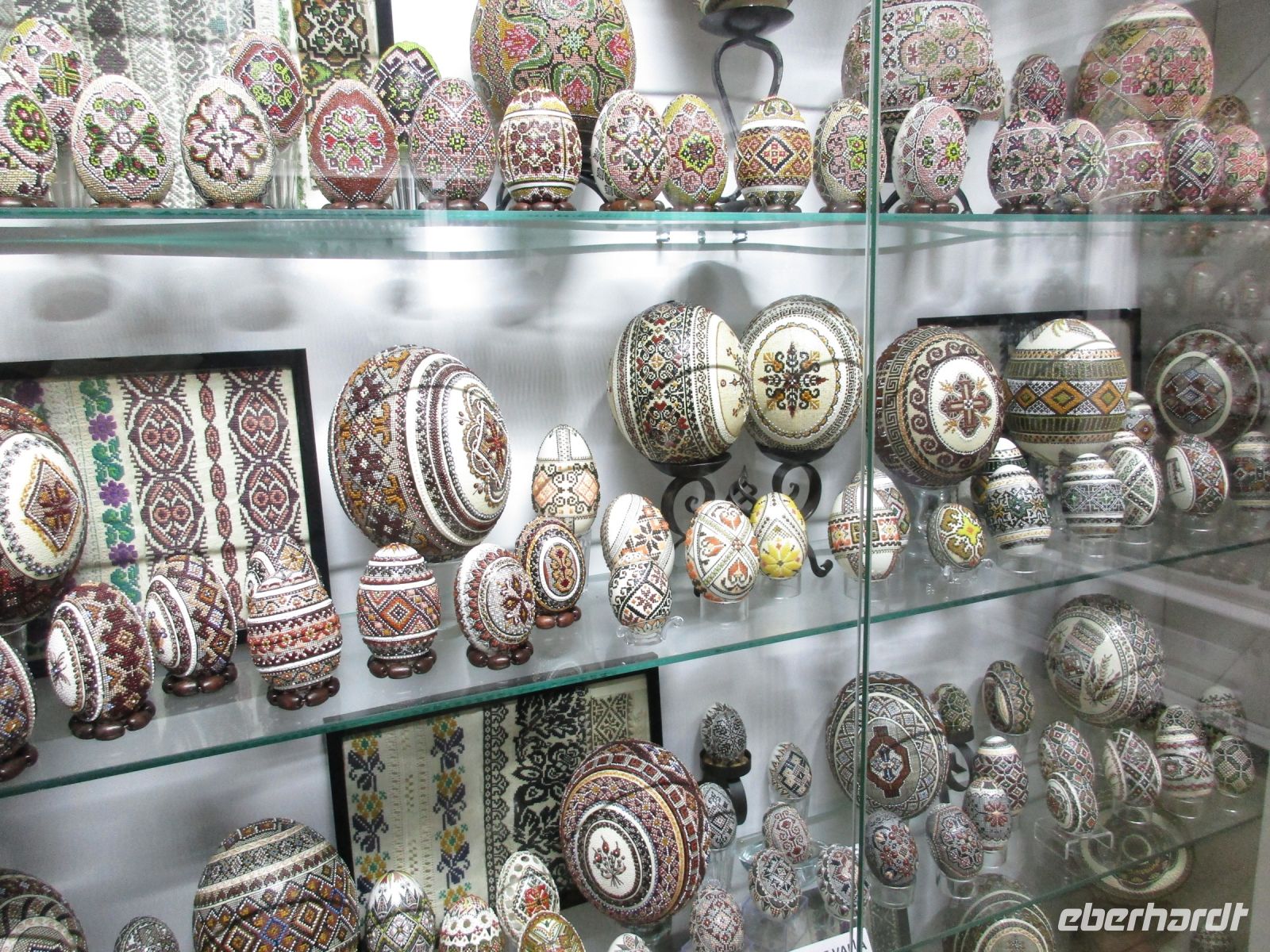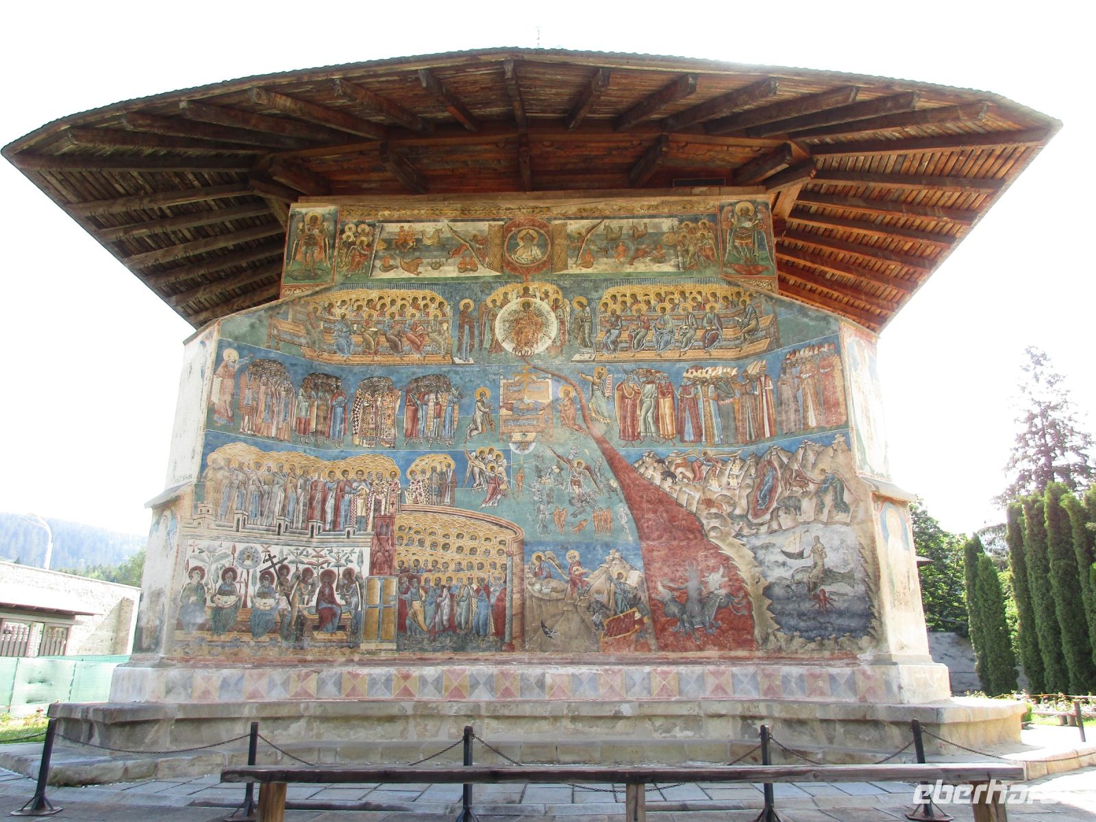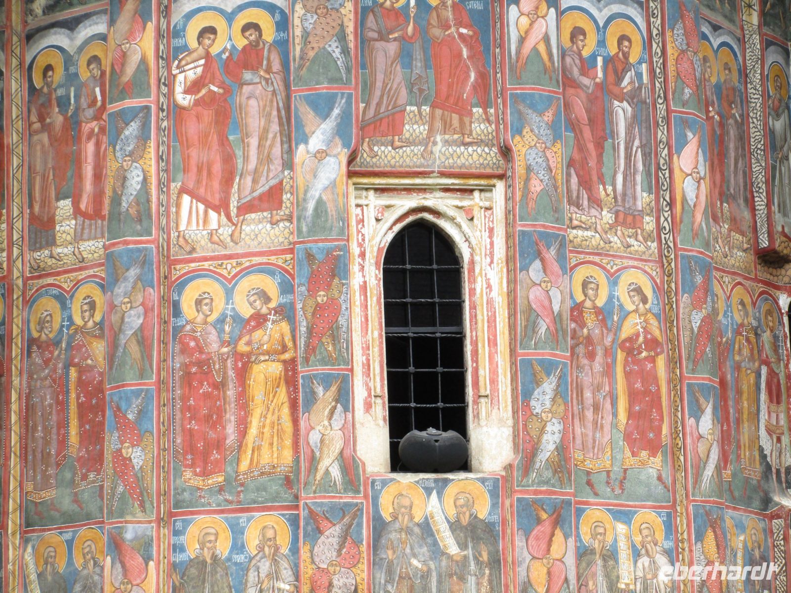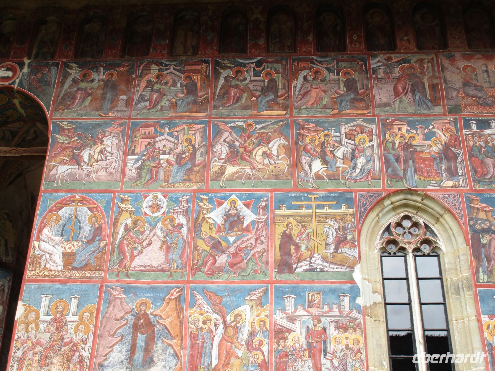 Nach dem Frühstück heißt es wieder Koffer laden, denn heute geht es weiter nach Moldawien. Wir besuchen das rumänisch-orthodoxe Kloster Moldovita im Kreis Suceava, das von dem unehelichen Sohn des Herrschers Stefan der Große, Petru Raresch, 1532 gestiftet wurde. Fünf Jahre später wurde es mit prächtigen Wandmalereien „Mariä Verkündigung“, dem Jüngsten Gericht und der Belagerung von Konstantinopel versehen. Das Kloster im byzantinischen und gotischen Stil ist ebenfalls mit einer Mauer und Wehrtürmen umgeben. Seit 1993 gehört es zu Recht mit 6 anderen Klöstern zum UNESCU-Weltkulturerbe. Wir bewundern die Kunstfertigkeit der Baumeister und Künstler, die hier gewirkt haben. Zu unserer großen Freude hat Maica Tatiana einen Augenblick Zeit für uns, denn wir möchten ihr Grüße aus Deutschland ausrichten, über die sie sich sehr freut! Wir schwatzen ein wenig und zum Abschied gibt es sogar noch eine herzliche Umarmung mit viel Energie von dieser bemerkenswerten Frau. Ich werde mich heute nicht waschen. Zoltan hat wieder zwischendurch eine warme Mahlzeit für uns organisiert, bevor es weiter zum Ei-Museum nach Vama geht. Hier erwartet uns das größte Museum Europas mit bemalten und künstlerisch bearbeiteten Eiern. Die Sammlung wird ständig erweitert. Frau Orsischi hat zwischenzeitlich etwa 11.000 Eier erworben und gesammelt und ihr Museum wird immer mehr erweitert und ausgebaut. Man kommt aus dem Staunen nicht mehr heraus. Und eine hübsche Geschenkidee! Wir fahren nun weiter nach Gura Humorului, der Stadt im Süden der Bukowina, in der der Fluss Humora in die Moldau mündet. Der Ort erscheint uns etwas unscheinbar, aber unser 4-Sterne-Hotel „Best Western Bucovina“ lässt keine Wünsche offen. Nach dem Abendessen entschließt sich die Hälfte der Gruppe, einen Spaziergang zum Fontainen-Park zu unternehmen. Was für eine tolle Entscheidung. Wasserspiele mit Licht und Rockmusik, sensationell umgesetzt. Wir sind begeistert! Danach gibt es noch einen Absacker an der Bar und wir fallen hochzufrieden in unsere Betten.