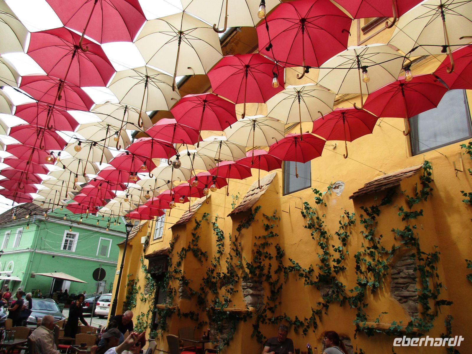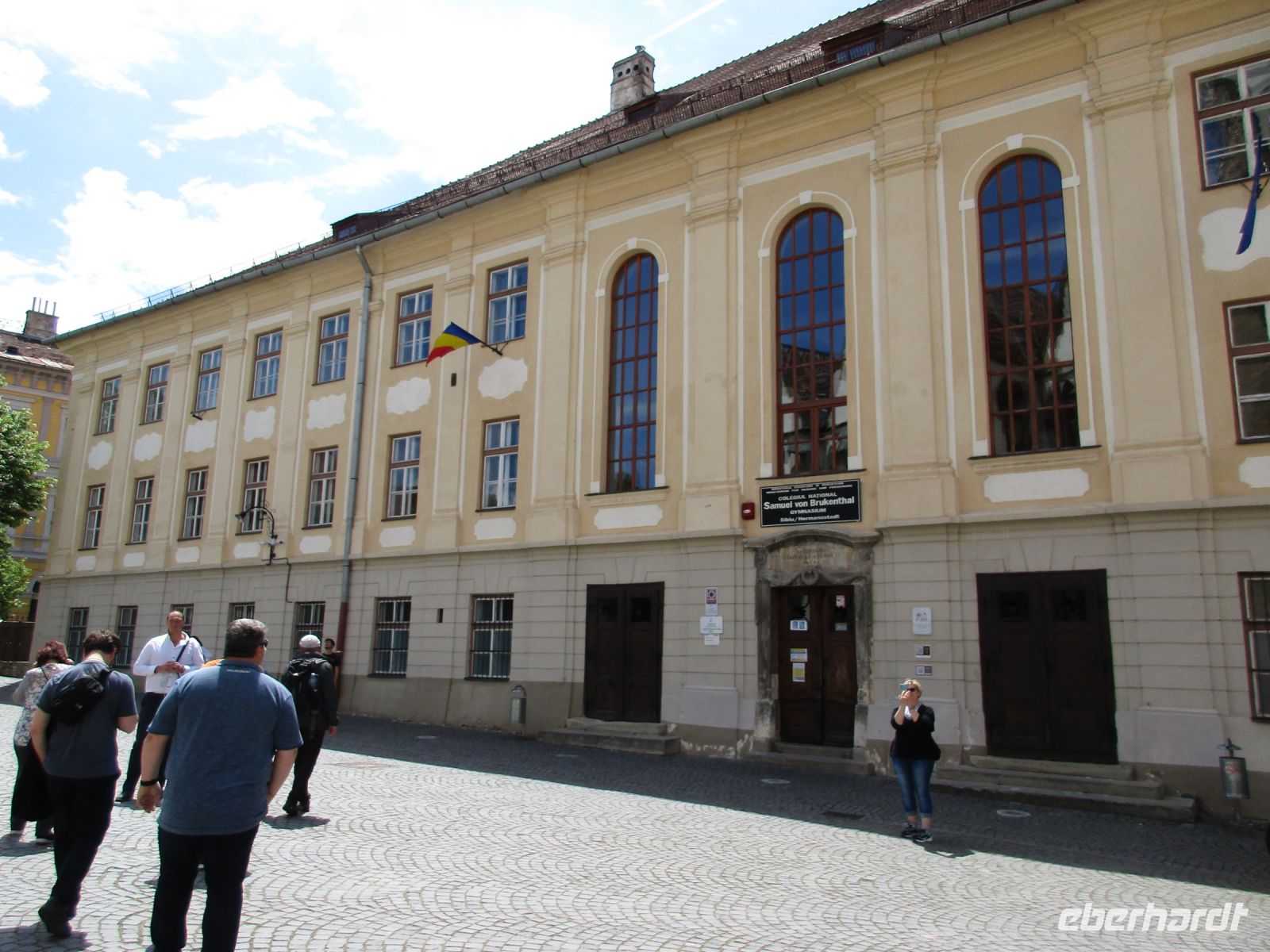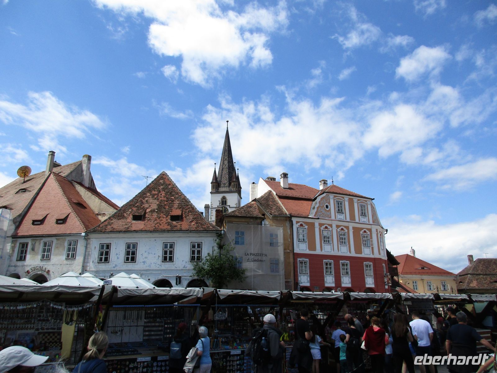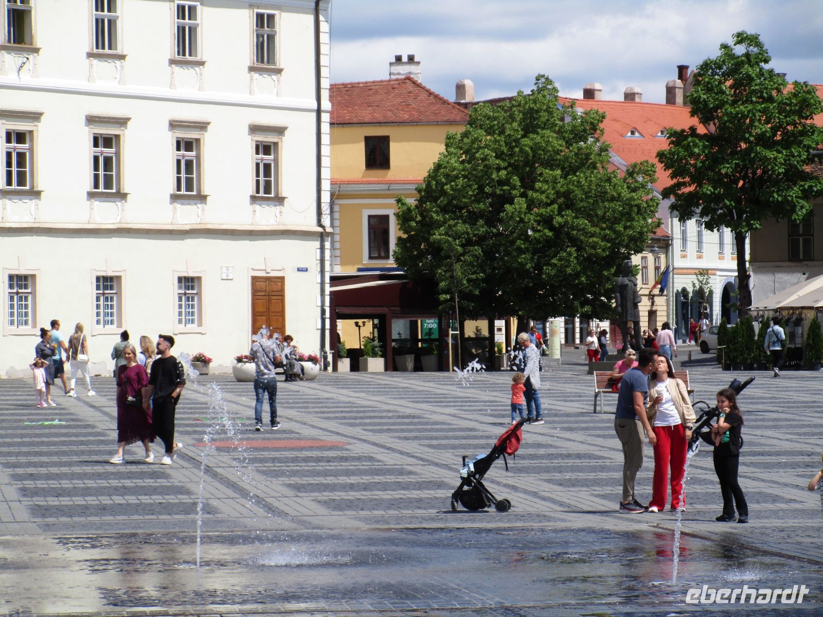 Am Frühstücksbüffet treffen wir uns alle bei bester Laune, denn wir freuen uns auf unsere heutige Tour nach Sibiu. Aus Hermannstadt stammt auch das Staatsoberhaupt Rumäniens, Präsident Klaus Johannes. Zusammen mit der Stadt Luxemburg war Sibiu 2007 Kulturhauptstadt Europas und hat sich seitdem prächtig gemausert. Die Architektur kommt uns bekannt vor. Nur die typischen Dächer mit den „Fledermausaugen“ sind hier ein besonderes Merkmal. Selbst Yadegar Asisi war fasziniert von ihnen, weil er sie als Elemente der mittelalterlichen Baukunst in seinem Luther-Panorama benötigte und abbildete. In Hermannstadt befindet sich das Zentrum der Siebenbürger Sachsen, sogar in der geografischen Mitte Rumäniens. Um ihre Stadt über dem Fluss Zibin wurden zwei Ringmauern gebaut, von denen nur noch Reste übrig sind. Der Ratturm ragt über die Oberstadt und die Lügenbrücke hat uns gut getragen! Zoltan hat den Test mit uns gemacht und wir haben bestanden! Die ersten deutschen Siedler im 12. Jhd. sollen aus Köln gekommen sein und die Stadt nach dem Erzbischof Hermann benannt haben. Belegt ist das nicht. Ein Großer dieser Stadt ist Freiherr Samuel von Brukenthal, der im 18. Jhd. Gouverneur von Siebenbürgen war und ein großer Förderer der Stadt. Im Brukenthal-Palais befindet sich heute das Brukenthal-Museum, das Gemälde aus Europa und viele andere Kunstschätze beherbergt. Leider war es heute geschlossen. So flanieren wir durch die hübsche Stadt, besuchen die orthodoxe Kirche der Dreifaltigkeit und sehen uns die Evangelische Stadtpfarrkirche an, vor der ein großes Denkmal von Bischoff Georg Daniel Teutsch steht. Das TeutschHaus ist heute eine Stätte der Begegnung und ein Kulturzentrum. Teutsch war Pfarrer und lange Zeit Lehrer und Direktor an der Bergschule in Schäßburg. Er war maßgeblich an der Schaffung einer neuen Kirchenordnung und einer Schulreform beteiligt. Wir genießen das Gewimmel auf den Straßen und Plätzen und sehen eine lebendige, blühende Stadt, die uns zum Verweilen in den hübschen Straßencafés und Restaurants einlädt. Wir treffen uns wieder an der Schiller-Buchhandlung, der selbst nie da war, aber sehr verehrt wird. Bei strahlendem Wetter fahren wir wieder zurück nach Predeal, wo uns der Spa-Bereich und ein opulentes Abendessen erwarten.